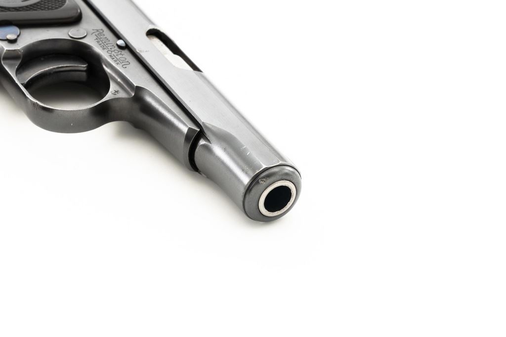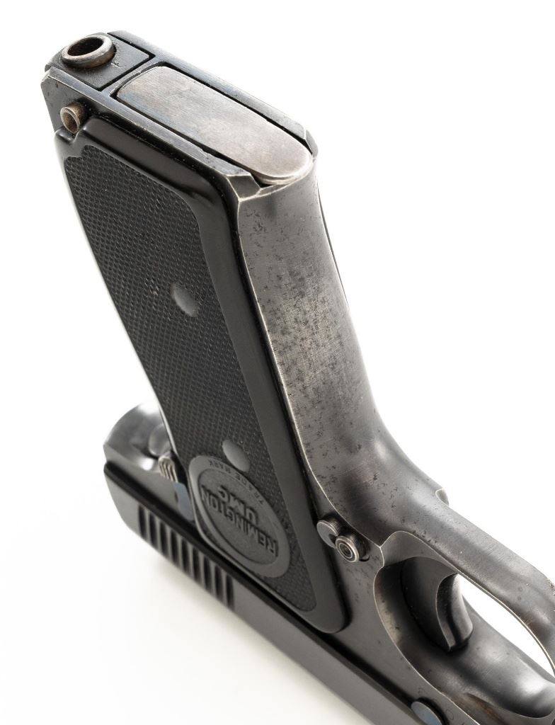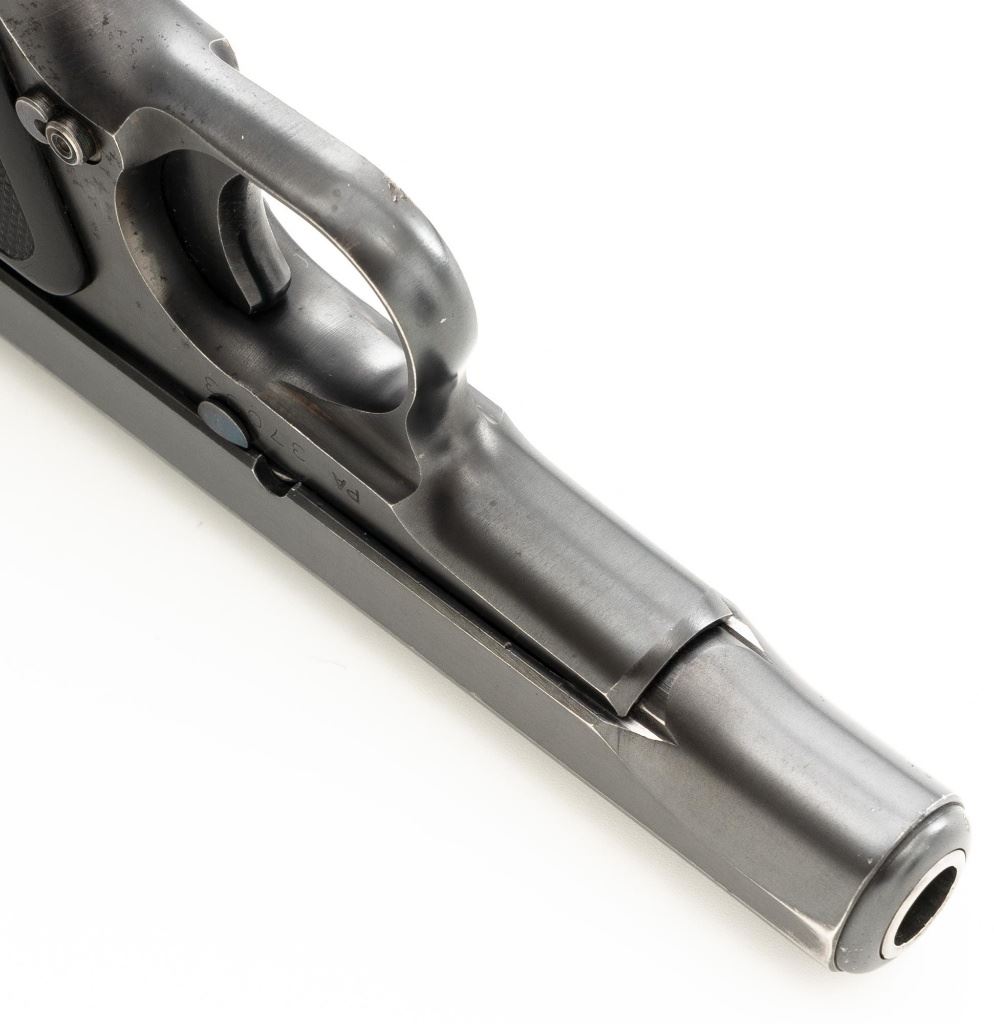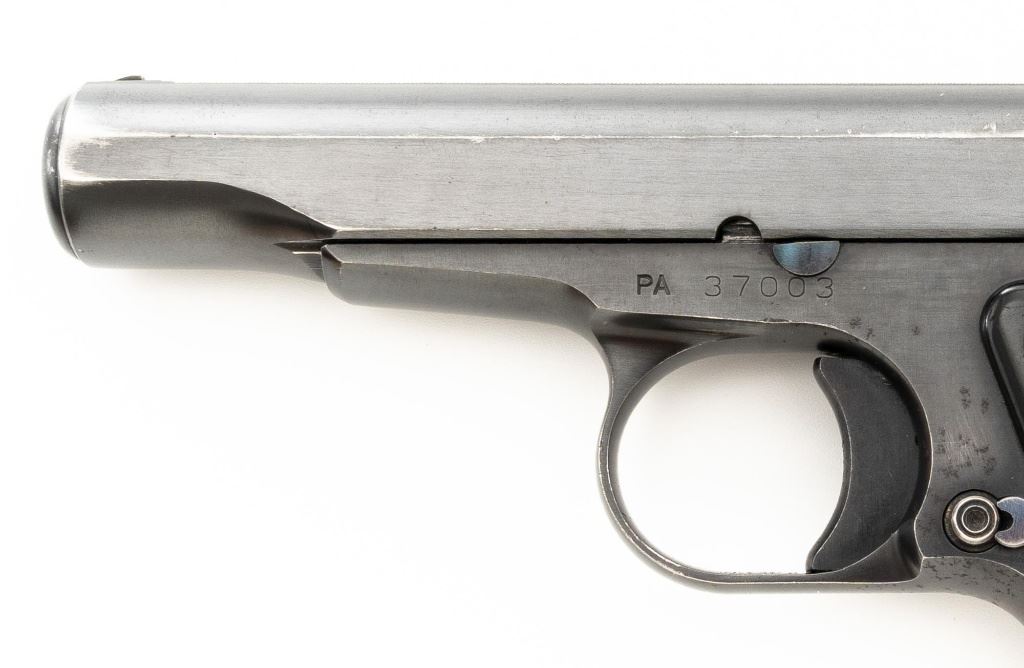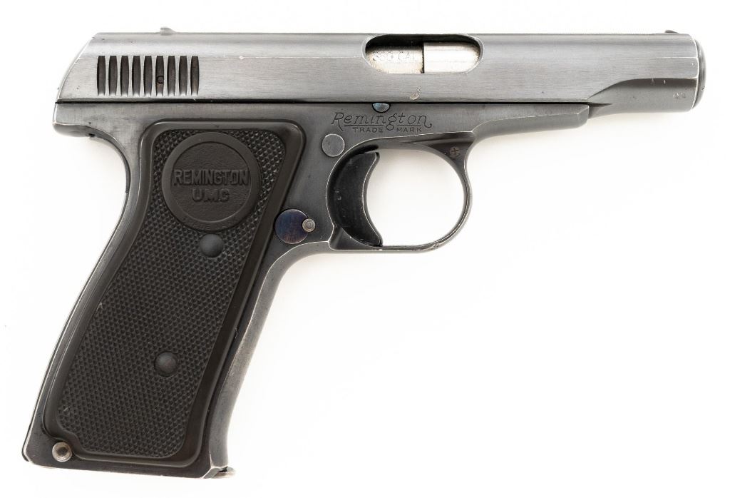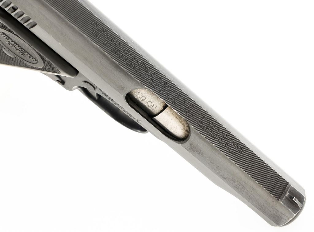 Remington Model 51 Semi-Automatic Pistol, #PA37003, .380 ACP cal., 3.25" barrel, blued finish, checkered black plastic grips embossed with "REMINGTON/UMC" logos on each side, low profile blade front sight, and fixed rear sight with square-notched groove. Includes one blued steel magazine, marked "380 CAL". Pistol is marked "THE REMINGTON ARMS UNION METALLIC CARTRIDGE CO.INC./REMINGTON ILION WKS.ILION.NY.U.S.A. PEDERSONS PATENTS PENDING" on top of the grooved slide, with "Remington/TRADE MARK" on right side of the frame. Condition overall is very good, retaining approx. 85%-87% blue, showing wear and scratches to left side of the slide, and toning to the grip straps. There is a dent to the slide below the ejection port. Grips are very good, showing normal light handling wear, particularly to the left side. Action operates smoothly. Bore is bright with very good, clearly defined rifling. Est.: $300-$500. (C&R/PPT)