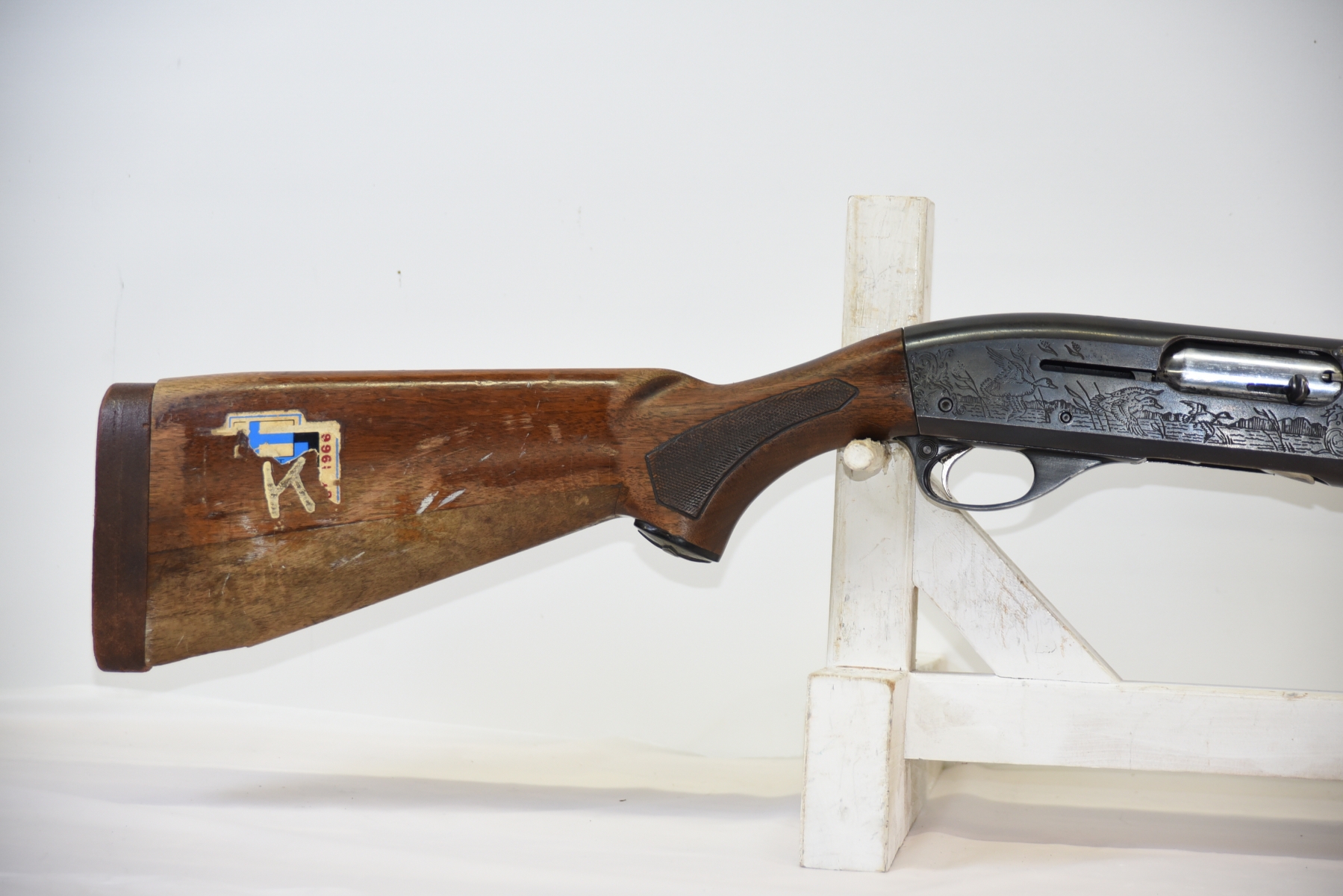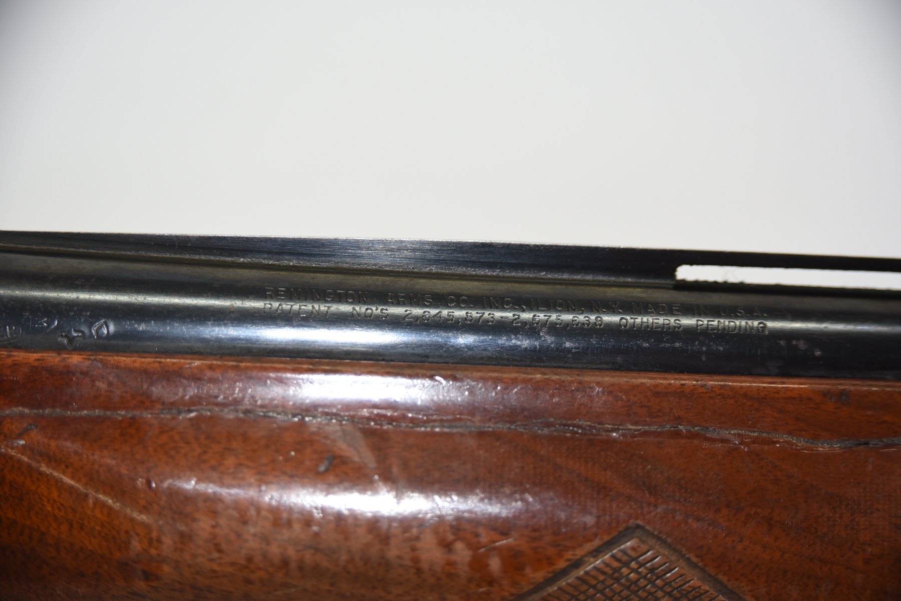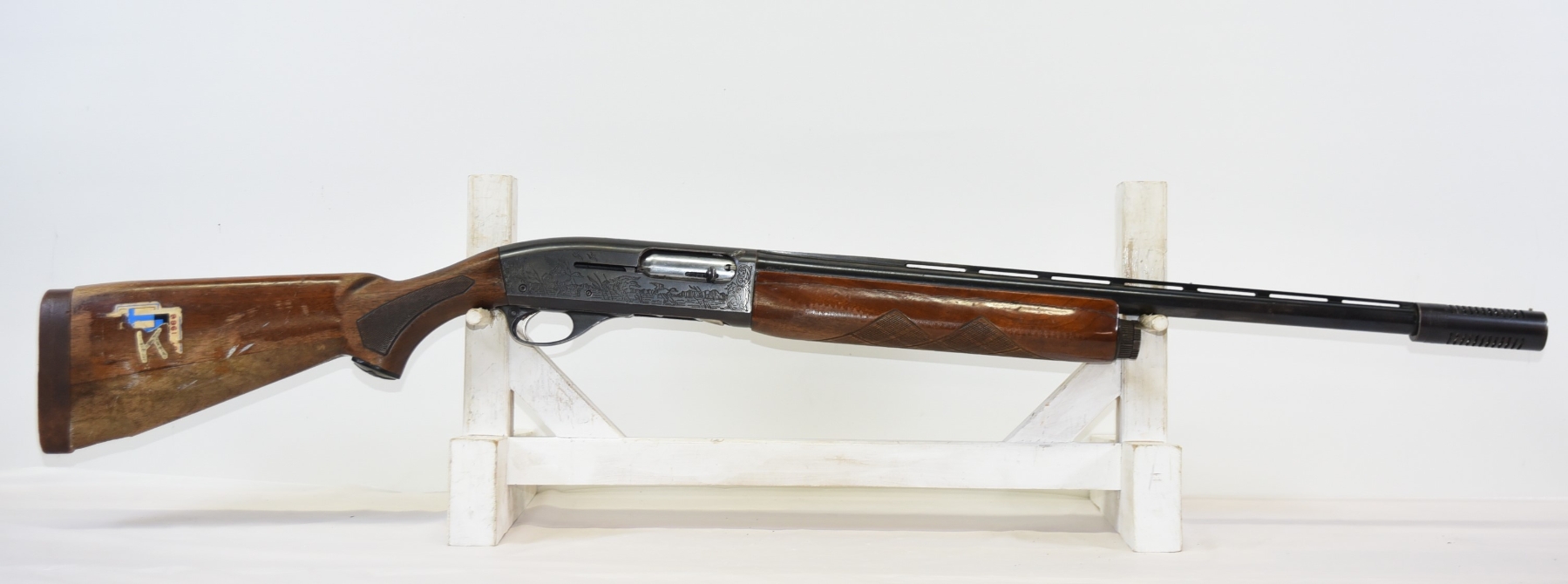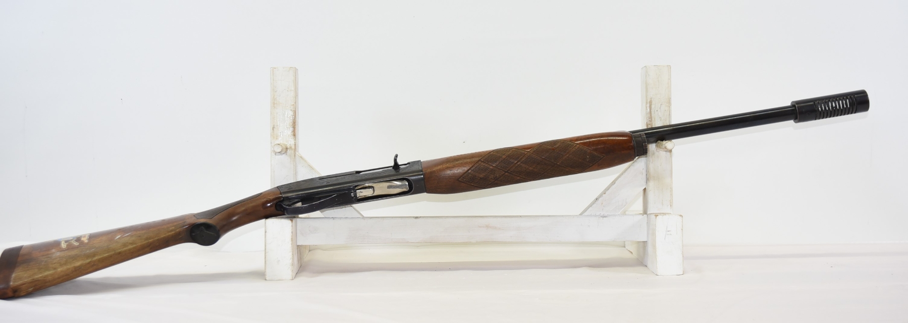Wood stock shows repairs, large crack in the forearm, rear stock shows repairs, scratches, scuffs, dents, finish wear; condition is poor.