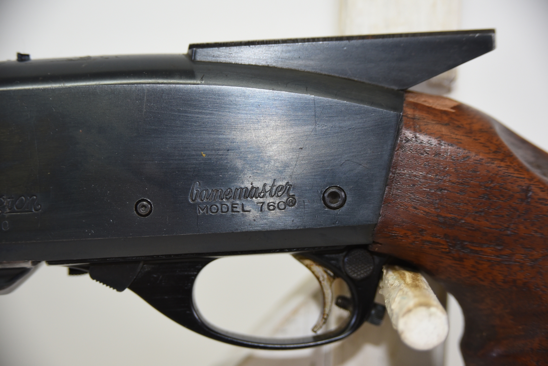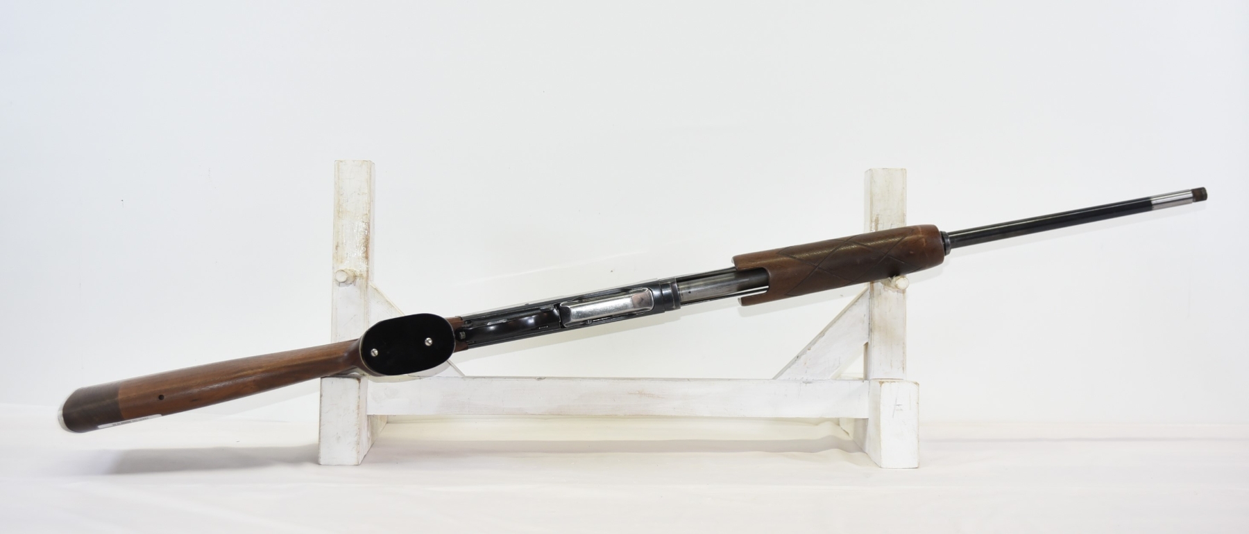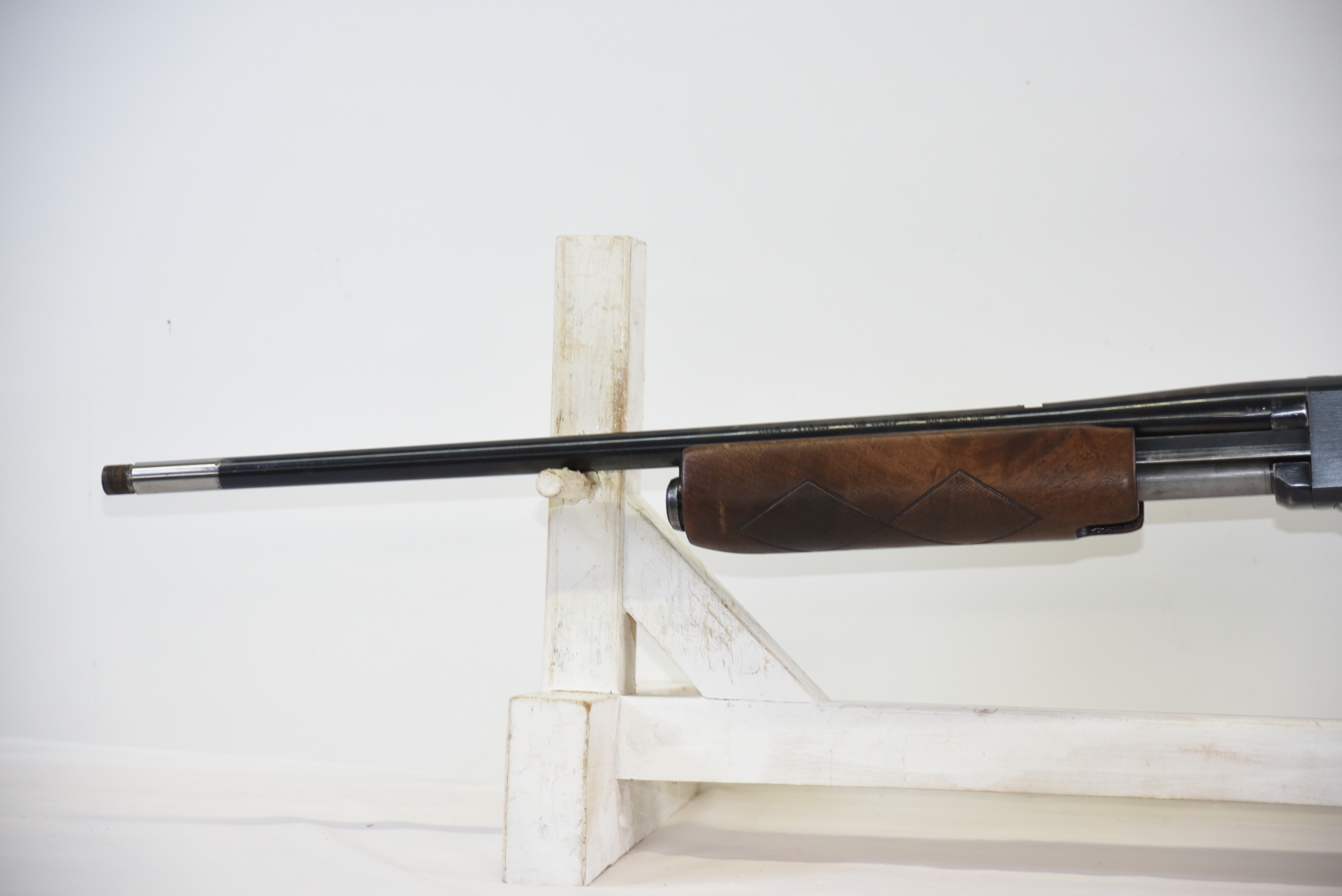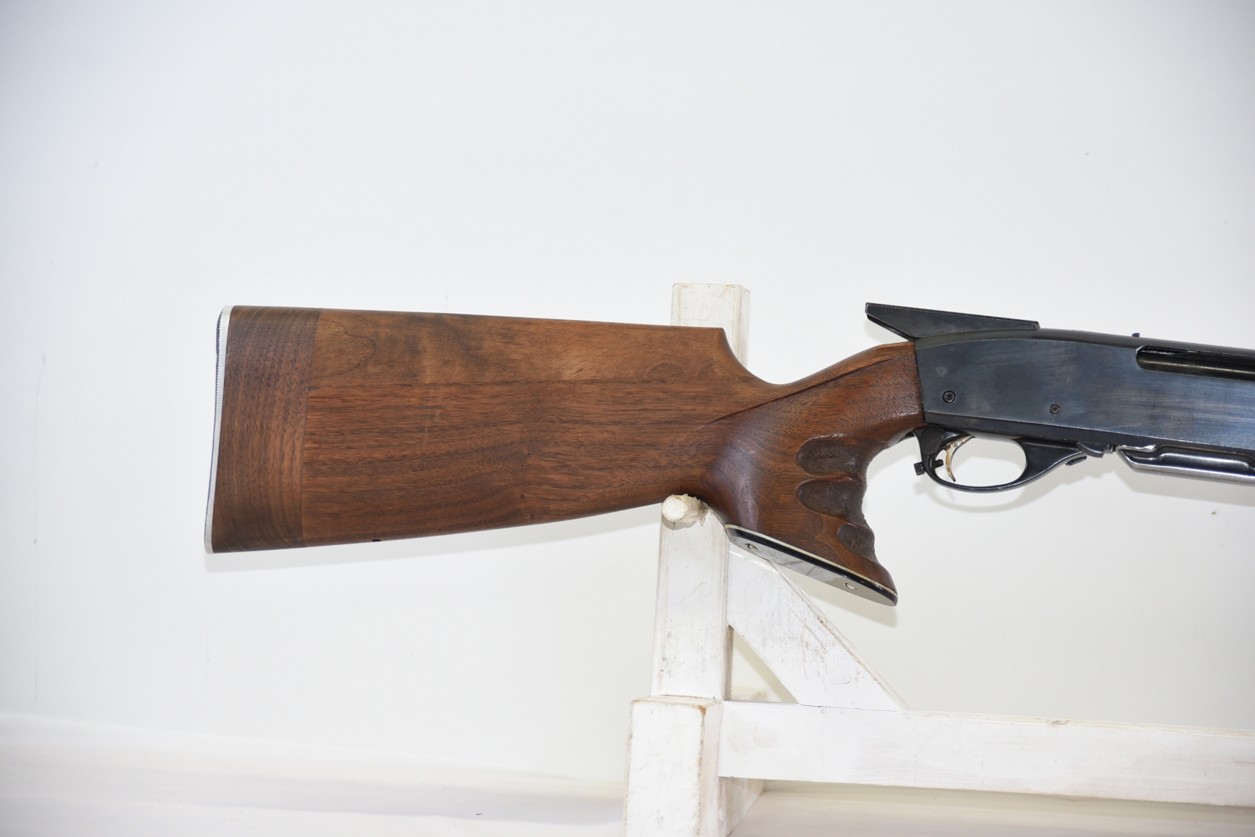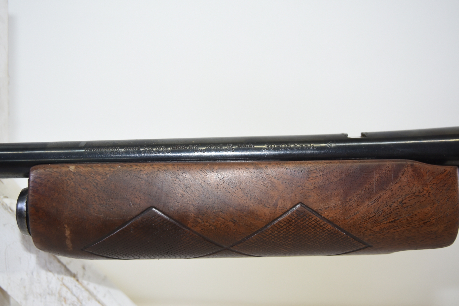 Wood stock shows lots of modifications to the rear stock, there is a large chip in the upper part of grip area, there are few light scratches, scuffs; condition is less than fair.