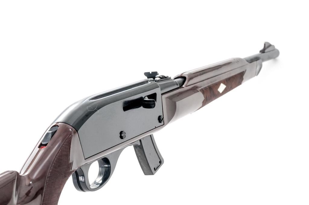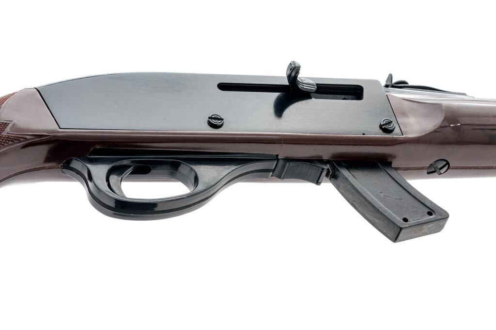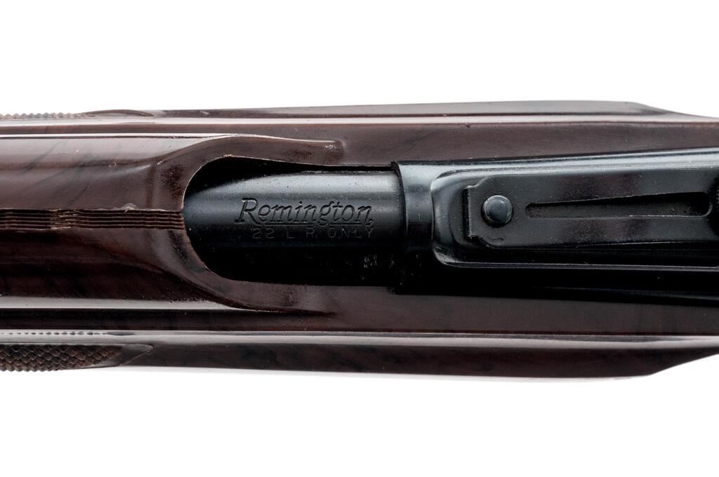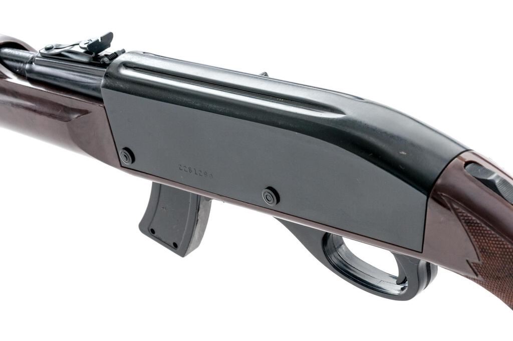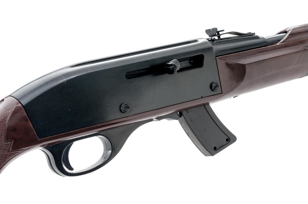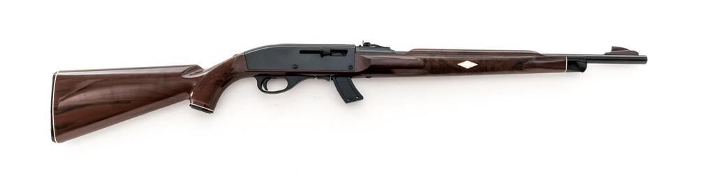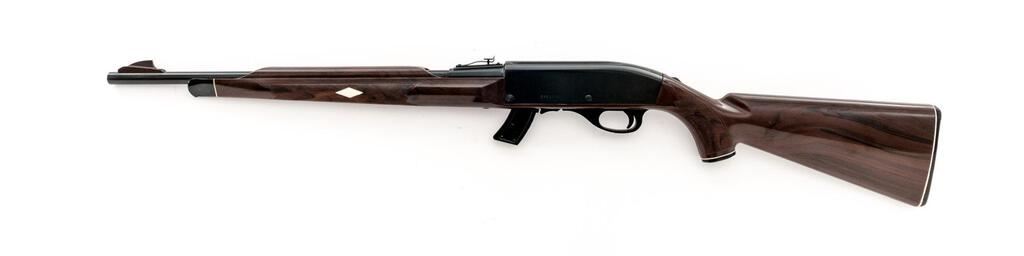Remington Mohawk 10-C Semi-Automatic Rifle, #2281290, .22 LR cal., 19.5" barrel, ramped blade front and square notch adjustable rear sights, blue finish, checkered Zytel pistol grip stock, 10-rd. detachable magazine. Mfg'd in 1972. Rifle is in near excellent overall condition with light handling marks and a dot of white paint on the front sight. The Mohawk brown checkered Zytel stock is very good with light scratches and marks consistent with field use. Action functions well, bore is very good with crisp rifling. A later variation on the Nylon 66 and Nylon 77 rifles, the Mohawk 10-C was produced only from 1971-1978. Est.: $200-$400. (C&R)