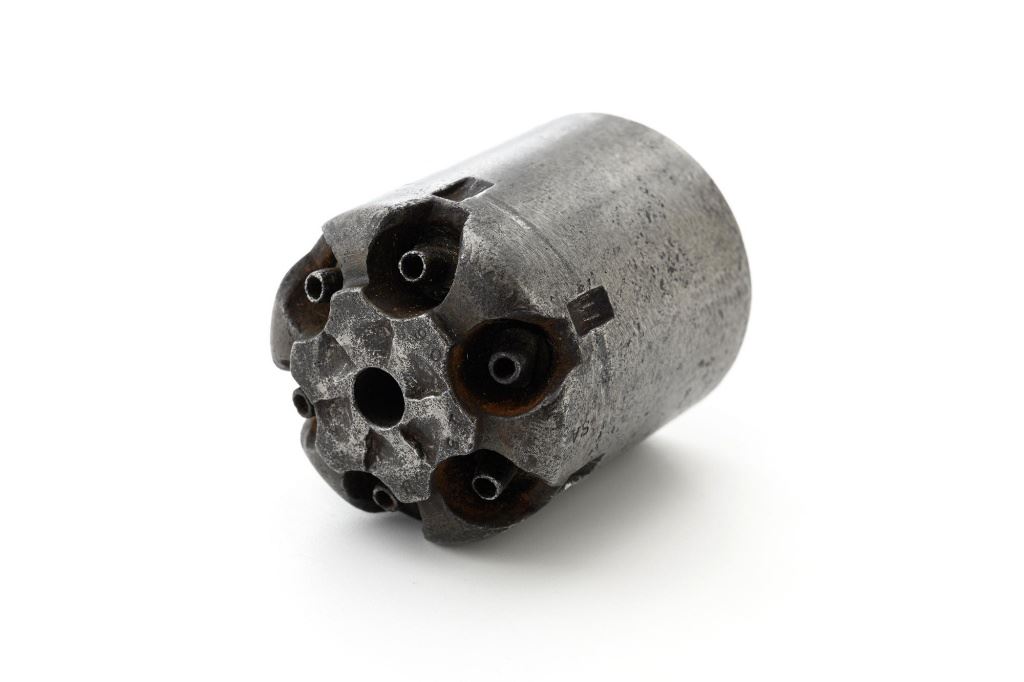 Remington New Model Army Cartridge Conversion 5-Shot Single Action Revolver, with extra percussion cylinder, #98317,.46 RF cal., 8" octagon barrel, gray patina, brass trigger guard, smooth walnut two-piece grips, "pinched" blade front sight, fixed "V"-notch rear sight. Lower left grip panel with "OWA" cartouche. Inspector proofs "W" on rear left frame flat, "R" on left flat of frame at breech, "D" on left rear flat of barrel, "R" on right barrel flat at frame and also on right frame flat. Top of barrel is marked in three-lines "PATENTED SEPT. 14, 1858/E. REMINGTON & SONS, ILION NEW YORK. U.S.A./NEW MODEL". Matching visible numbers on left side of the grip frame, underside of barrel, and cylinder face. Includes a .44 caliber percussion cylinder, numbered "9013". Revolver is in good condition, displaying a pleasing gray and brown patina to the metal surfaces, with traces of blue finish to the cylinder, scattered mild etching, and handling marks. Factory markings are clear. Percussion cylinder is mostly gray with light rust visible around the nipples and in the chambers, with mild pinprick pitting. Grips are good with scattered old mars and scratches, with a few spots of dark oil staining, cartouche is clear. Action is crisp and cycles smoothly. Bore is primarily bright, with some areas of light erosion, rifling is clearly defined and good overall. Est.: $1,200-$1,800. (Antique) (Michael Strietbeck Collection)