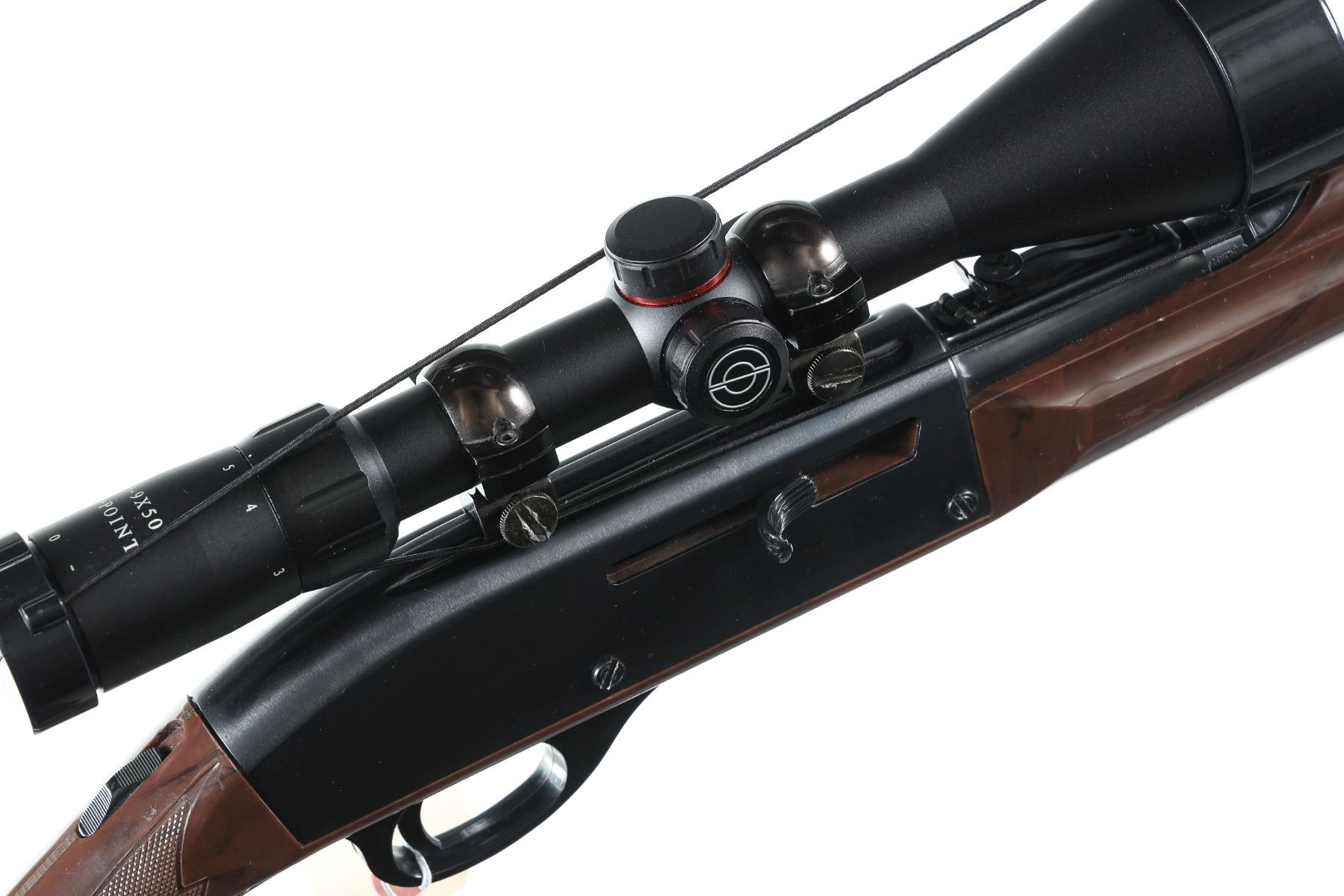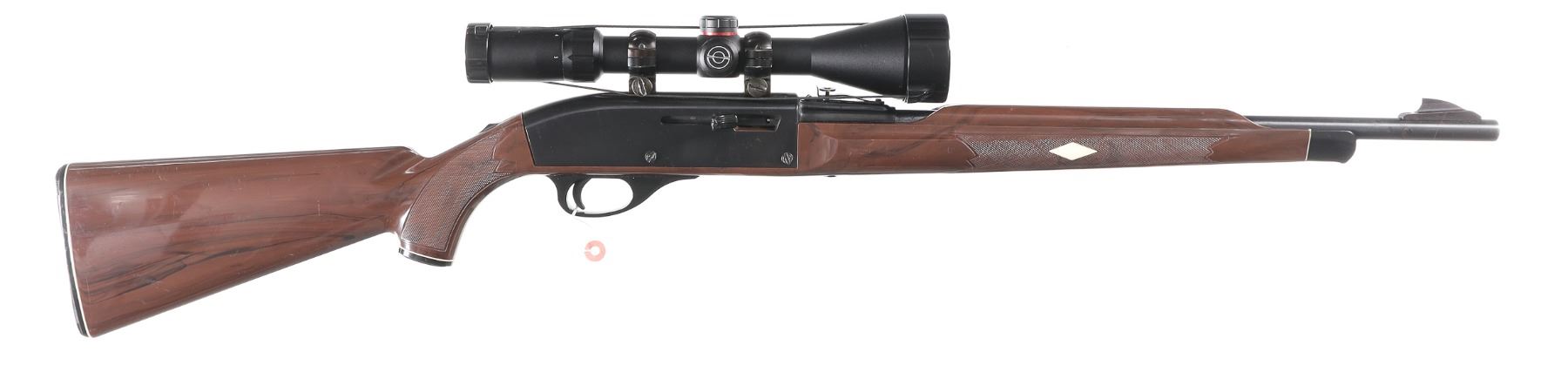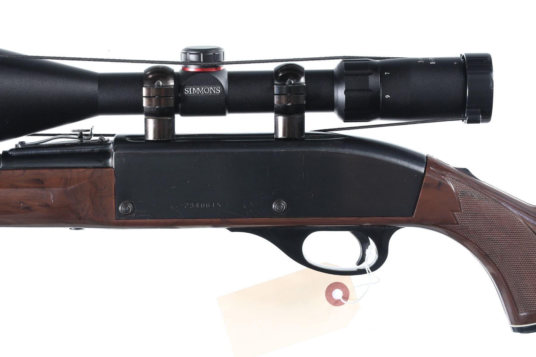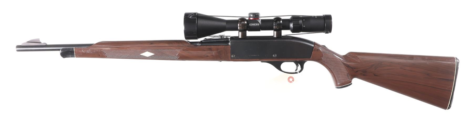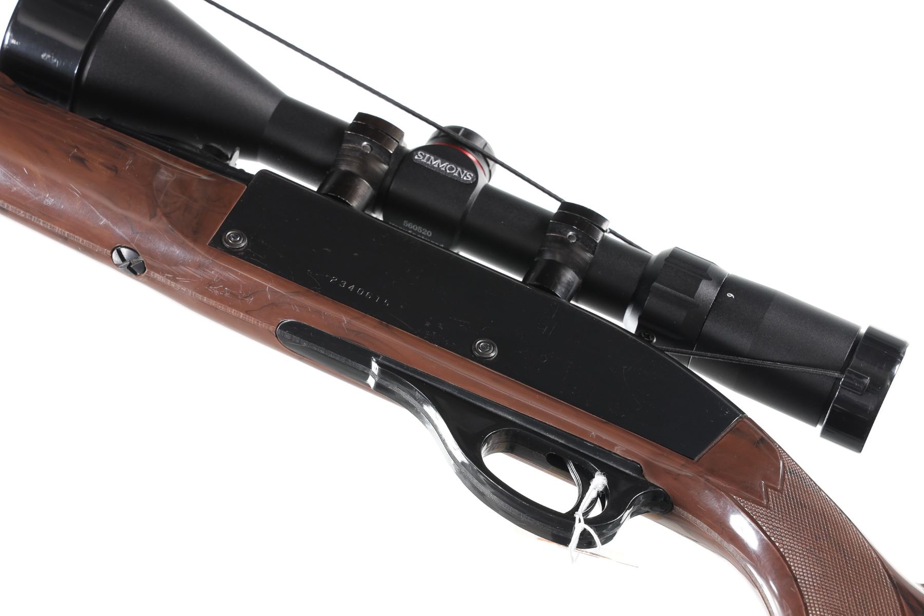 .22 lr Serial # 2340615 Remington Model Nylon 66 22 Long rifle semi automatic with Mohawk Brown stocks. Blue finished with serial number on left side and tube fed magazine at butt. Simmons 3-9x50 scoped. Condition. Metal retains over 98% blue with a small scratch on left side if receiver. Bore is bright and mechanically fine. Optics are clear. Barrel 20" Modern