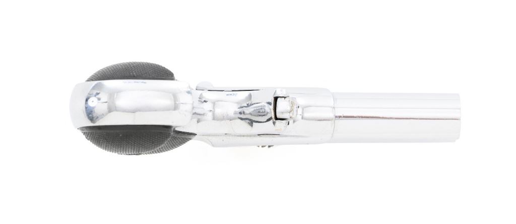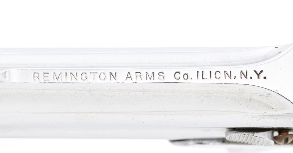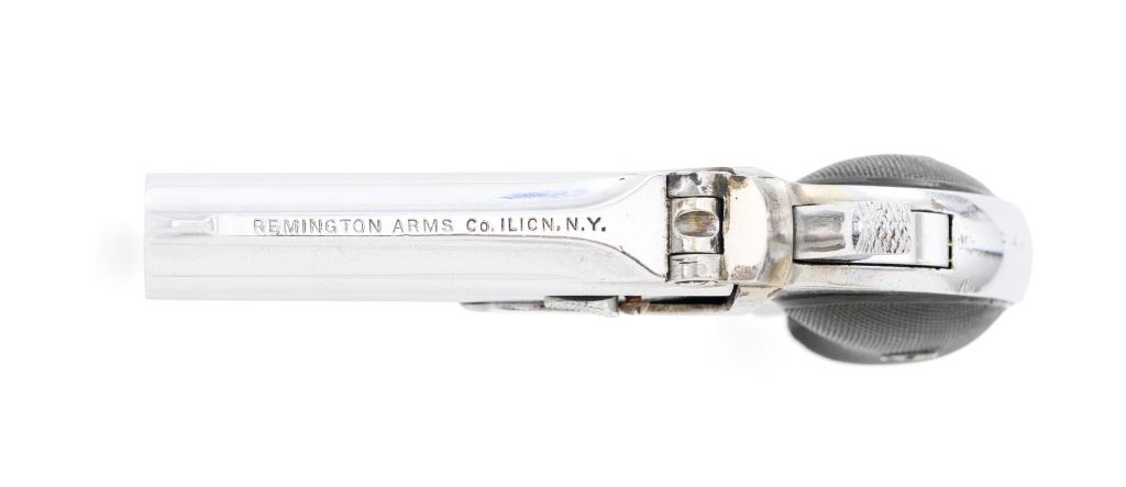 Remington Over/Under Type II Model No. 3 Double Derringer, #635, .41 RF Short cal., 3" barrels, re-nickeled finish, checkered two-piece black hard rubber grips, integral fixed blade front sight, and notched rear sight channel. Top of the barrel is marked "REMINGTON ARMS CO. ILION, N.Y." Matching number on left side of the grip frame and underside of the barrel. Mfgd circa early-1890s. In good condition as refinished, displaying approx. 93%-95% of its heavily re-nickeled finish, applied over some minor surface imperfections, with losses primarily around top of the frame and hinges, with have a brazed repair. Grips are fine, with minor handling marks. Barrel address is still sharp. Action is crisp. There is a little mild pitting in the bore, rifling is good. Est.: $300-$500. (Antique) (Michael Strietbeck Collection)