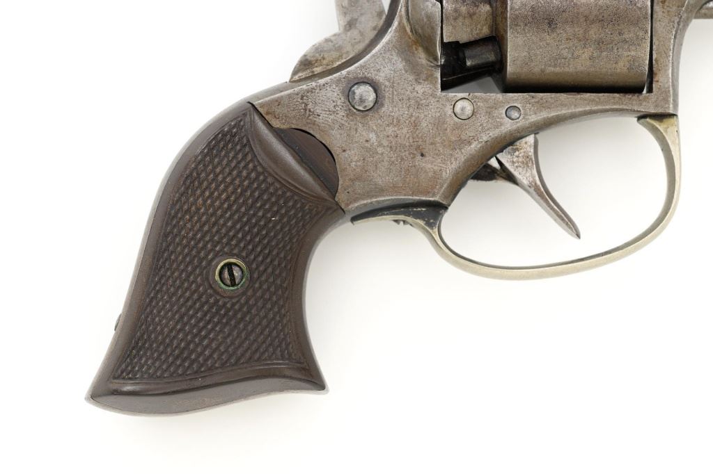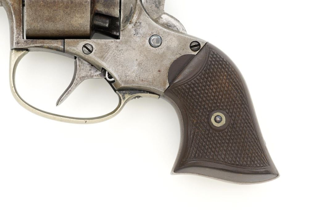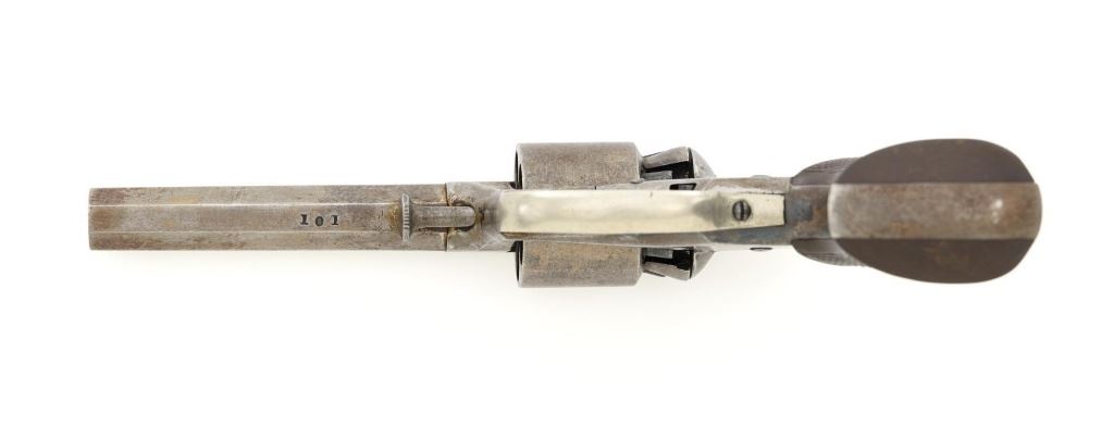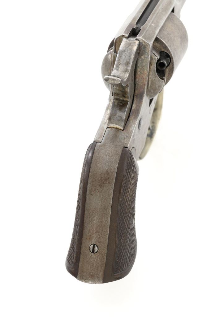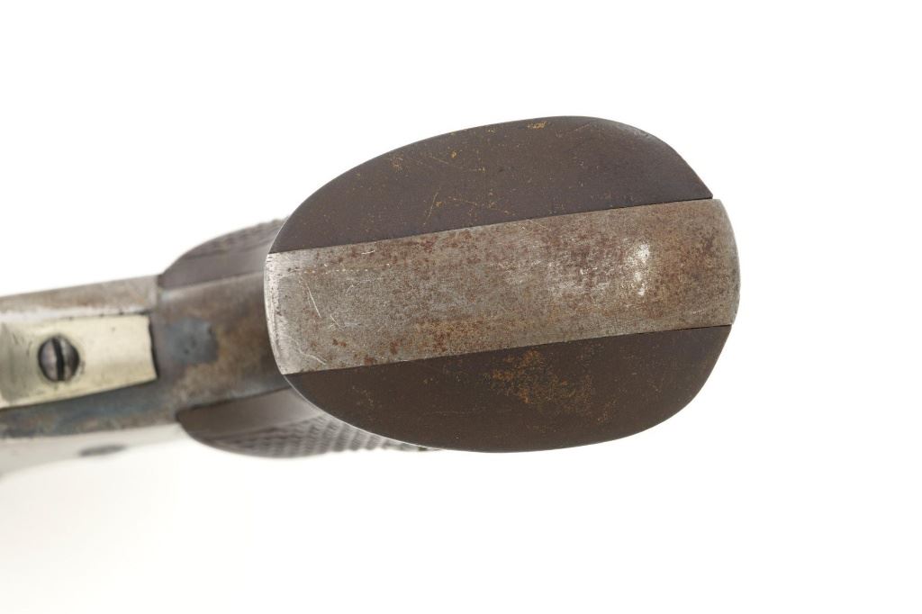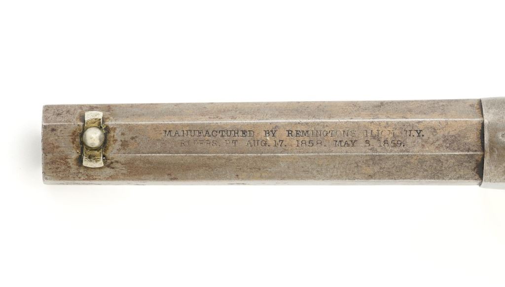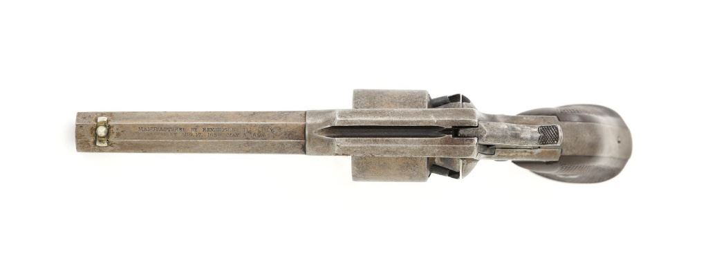 Remington-Rider Double Action Pocket Revolver, #101, .31 cal., 3" octagon barrel, gray patina, checkered two-piece brown hard rubber grips, small cone front sight, and fixed "V"-notched rear sight. Top of the barrel is marked in two-lines "MANUFACTURED BY REMINGTONS ILION, N.Y./RIDERS PT. AUG. 17, 1858 MAY 3, 1859". Matching numbers on left side of the grip frame and underside of the barrel. Approx. 2,000 were manufactured circa 1860-1873. Metal surfaces are good, now smooth gray metal mixed with cloudy light brown patina, and a few areas of mild pitting. Barrel address is legible. Grips are near excellent. Action is crisp. Bore shows intermittent mild erosion; rifling is very good. The Remington-Rider was one of the first double action revolvers produced in large scale in the United States. Est.: $400-$600. (Antique) (Michael Strietbeck Collection)