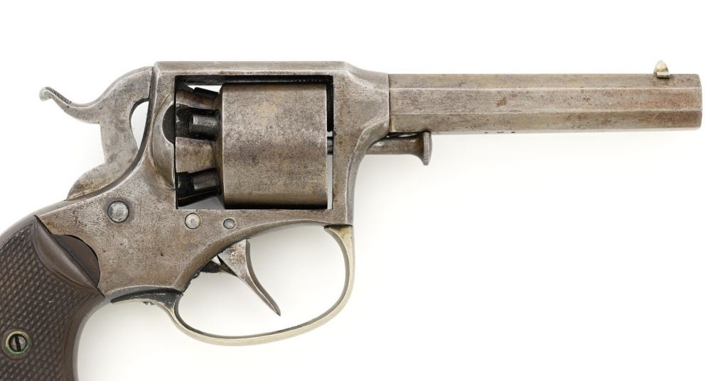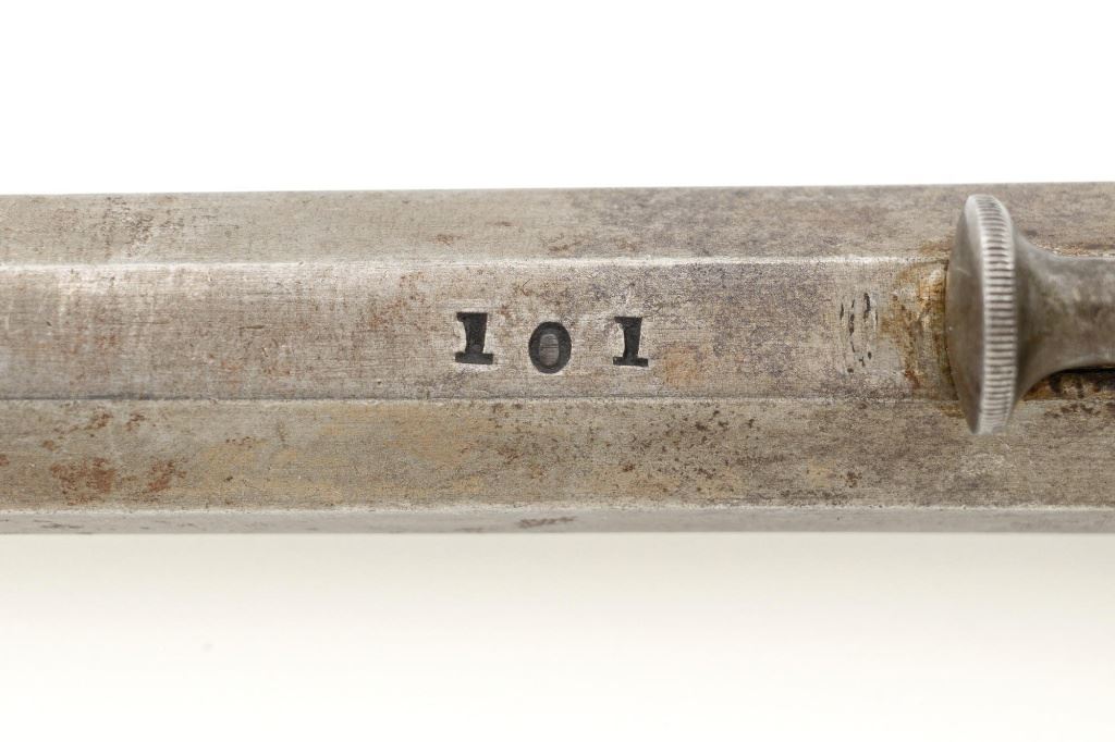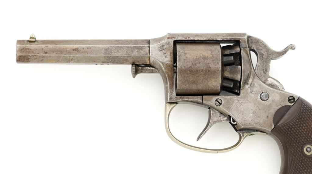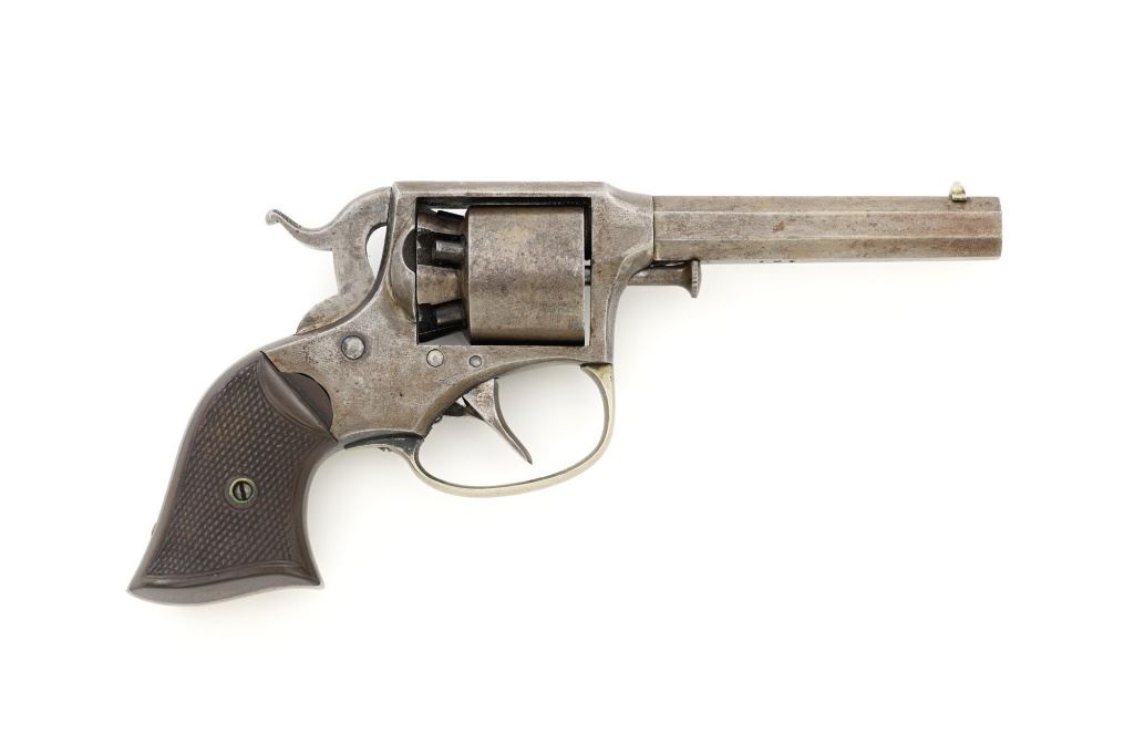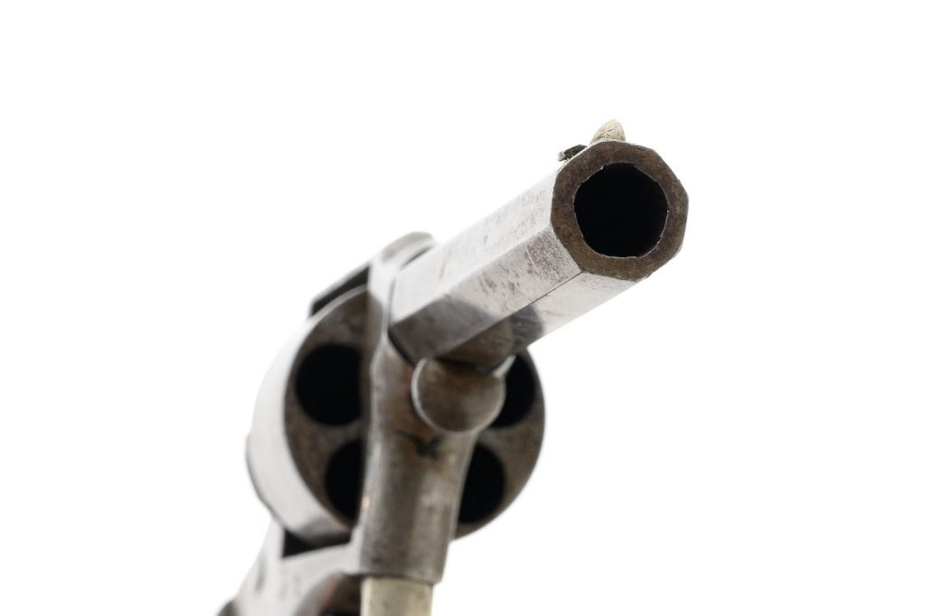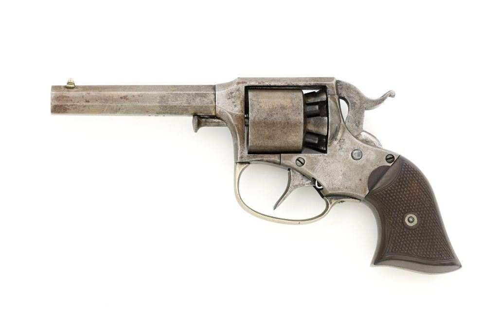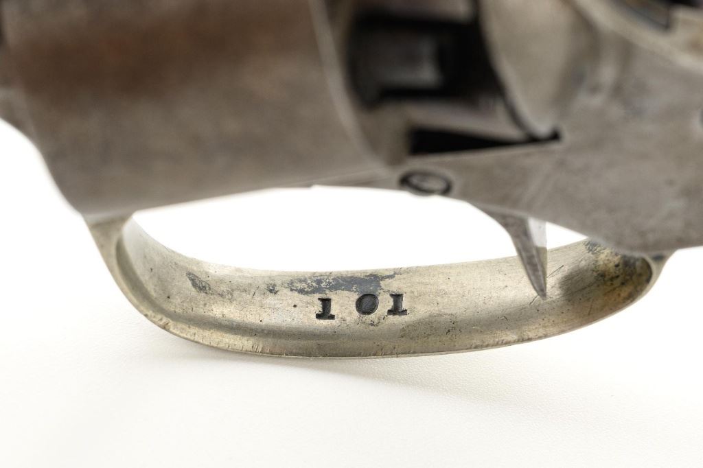 Remington-Rider Double Action Pocket Revolver, #101, .31 cal., 3" octagon barrel, gray patina, checkered two-piece brown hard rubber grips, small cone front sight, and fixed "V"-notched rear sight. Top of the barrel is marked in two-lines "MANUFACTURED BY REMINGTONS ILION, N.Y./RIDERS PT. AUG. 17, 1858 MAY 3, 1859". Matching numbers on left side of the grip frame and underside of the barrel. Approx. 2,000 were manufactured circa 1860-1873. Metal surfaces are good, now smooth gray metal mixed with cloudy light brown patina, and a few areas of mild pitting. Barrel address is legible. Grips are near excellent. Action is crisp. Bore shows intermittent mild erosion; rifling is very good. The Remington-Rider was one of the first double action revolvers produced in large scale in the United States. Est.: $400-$600. (Antique) (Michael Strietbeck Collection)