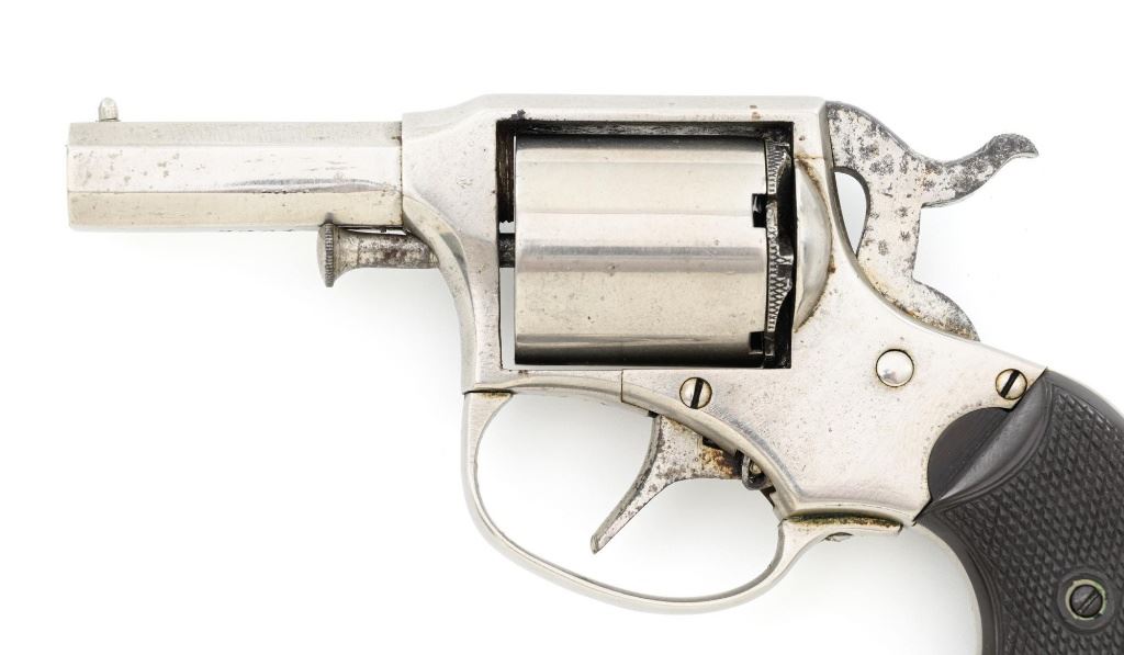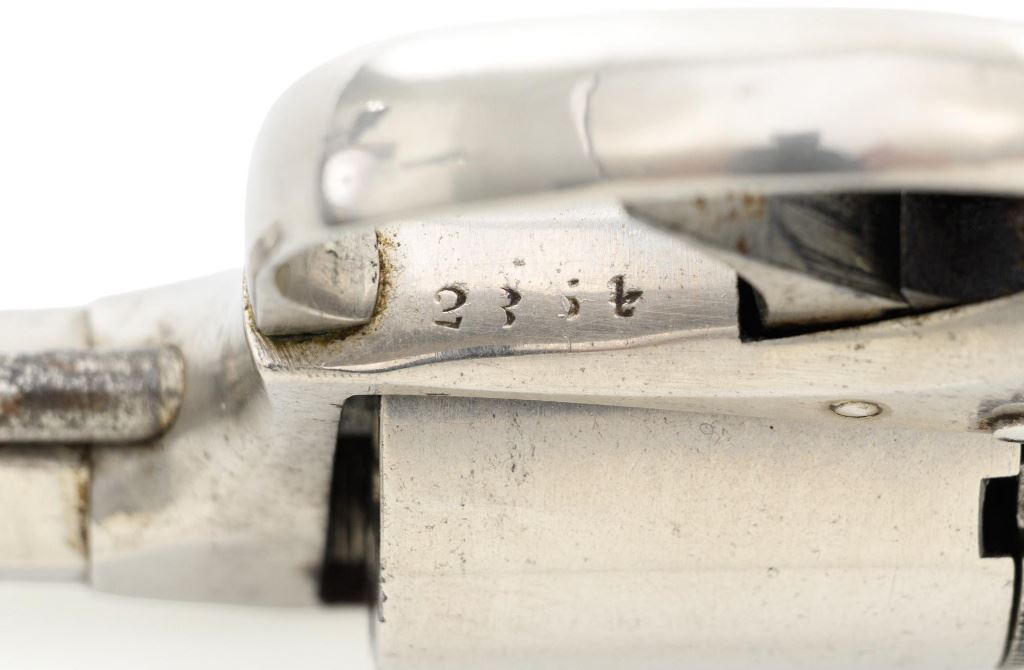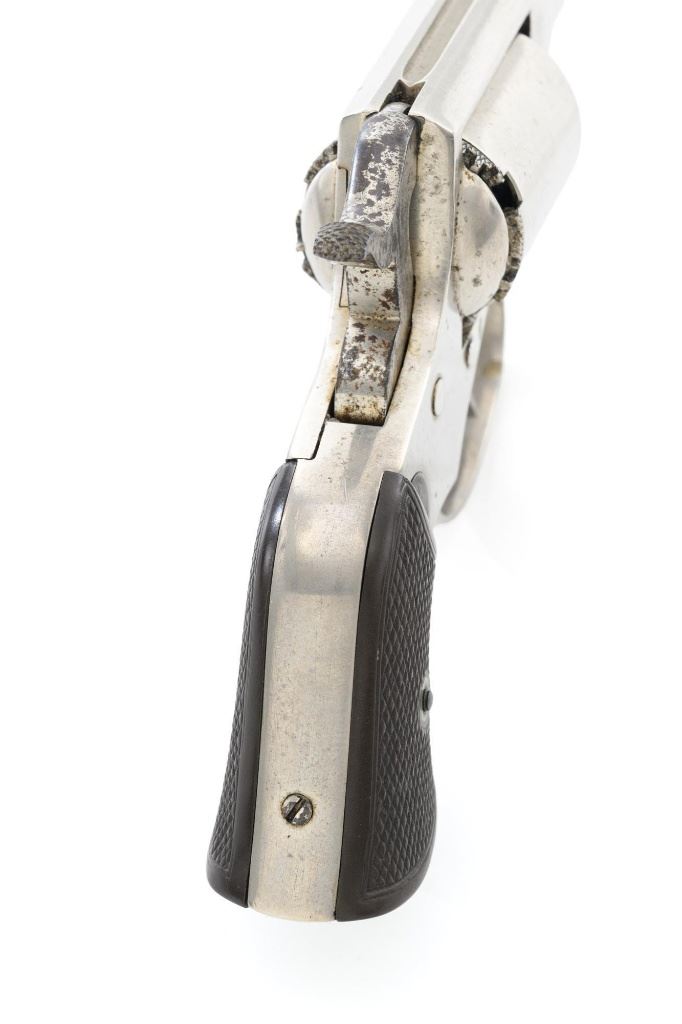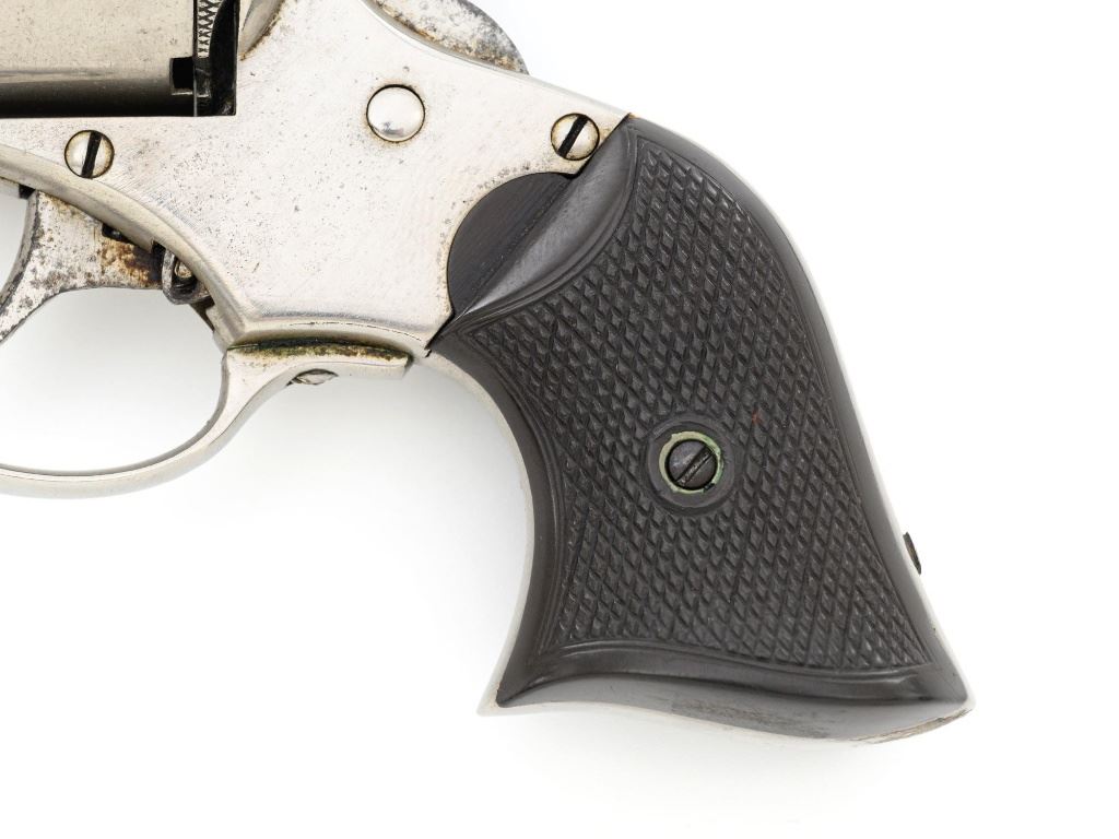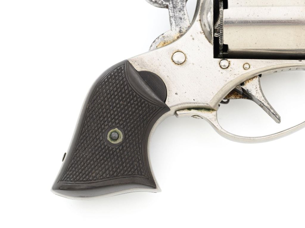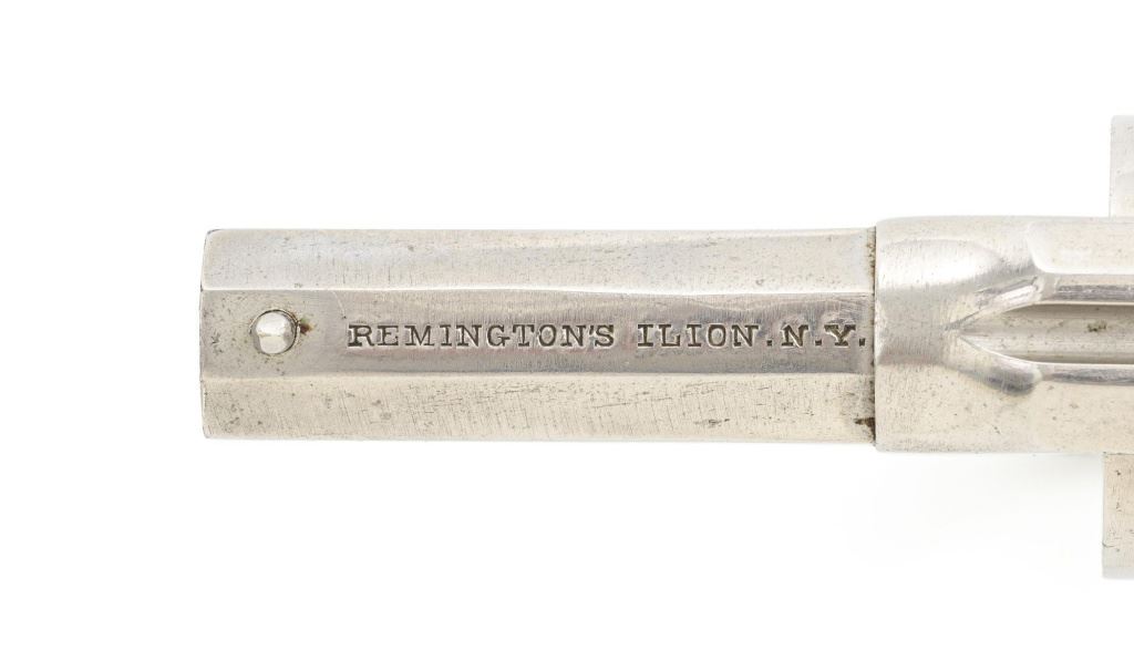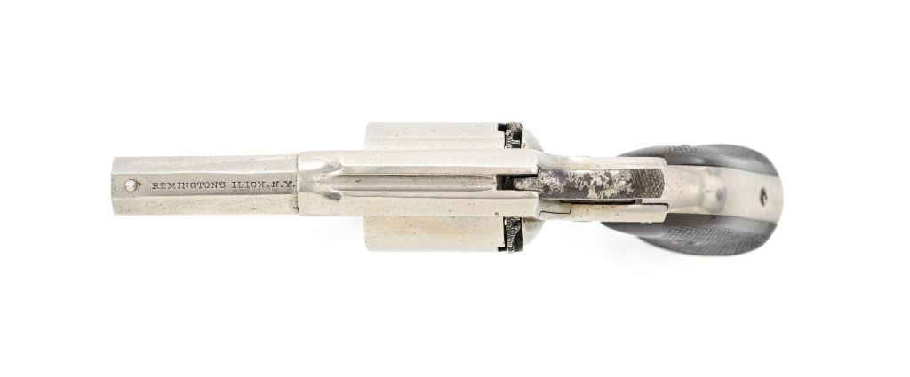 Remington-Rider Metallic Cartridge Conversion Pocket Model Revolver, #2354, .32 Short RF cal., 2" octagon barrel, nickel finish, checkered two-piece hard rubber grips, fixed silver dot front sight, and "V"-notched groove in the top strap. Visible matching numbers inside the trigger bow and underside of the barrel. Back of the cylinder and cylinder cover are marked "1277". Top of the barrel is marked in one line "REMINGTONS ILION, N.Y." Revolver is in overall fine condition, displaying a significant amount of the bright nickel finish, showing specks of lightly cleaned pitting on both sides of the frame, spots of darkening to sides of the hammer and trigger. Barrel address is crisp. Grips are excellent. Action crisp. Bore with clearly defined rifling and scattered moderate erosion. Est.: $700-$900. (Antique) (Michael Strietbeck Collection)
