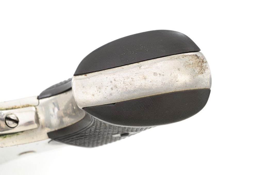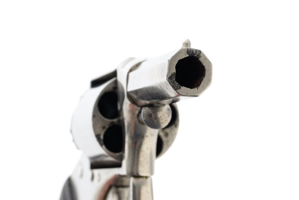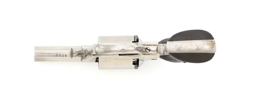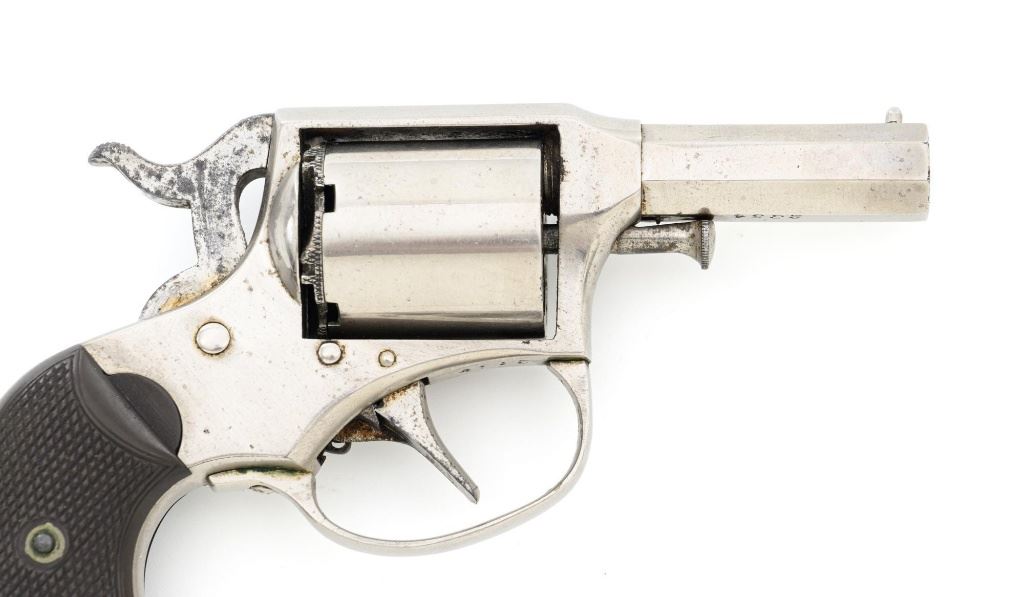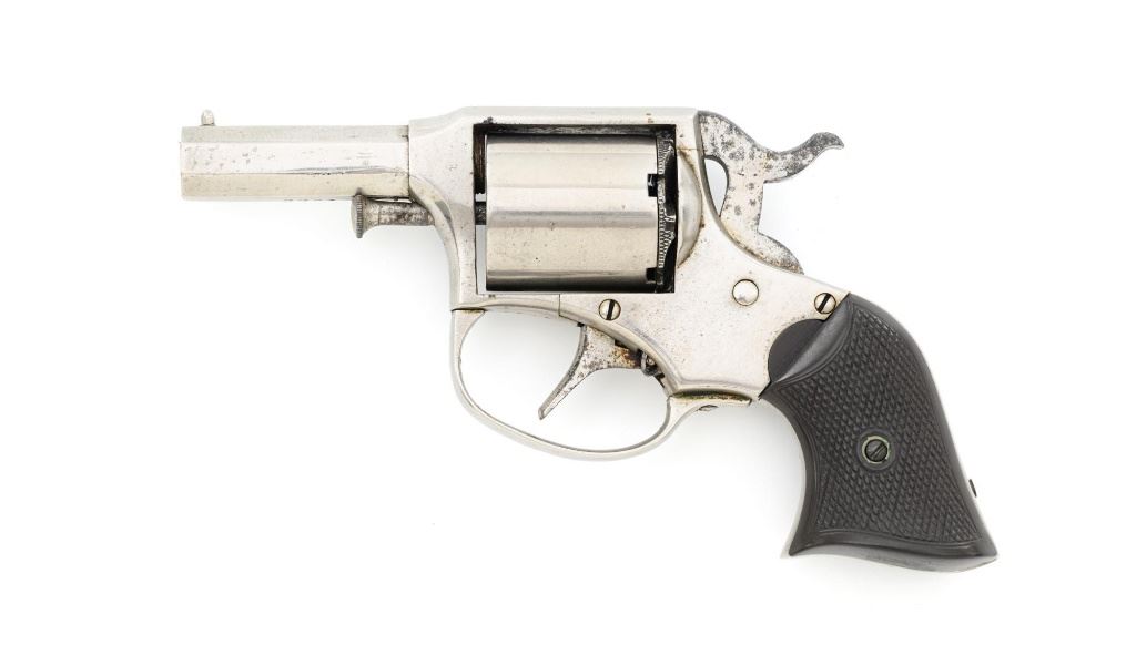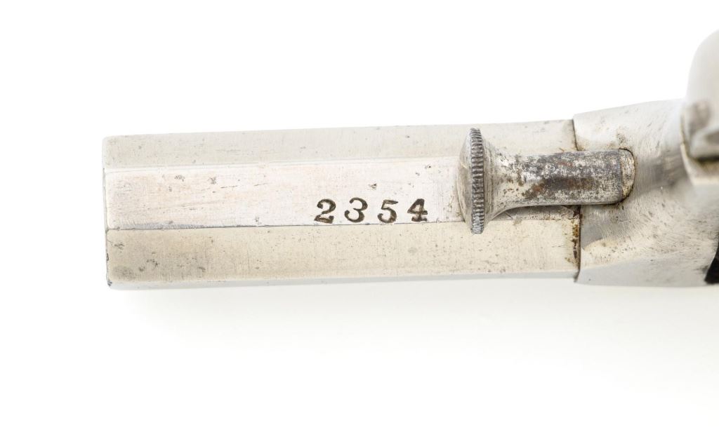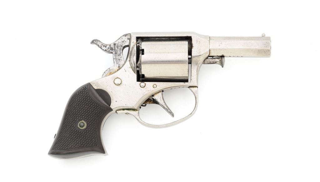 Remington-Rider Metallic Cartridge Conversion Pocket Model Revolver, #2354, .32 Short RF cal., 2" octagon barrel, nickel finish, checkered two-piece hard rubber grips, fixed silver dot front sight, and "V"-notched groove in the top strap. Visible matching numbers inside the trigger bow and underside of the barrel. Back of the cylinder and cylinder cover are marked "1277". Top of the barrel is marked in one line "REMINGTONS ILION, N.Y." Revolver is in overall fine condition, displaying a significant amount of the bright nickel finish, showing specks of lightly cleaned pitting on both sides of the frame, spots of darkening to sides of the hammer and trigger. Barrel address is crisp. Grips are excellent. Action crisp. Bore with clearly defined rifling and scattered moderate erosion. Est.: $700-$900. (Antique) (Michael Strietbeck Collection)