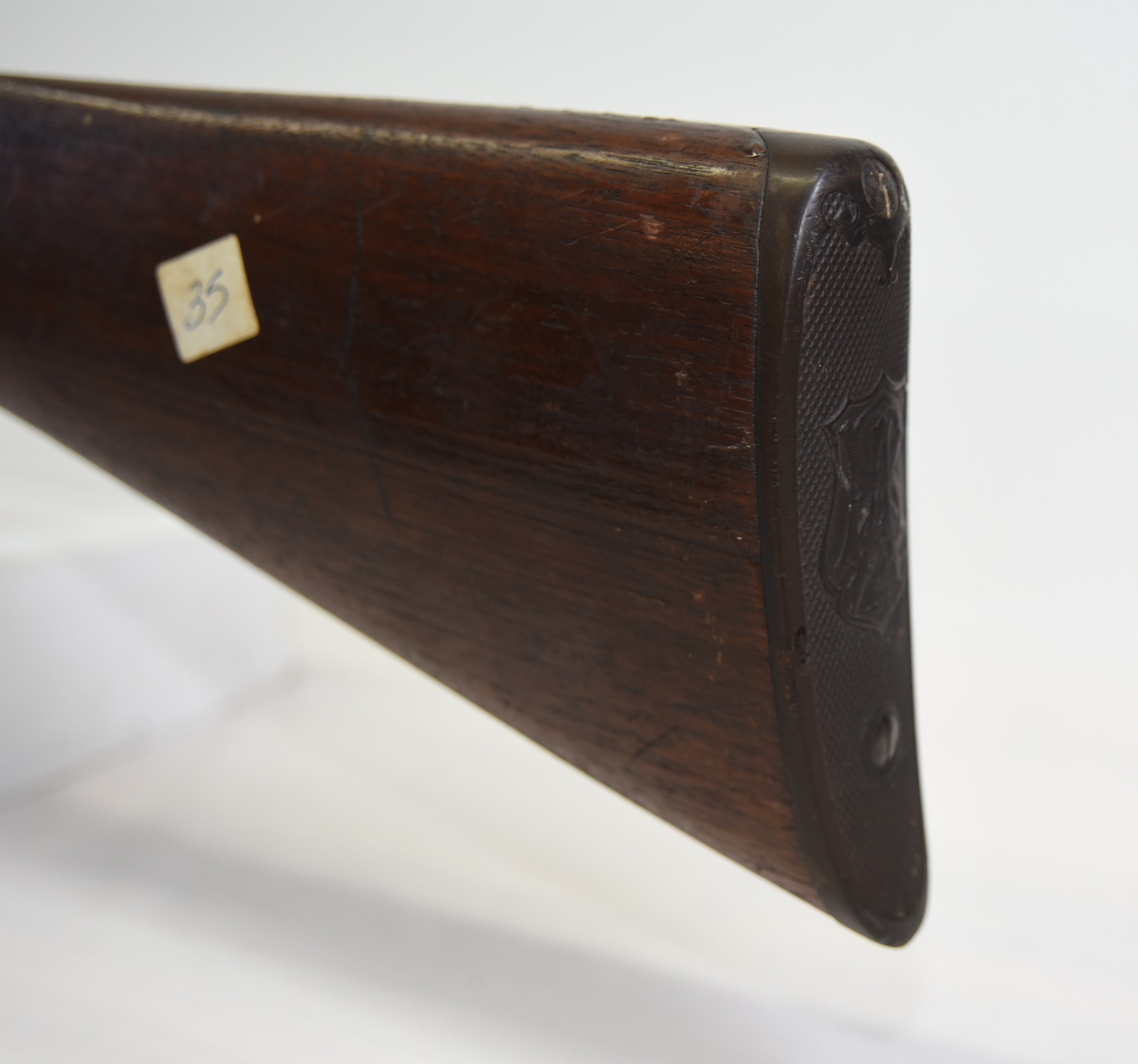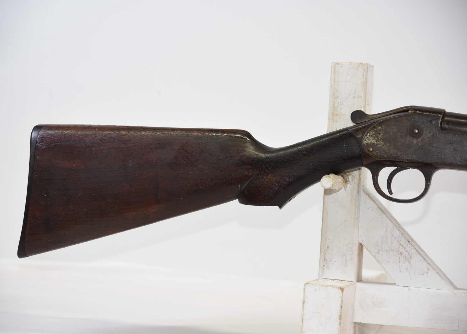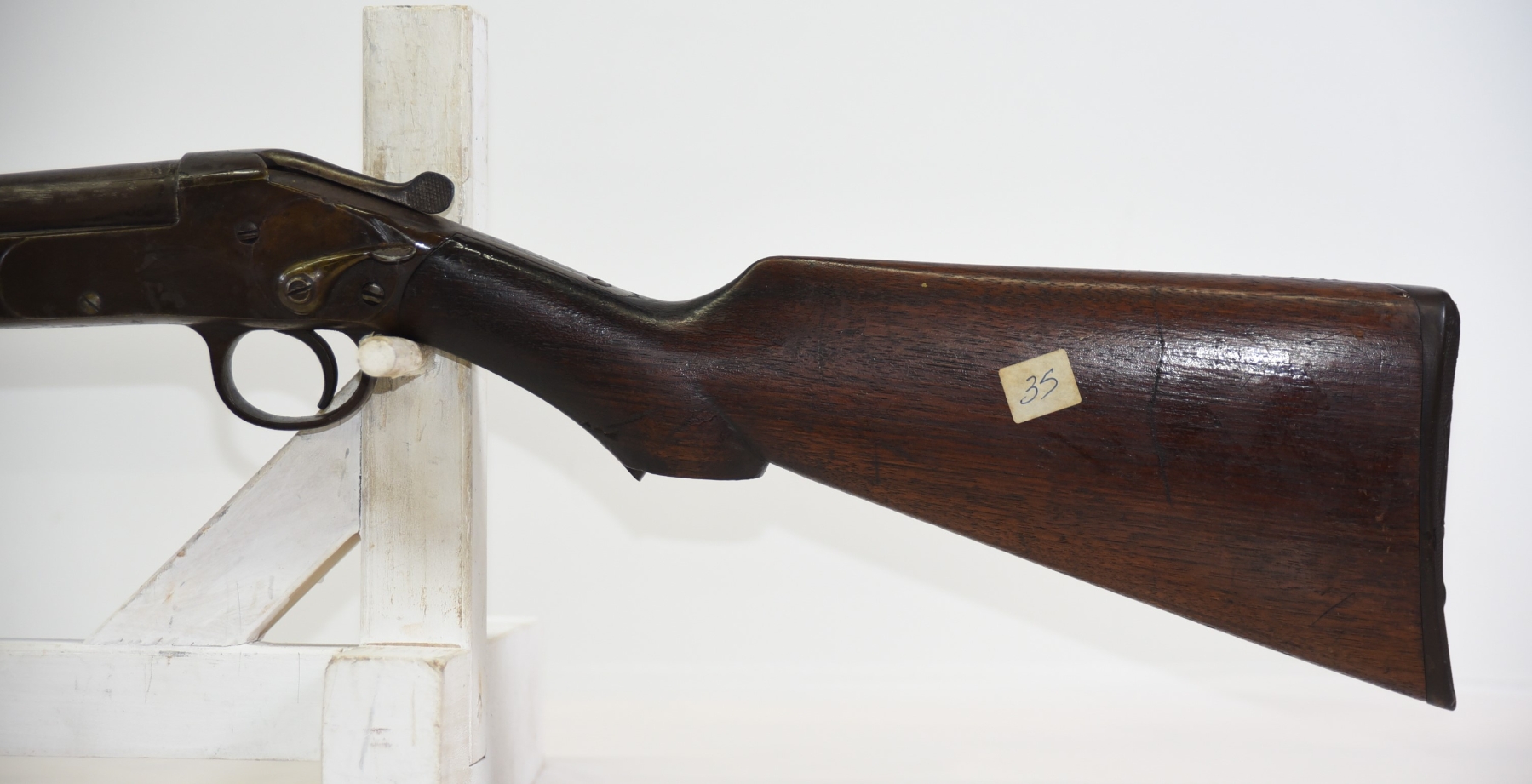 Wood stock shows broken grip heel, there is varnish on the stock, scratches, scuffs, dents, scrapes, small cracks on the upper tang area; condition is less than fair.