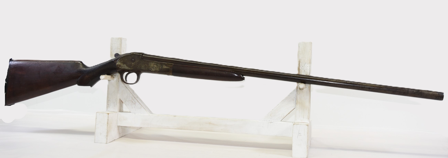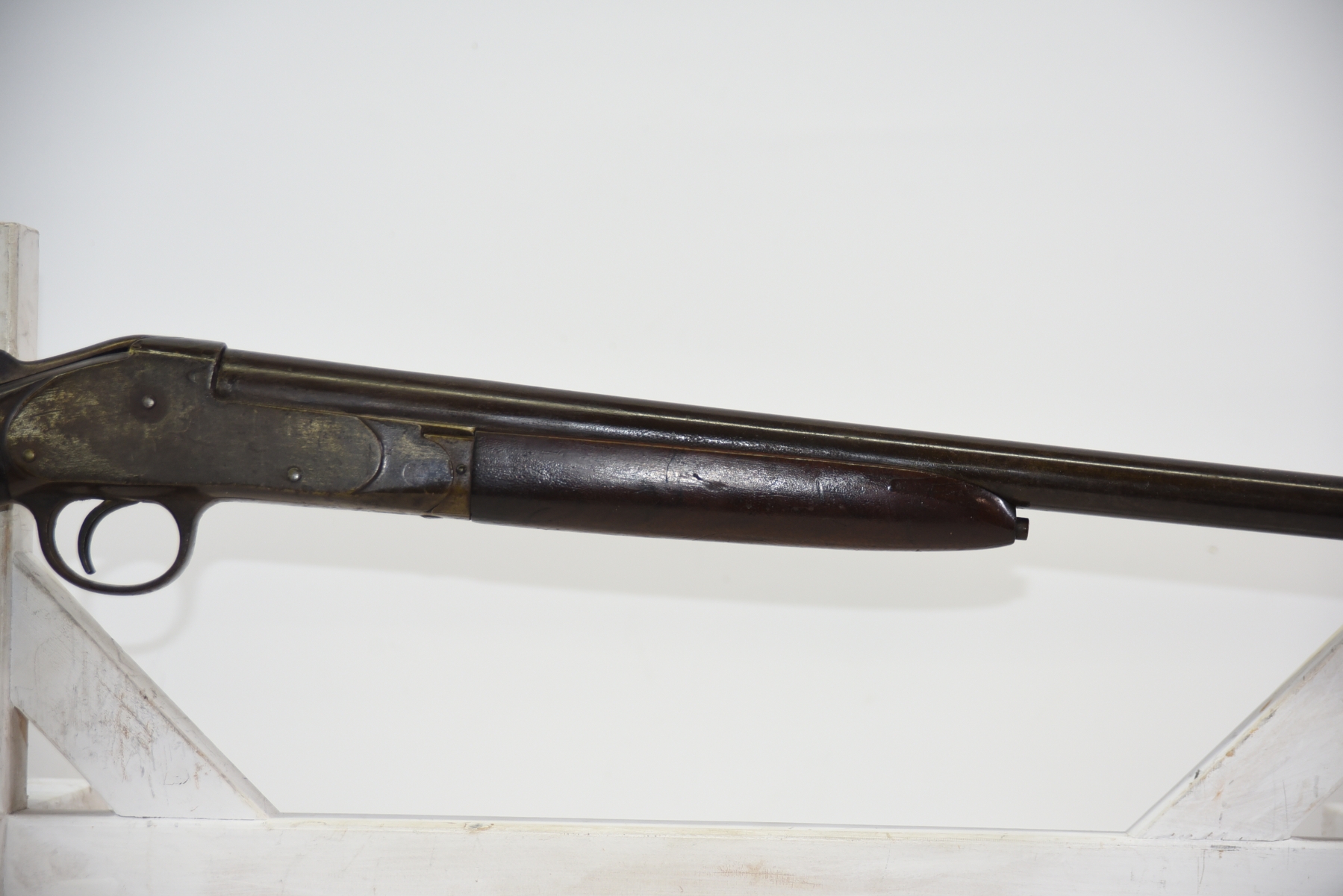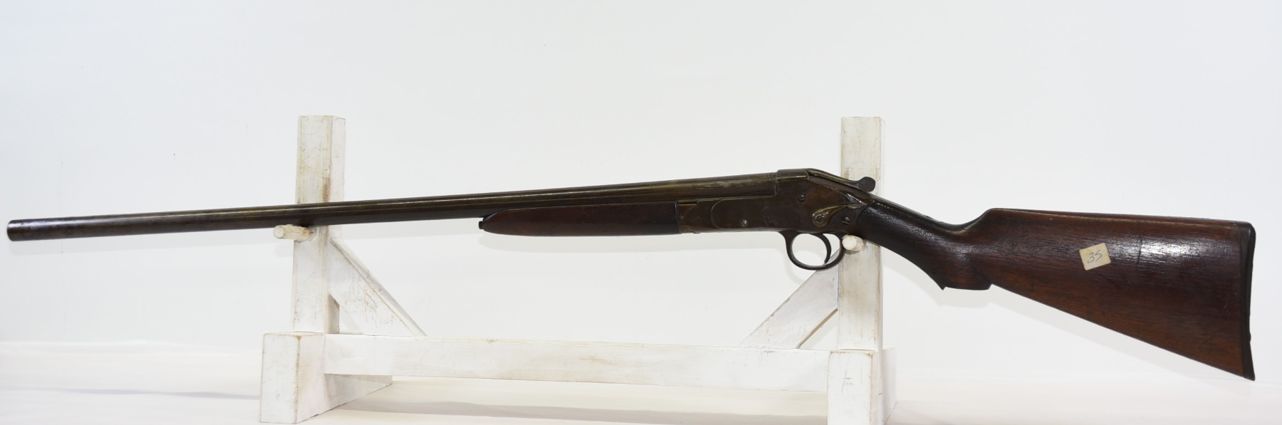 Wood stock shows broken grip heel, there is varnish on the stock, scratches, scuffs, dents, scrapes, small cracks on the upper tang area; condition is less than fair.