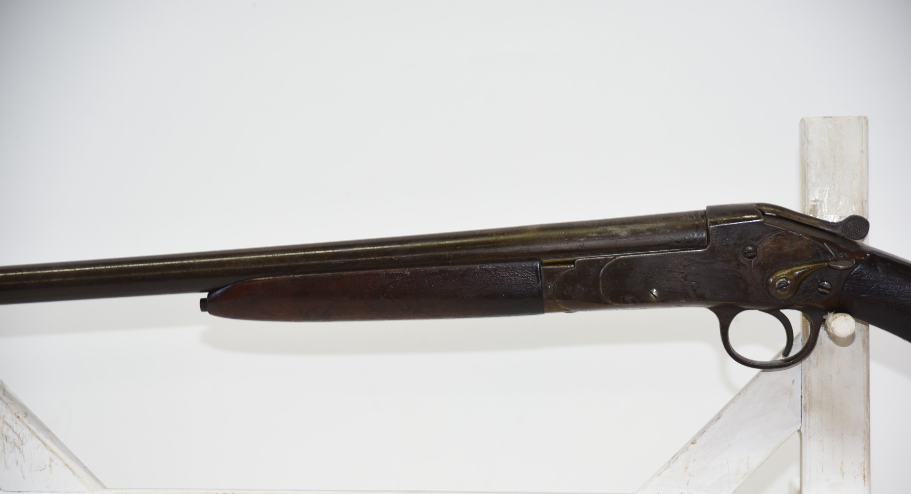 Metal finish shows lots of patina, varnish, front sight bead is missing, rust spots, scratches, scuffs, top lever is loose and light; condition is less than fair.
