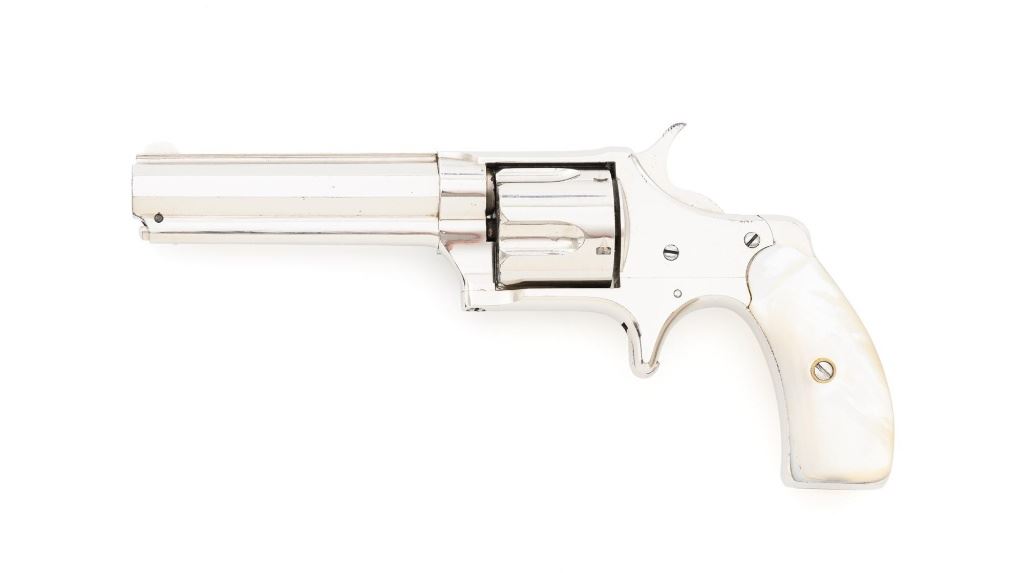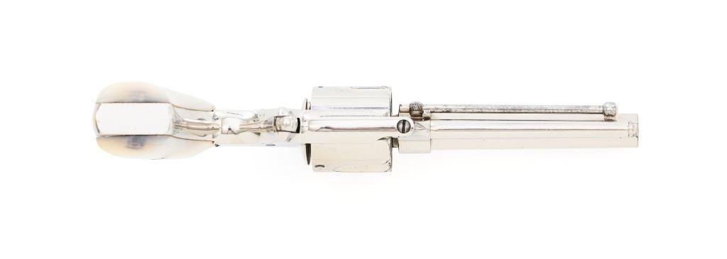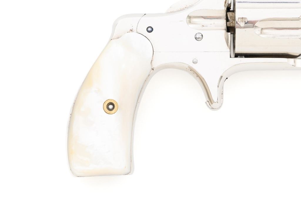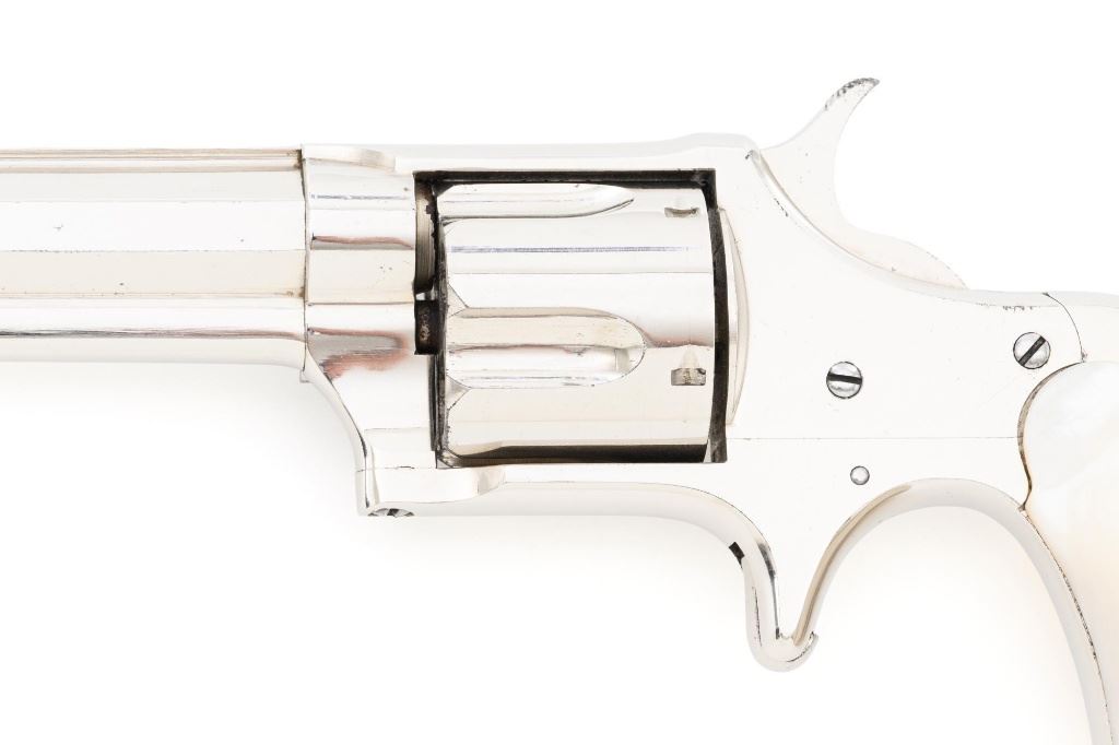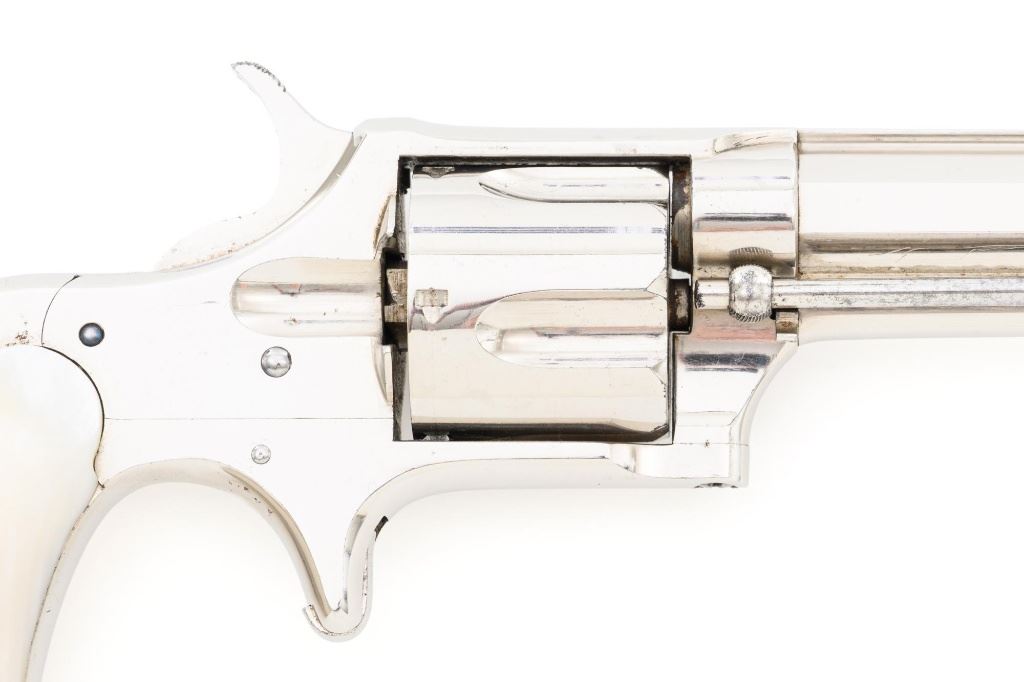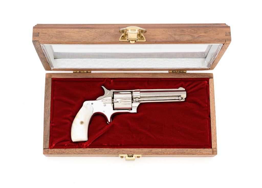 Remington-Smoot New Model #3 Saw Handle Revolver, #NVSN, .38 RF Short cal., 3.75" octagon barrel with solid rib, nickel finish, pearl grips, fixed blade front and "V"-notched rear sight. Top of the barrel is marked in one-line "E. REMINGTON & SONS. ILION, N.Y. PAT. W.S. SMOOT. OCT. 21, 1873". Approx. 6,000 manufactured in this configuration. Includes a glass topped wood display case with fitted red interior. Revolver is in near excellent condition, retaining approx. 97%-98% bright nickel finish, with scattered light scratches and handling marks. Barrel address is crisp. Grips are near excellent. Action is crisp. Bore is fine with well-defined rifling. Wood display case is in excellent condition. Est.: $500-$700. (Antique) (Michael Strietbeck Collection)