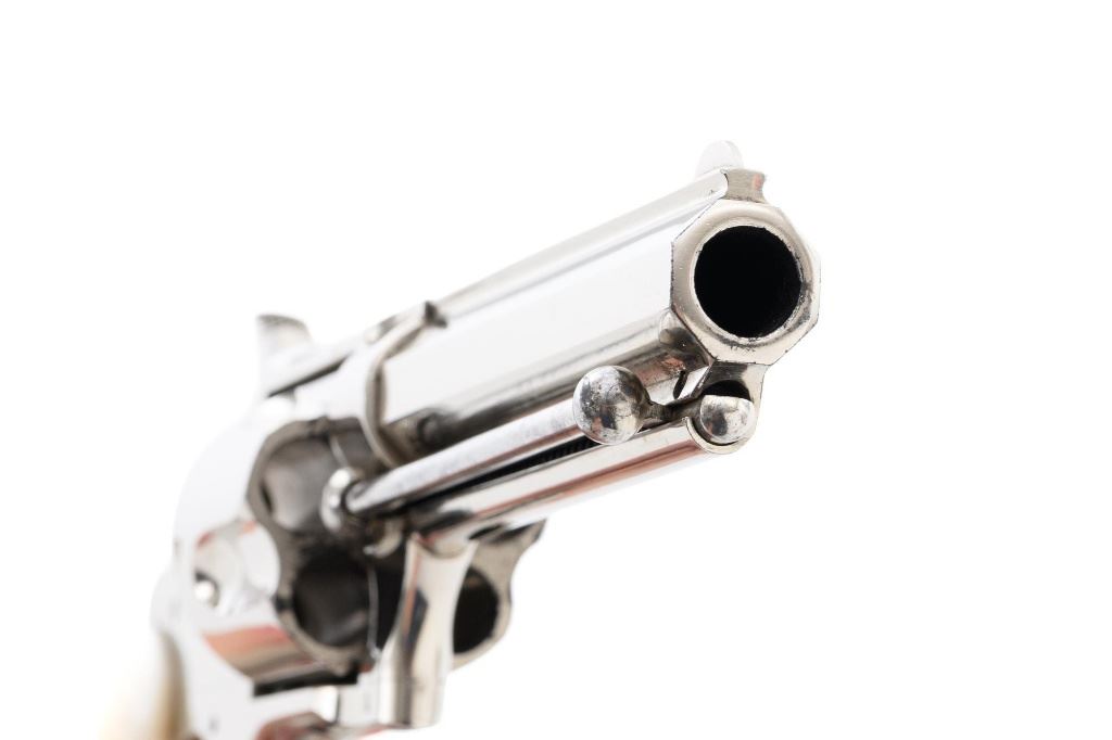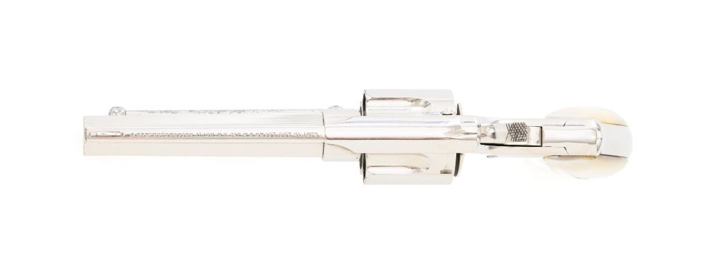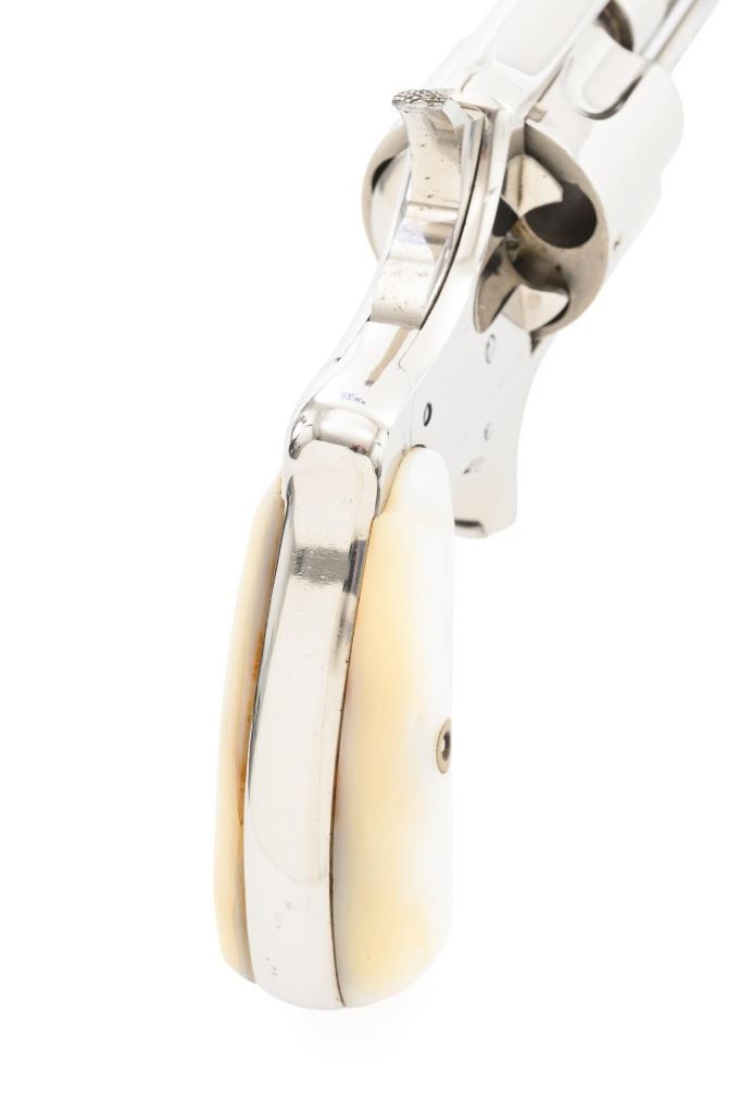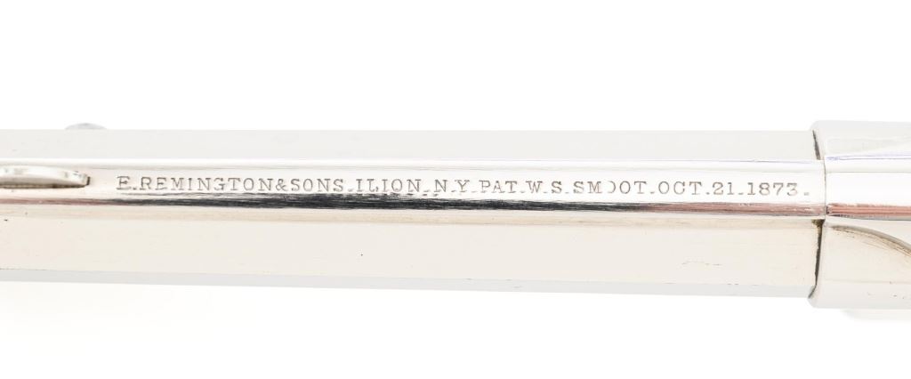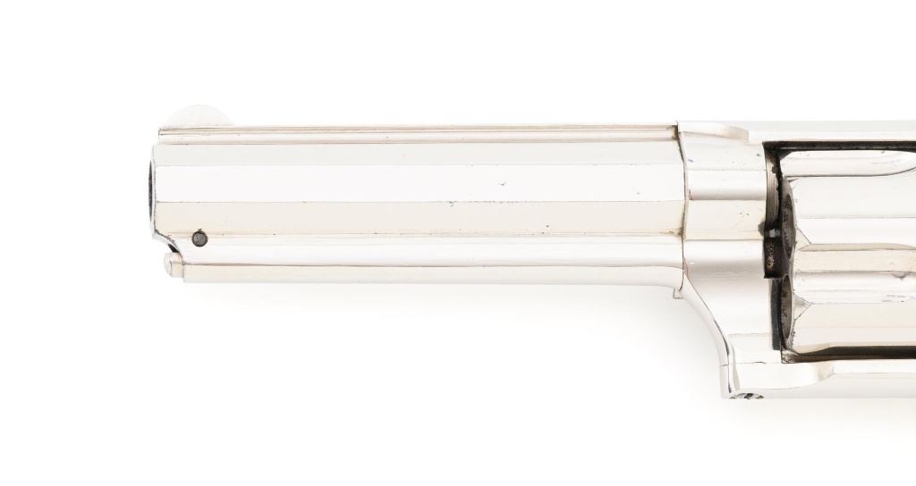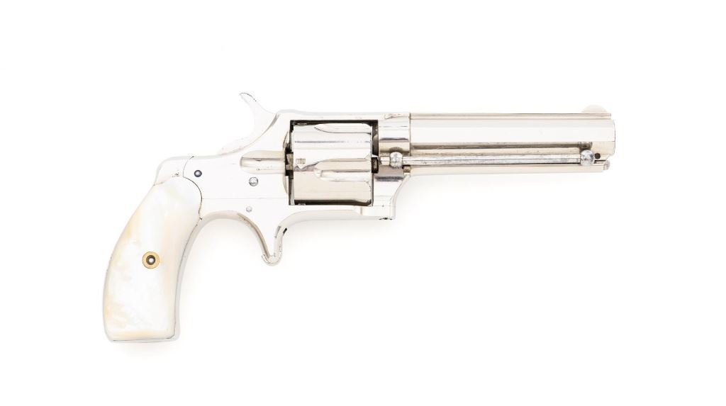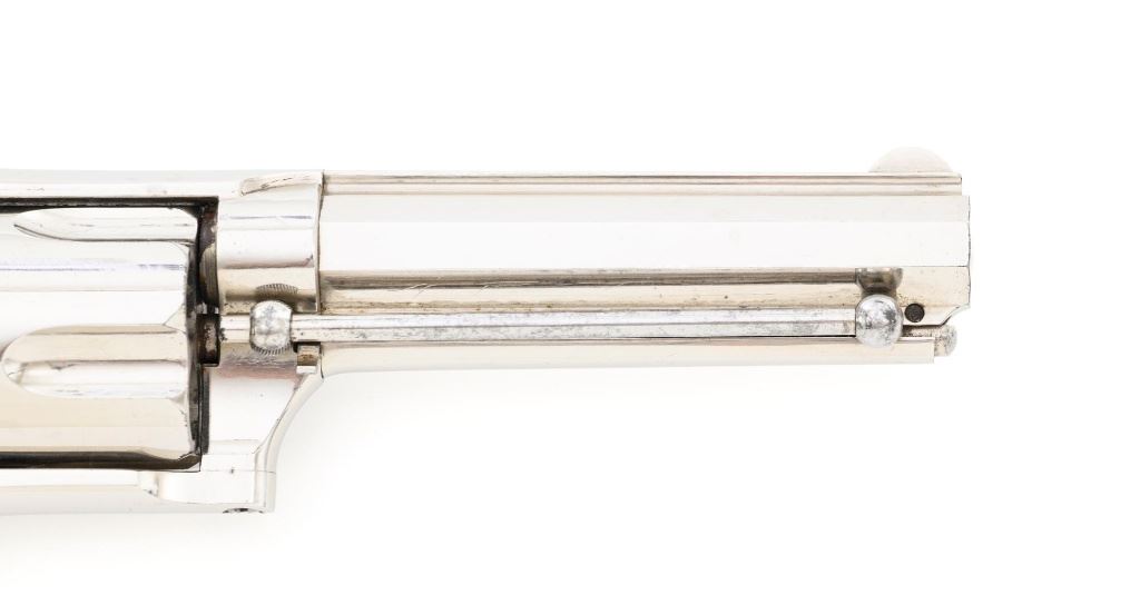 Remington-Smoot New Model #3 Saw Handle Revolver, #NVSN, .38 RF Short cal., 3.75" octagon barrel with solid rib, nickel finish, pearl grips, fixed blade front and "V"-notched rear sight. Top of the barrel is marked in one-line "E. REMINGTON & SONS. ILION, N.Y. PAT. W.S. SMOOT. OCT. 21, 1873". Approx. 6,000 manufactured in this configuration. Includes a glass topped wood display case with fitted red interior. Revolver is in near excellent condition, retaining approx. 97%-98% bright nickel finish, with scattered light scratches and handling marks. Barrel address is crisp. Grips are near excellent. Action is crisp. Bore is fine with well-defined rifling. Wood display case is in excellent condition. Est.: $500-$700. (Antique) (Michael Strietbeck Collection)