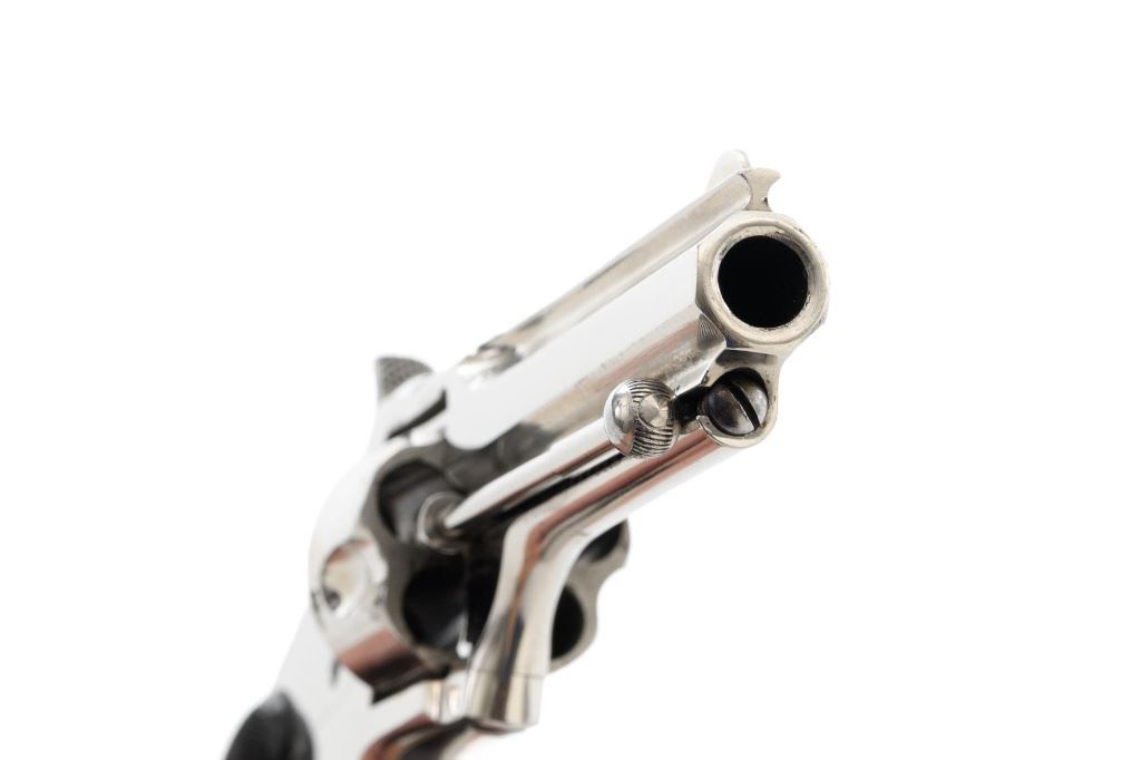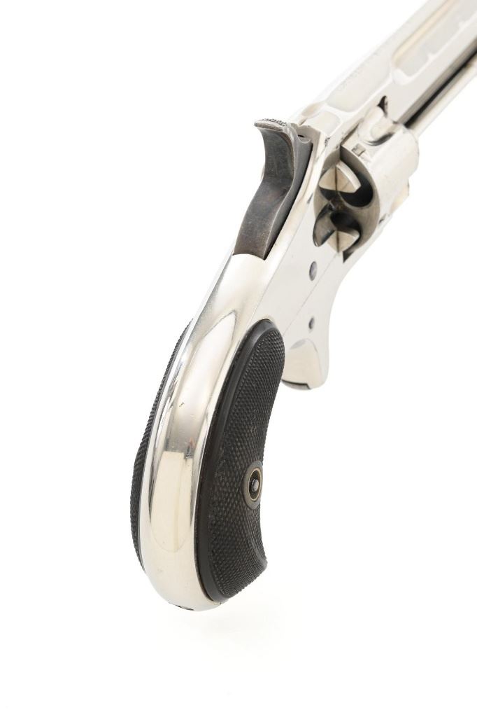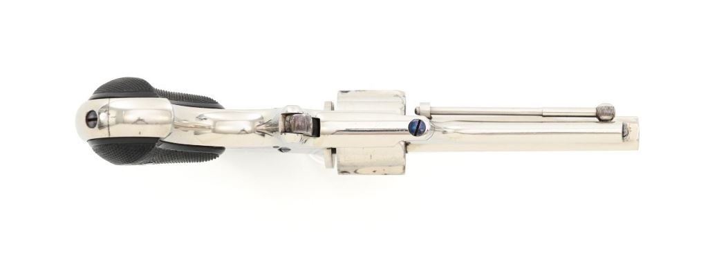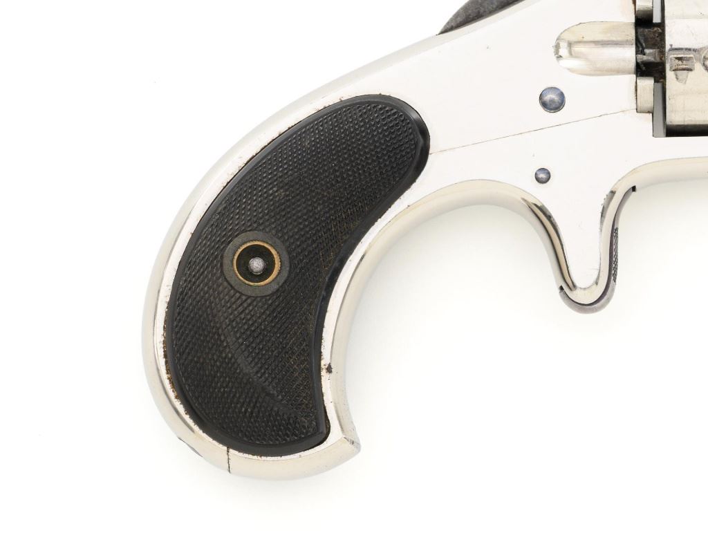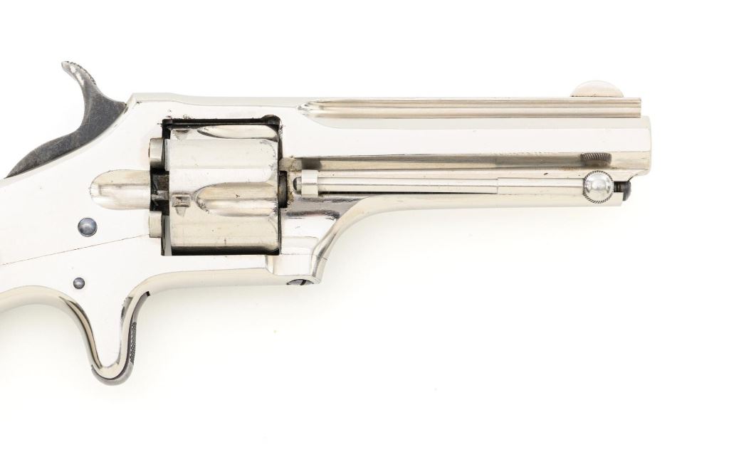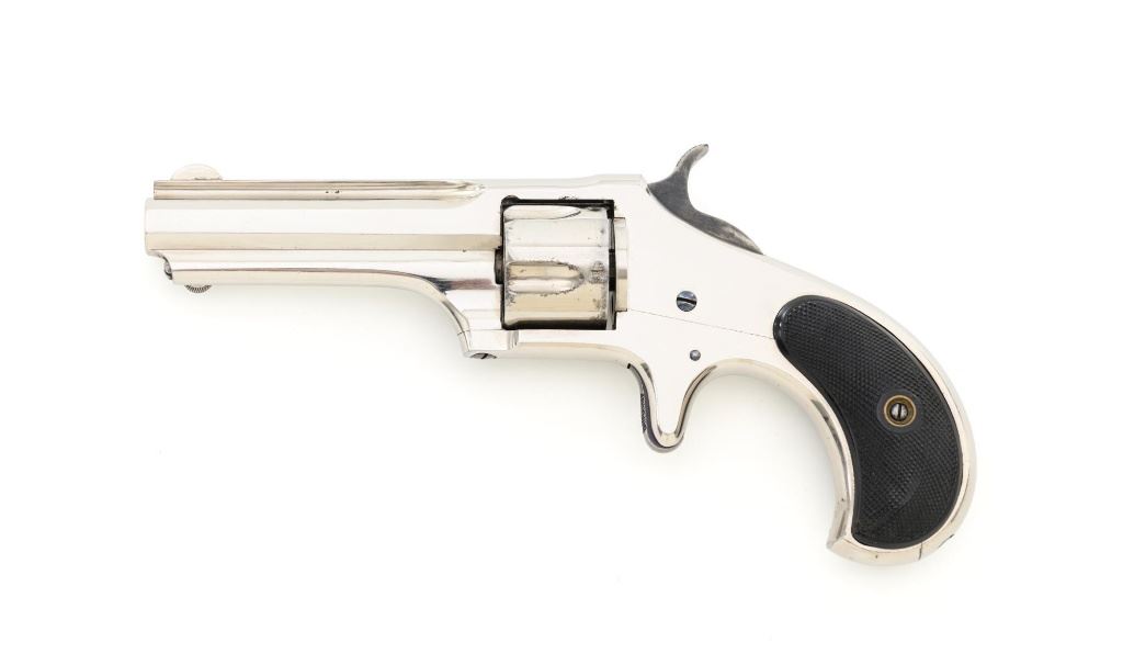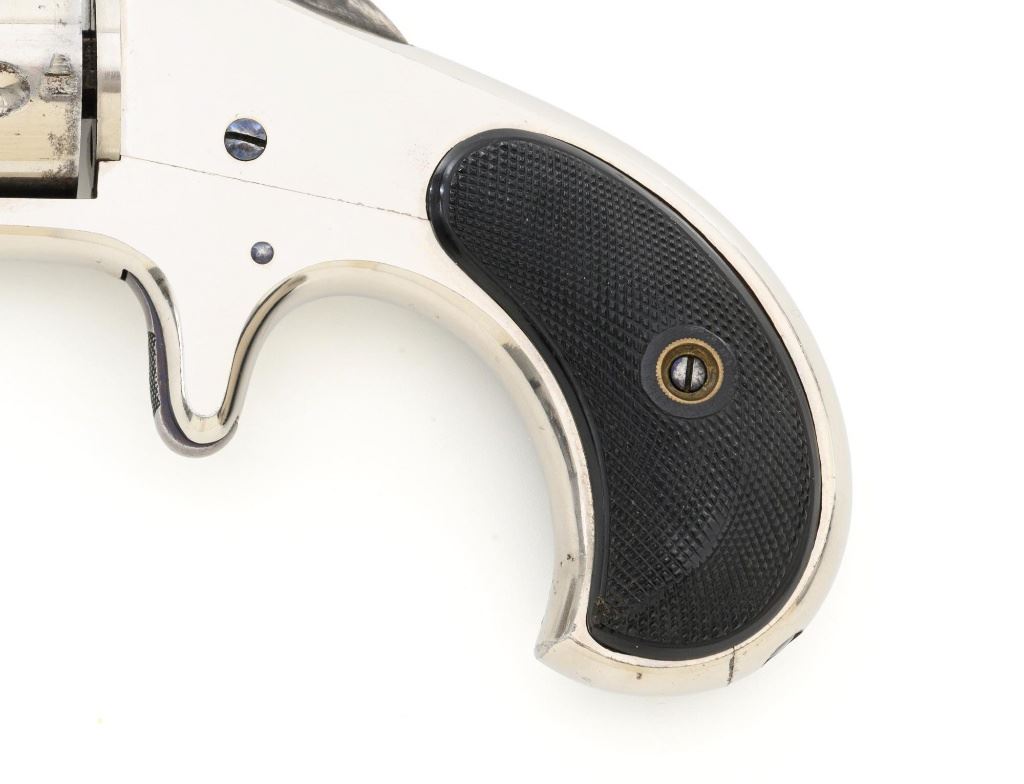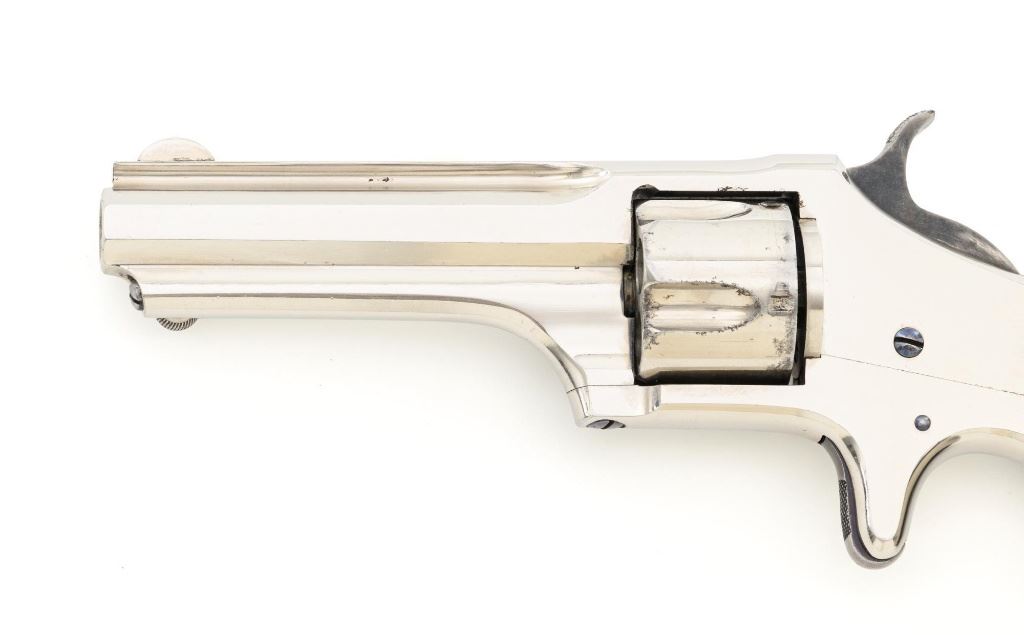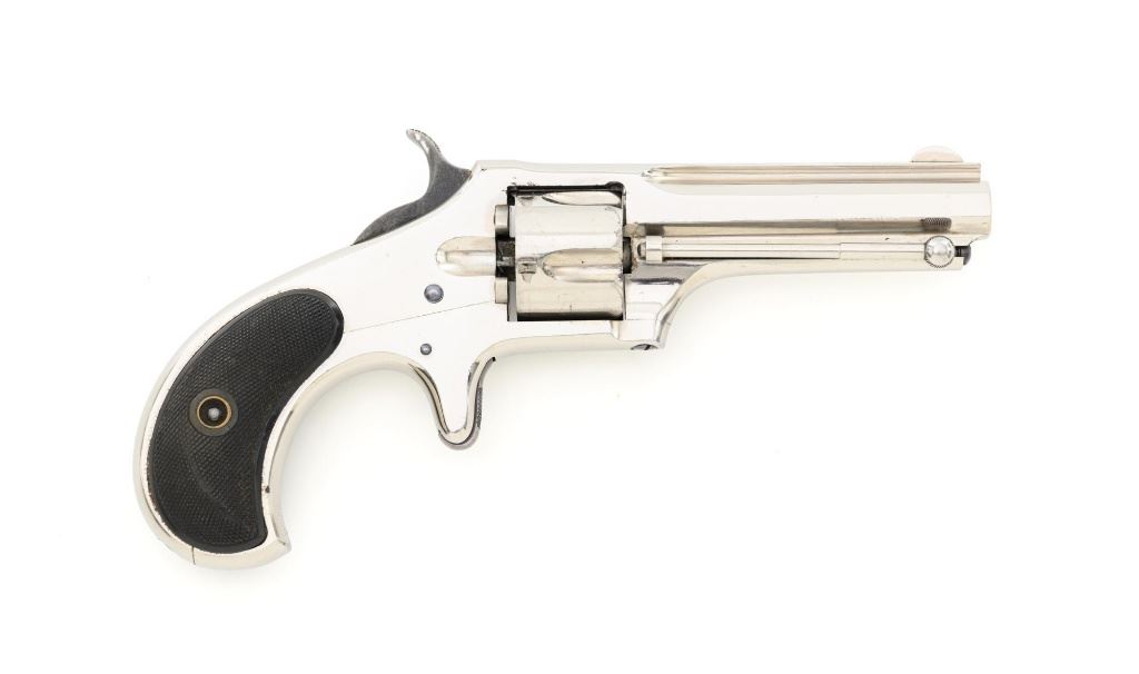 Remington Smoot New Model No. 1 Revolver, #1251, .30 RF short cal., 2-13/16" solid rib barrel, nickel finish, case hardened hammer & trigger, checkered black hard rubber grips, spur trigger, fixed half-moon front sight, and notched rear sight. This later production revolver features a fixed recoil shield. Barrel address is marked in one-line "E. REMINGTON & SONS, ILION, N.Y. PAT. W.S. SMOOT. OCT. 21, 1873." The serial number is stamped twice on the left side of the grip frame. Overall condition of this revolver is excellent, retaining approx. 97% bright nickel finish, with a few minor spots of flaking, general light micro-scratching and handling marks. Case colors have toned dark. Grips are excellent. Front portion of the barrel address is worn but legible. Action is crisp. Rifling is fine with scattered spots of light erosion. Est.: $600-$800. (Antique) (Michael Strietbeck Collection)