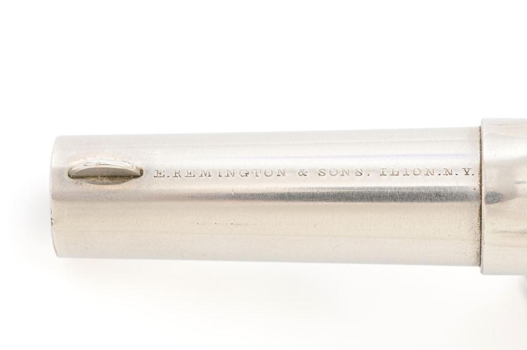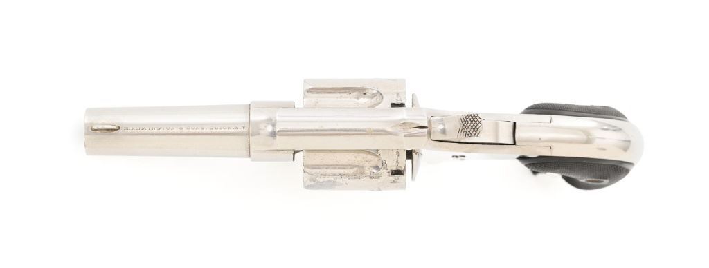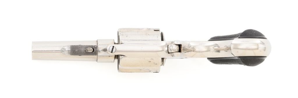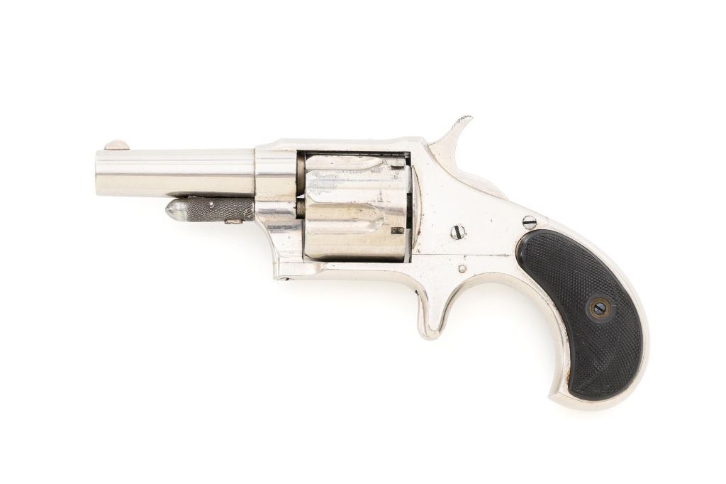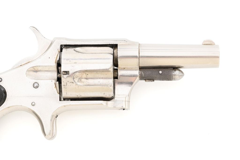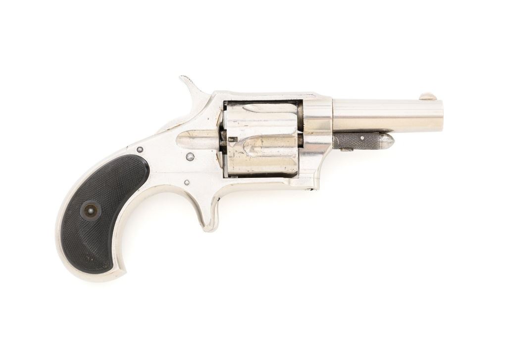 Remington-Smoot New Model No. 4 Spur Trigger Revolver, #21472, .38 CF cal., 2.5" barrel, nickel finish, checkered black two-piece hard rubber grips, half-moon blade front sight, with milled groove in the rear of the top strap. Marked on top of the barrel "E. REMINGTON & SONS. ILION, N.Y." Approx. 23,000 were manufactured circa 1877-1888. Overall condition is fine, displaying approx. 95% nickel finish, with a crisp barrel address. Grips are excellent. Action is strong and crisp, Bore with scattered spots of mild erosion, rifling is clearly defined and rates very good overall. Est.: $600-$800. (Antique) (Michael Strietbeck Collection)