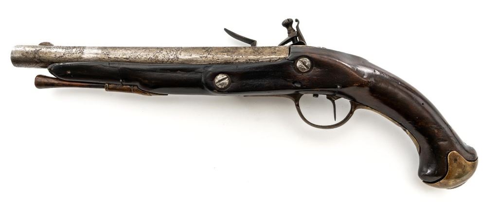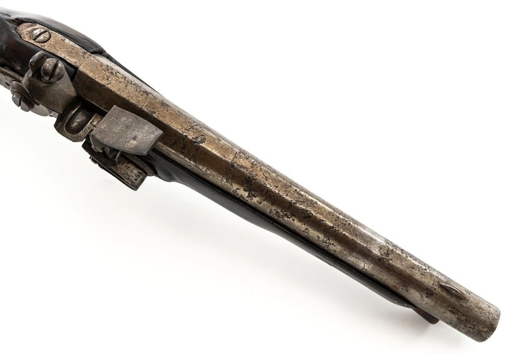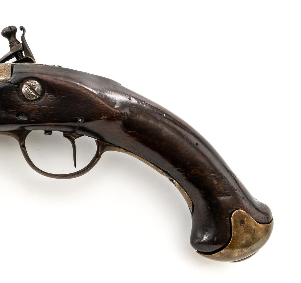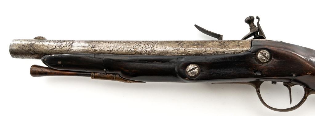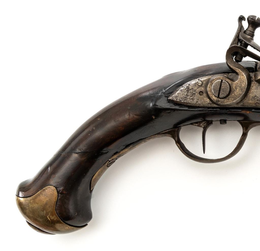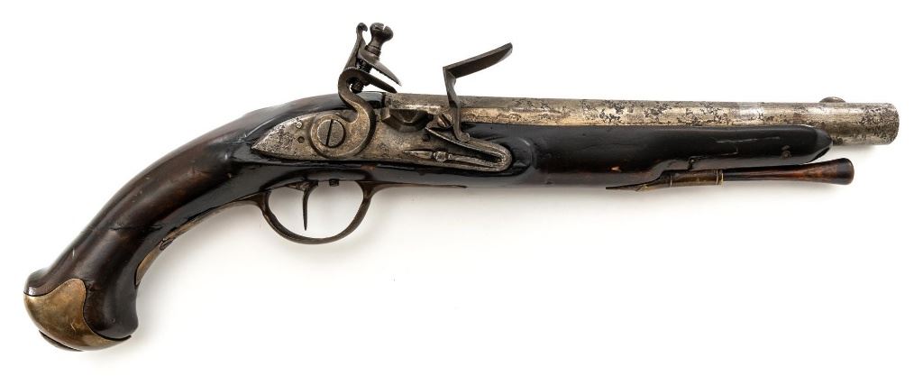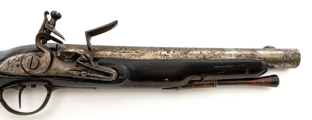 Restored Antique European Large-Bore Flintlock Horseman's Pistol, #NVSN, .75 cal., 10.5" round-to-octagonal barrel with low blade front sight, no rear sight. Beveled lockplate appears to be marked "25" at bottom, has swan-neck cock and faceted pan. Walnut stock with brass furniture, raised panels at either side of lock, carved teardrop behind barrel tang, and single ferrule retaining the tulip-head hardwood ramrod. Condition is fair as configured, the lock (or at least cock and frizzen) is a modern replacement. Heavily-pitted barrel shows an area where apparently once was a band, and the stock may have been reshaped in that area of the forend. Stock shows wear, thru-crack at lower wrist, damage/repair at lower rear, repaired cracks at both sides between nose and lock, and at ramrod ferrule, later varnish. Rear trigger guard tang is broken. Ramrod is likely a replacement. Action functions but trigger does not trip cock without help, smoothbore shows moderate to heavy erosion. Est.: $200-$400. (Antique)