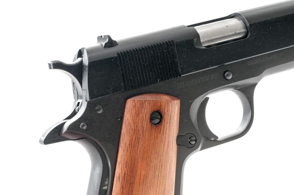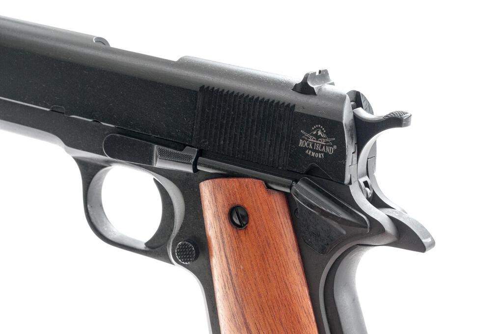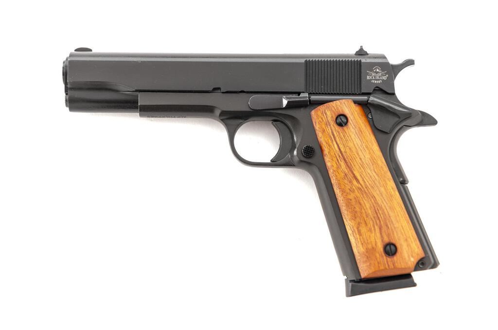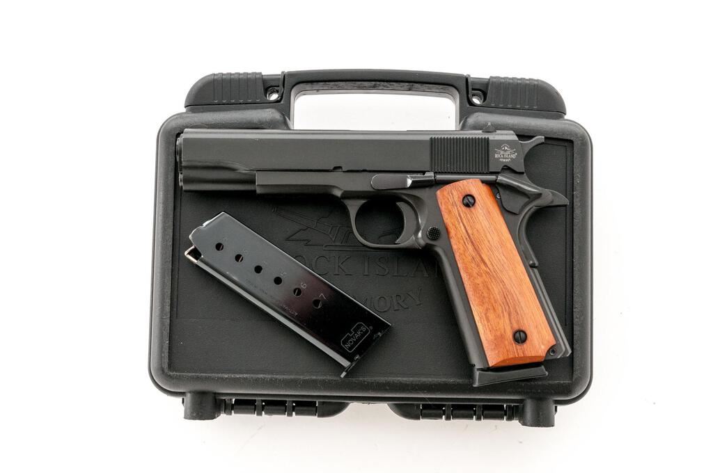 Rock Island M1911 A1-FS G.I. Standard Semi-Automatic Pistol, #RIA2273767, .45 ACP cal., 5" barrel, low-profile blade front and square-notched fixed rear sights, black parkerized finish, smooth wood two-piece grips, one 8-rd. magazine with bumper pad. In plastic factory case with an additional Novak marked 7-rd. magazine, trigger lock, manual, spent cases and associated packaging materials. Pistol is as new in the factory case showing little, if any use, only light handling marks with a couple of light scratches. The underside of the frame is import marked "APINTL-PAHRUMP NV / ACP PHILIPPINES". Smooth wood grips are excellent and fit well. Action is crisp, bore is very good. Est.: $400-$600. (Modern/PPT)