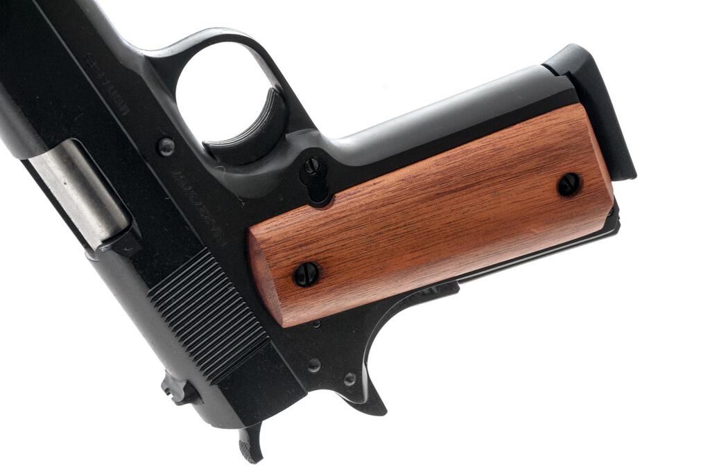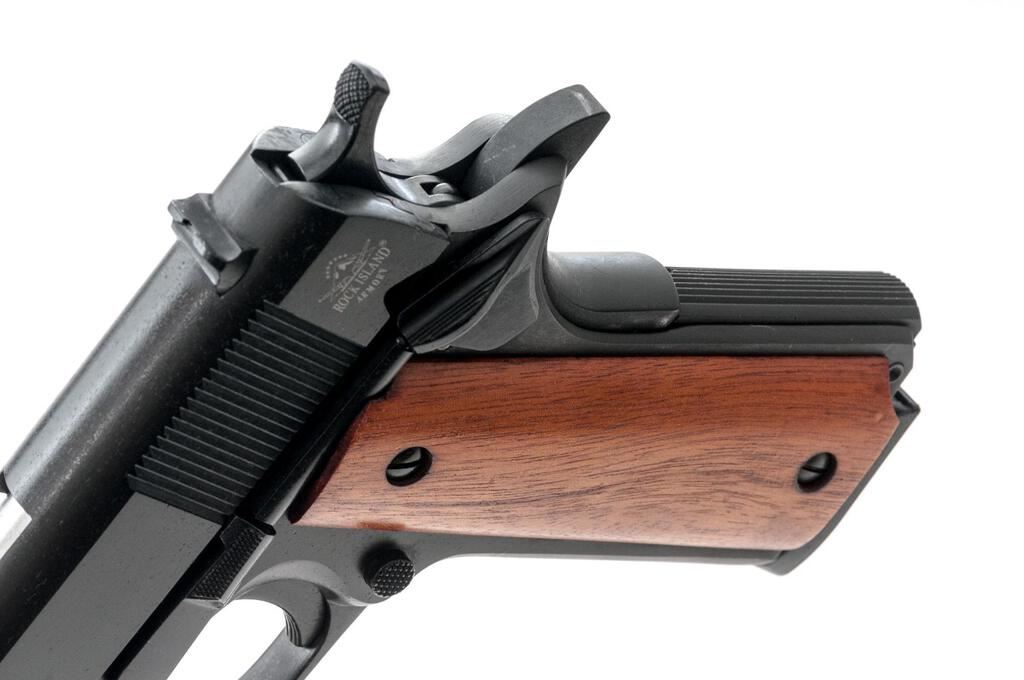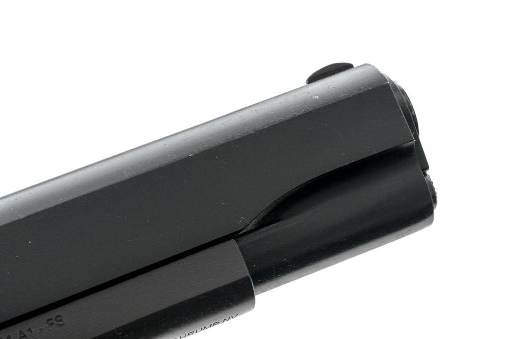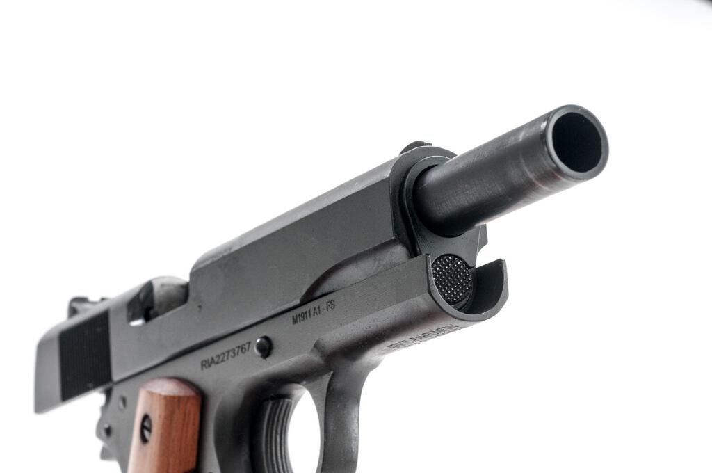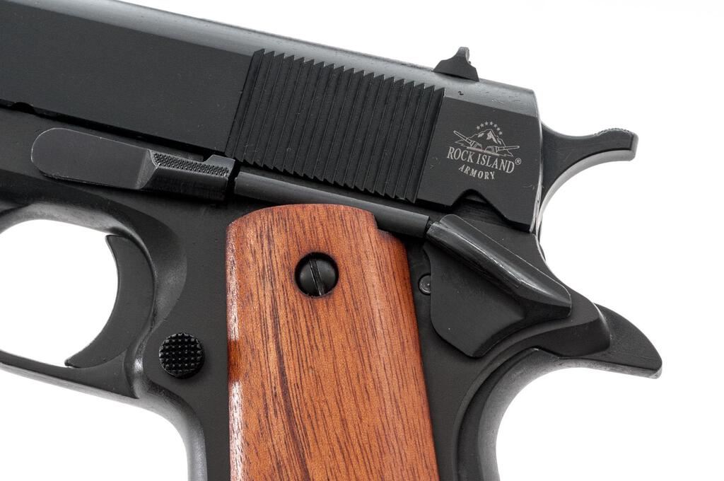 Rock Island M1911 A1-FS G.I. Standard Semi-Automatic Pistol, #RIA2273767, .45 ACP cal., 5" barrel, low-profile blade front and square-notched fixed rear sights, black parkerized finish, smooth wood two-piece grips, one 8-rd. magazine with bumper pad. In plastic factory case with an additional Novak marked 7-rd. magazine, trigger lock, manual, spent cases and associated packaging materials. Pistol is as new in the factory case showing little, if any use, only light handling marks with a couple of light scratches. The underside of the frame is import marked "APINTL-PAHRUMP NV / ACP PHILIPPINES". Smooth wood grips are excellent and fit well. Action is crisp, bore is very good. Est.: $400-$600. (Modern/PPT)