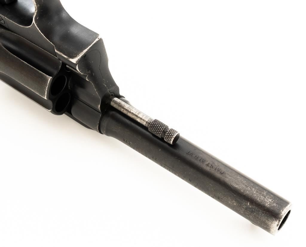 Royal Hong Kong Police Marked Colt Police Positive Special (3rd Issue) Double Action Revolver, #745794, .38 Colt N.P. cal., 4" barrel, blue finish, checkered walnut two-piece grips with Colt medallions, lanyard ring, serrated blade front and fixed square-notch rear sight. "(Rampant Colt)" marked at the left rear is only partially visible, with "RHKP 8645" along the backstrap. Import marked on the underside of the barrel. Mfgd1959. Revolver is in very good overall condition, with general holster wear that is consistent with service use, retaining approx. 85%-90% thinning finish. Frame shows edgewear and scattered spots of light corrosion, grip straps are toning dark. Trigger guard with small mars and wear around the edges. Grips are in very good condition with some smoothing of the checkering, showing minor impressions on the right panel. Action functions well and locks up securely. Bore is very good with mild erosion at the breech; rifling is strong. Est.: $500-$700. (C&R/PPT)