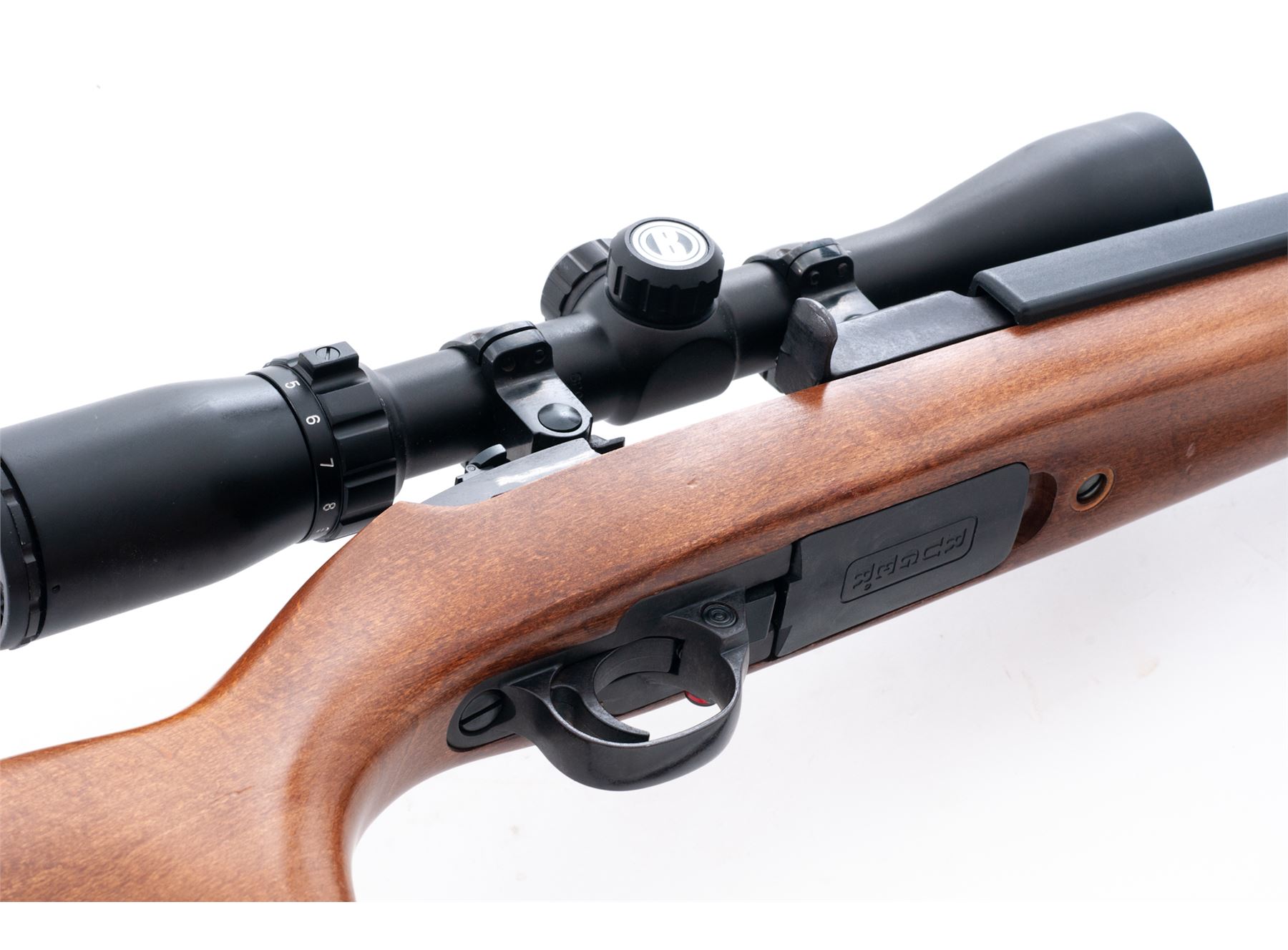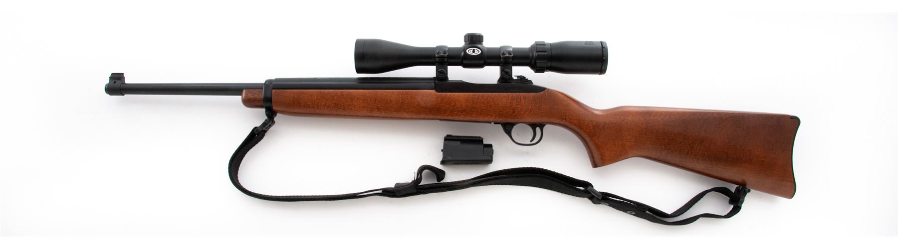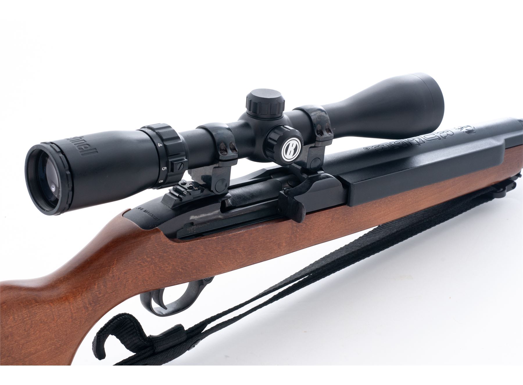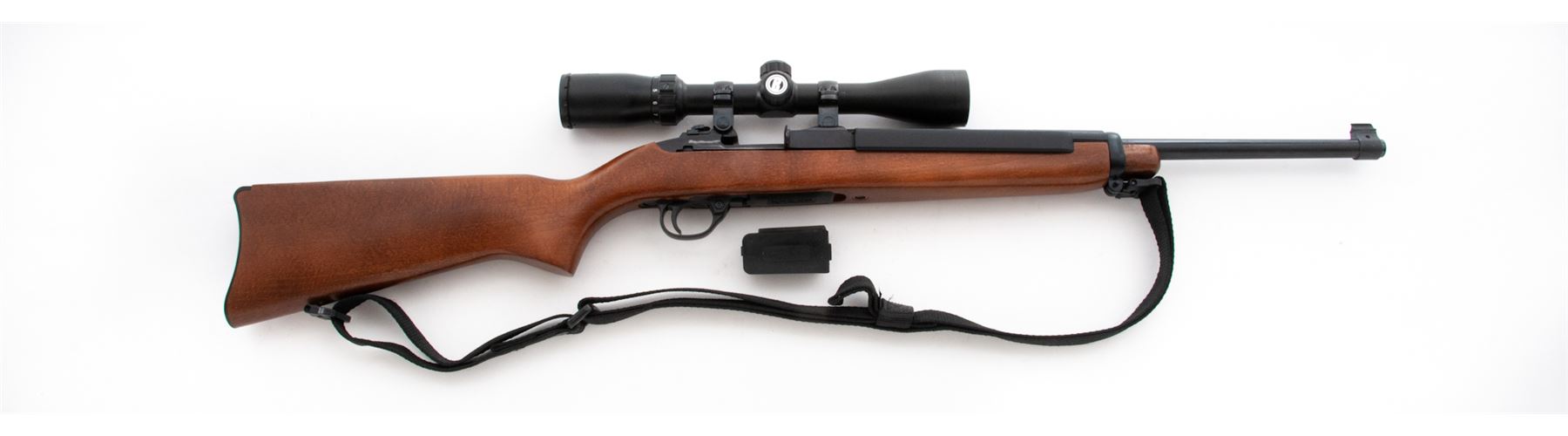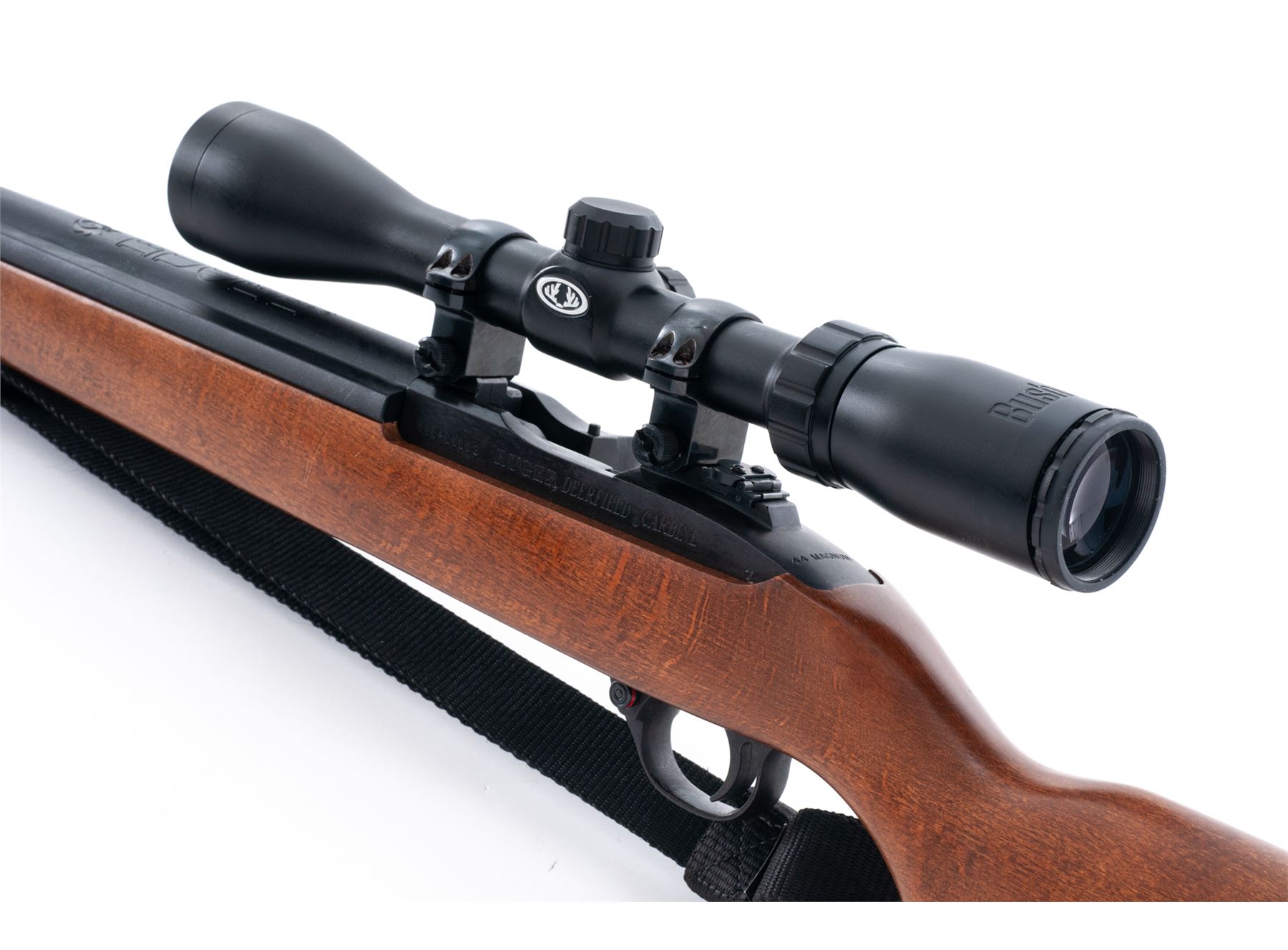 Ruger Deerfield Semi-Automatic Carbine, #630-10102, .44 mag. cal., 18'' barrel, blue finish, birch stock, with black nylon sling, with two (2) factory magazines. Topped with a Bushnell 3-9x40 Sportsman scope. Condition is excellent showing just light thinning to finish in actioning areas near bolt. Stock with only the lightest marks. Good action, mirror bright bore, clear scope optics. Est.: $600-$900. (Modern)