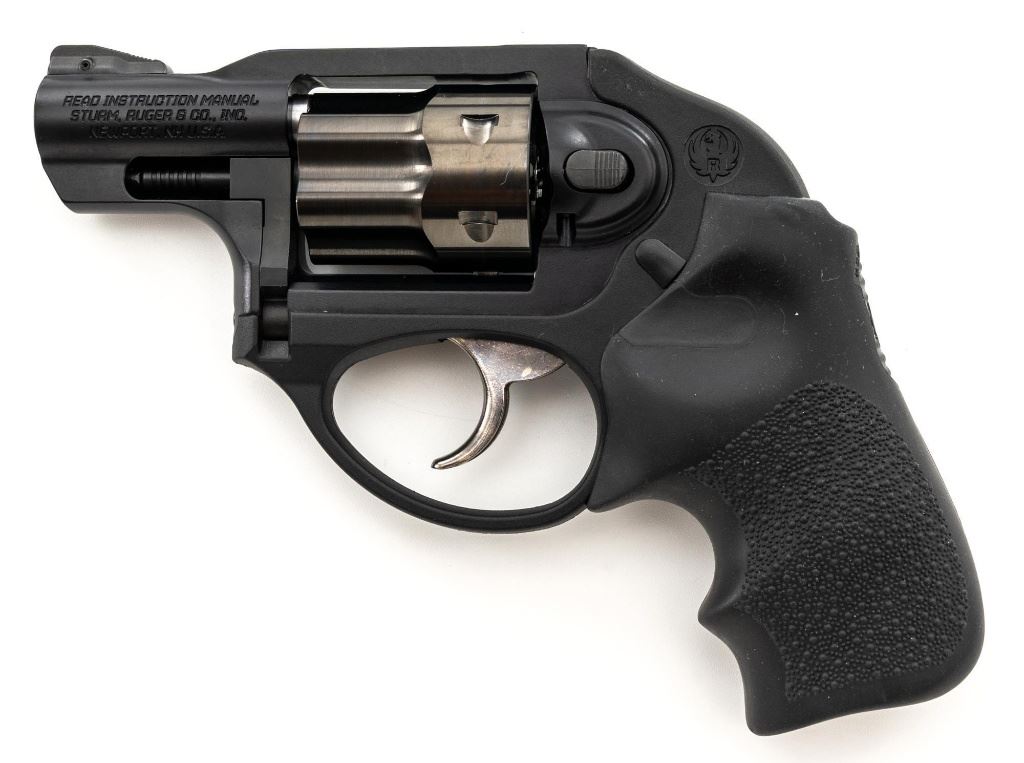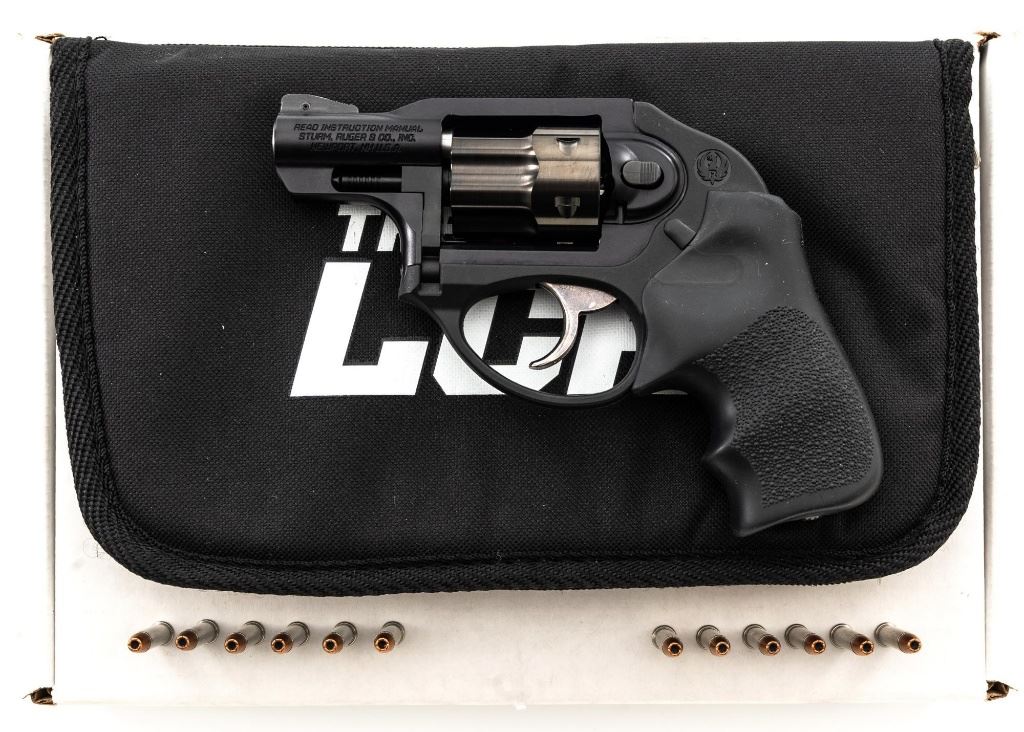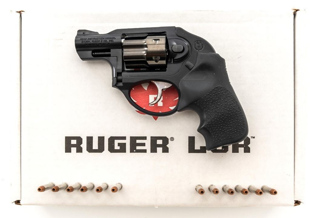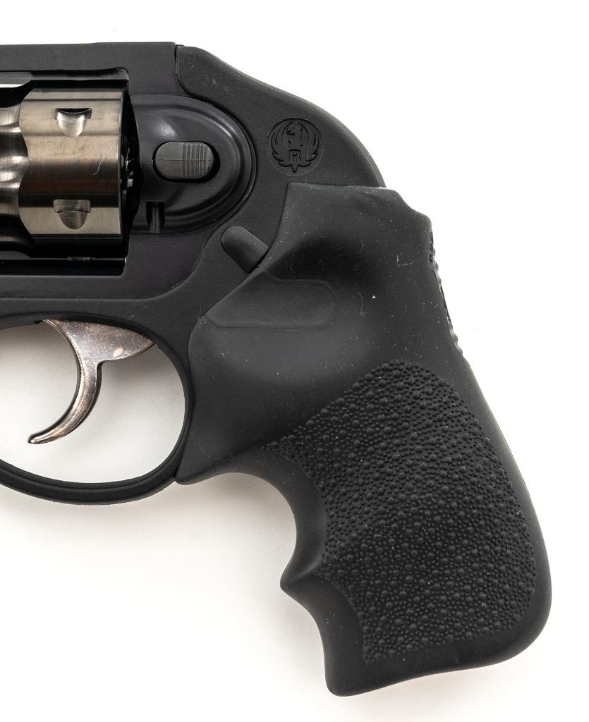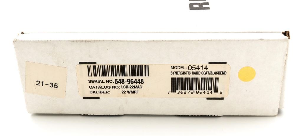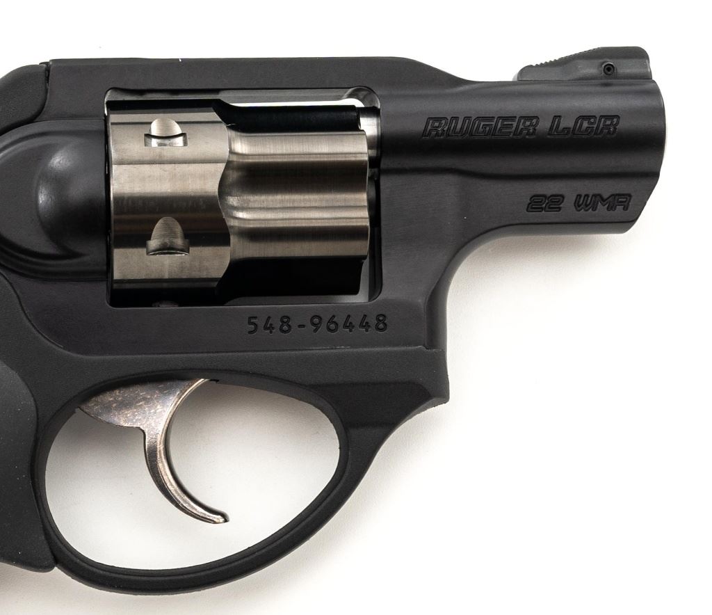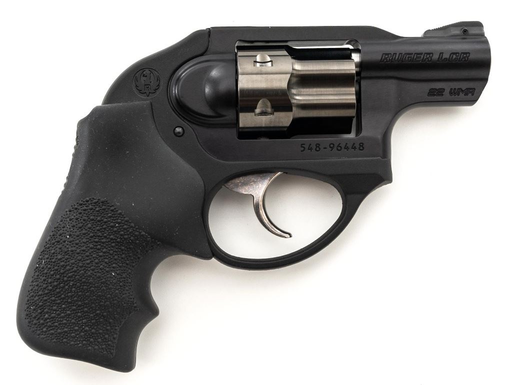 Ruger LCR Double Action Revolver, #548-96448, .22 WMR cal., 2" barrel, matte black finish, fluted black stainless cylinder, Hogue Tamer textured rubber monogrip, pinned ramped white blade front sight and square-notched rear sight. Includes factory cardboard box with matching end label and Ruger LCR soft case. Mfg'd 2015. Revolver appears as new, with only minor handling marks. Action is crisp, bore is excellent. Est.: $400-$600. (Modern/PPT)