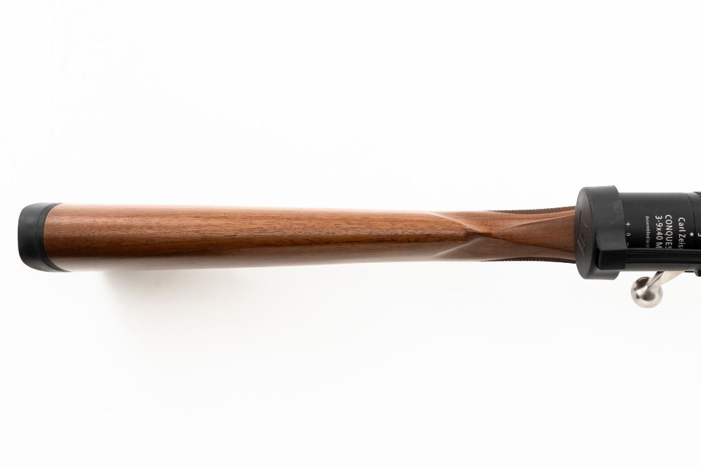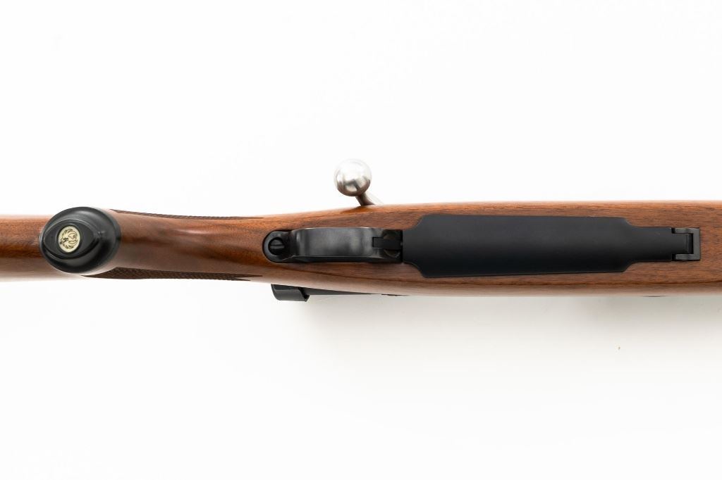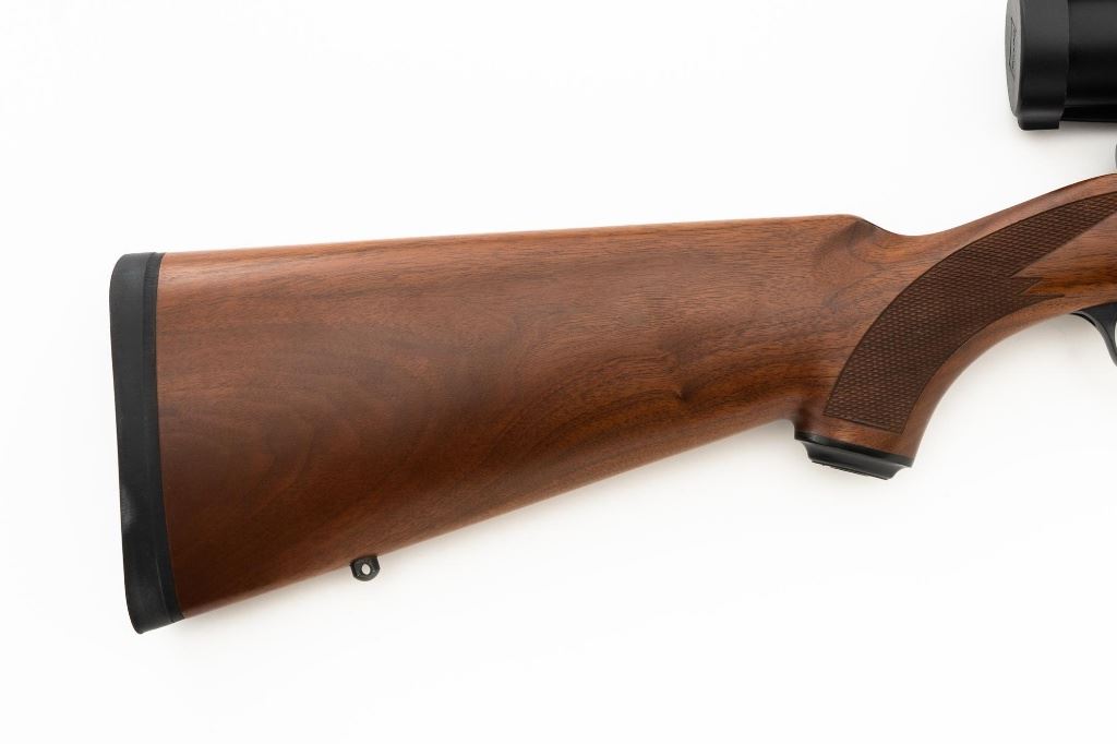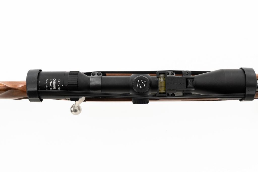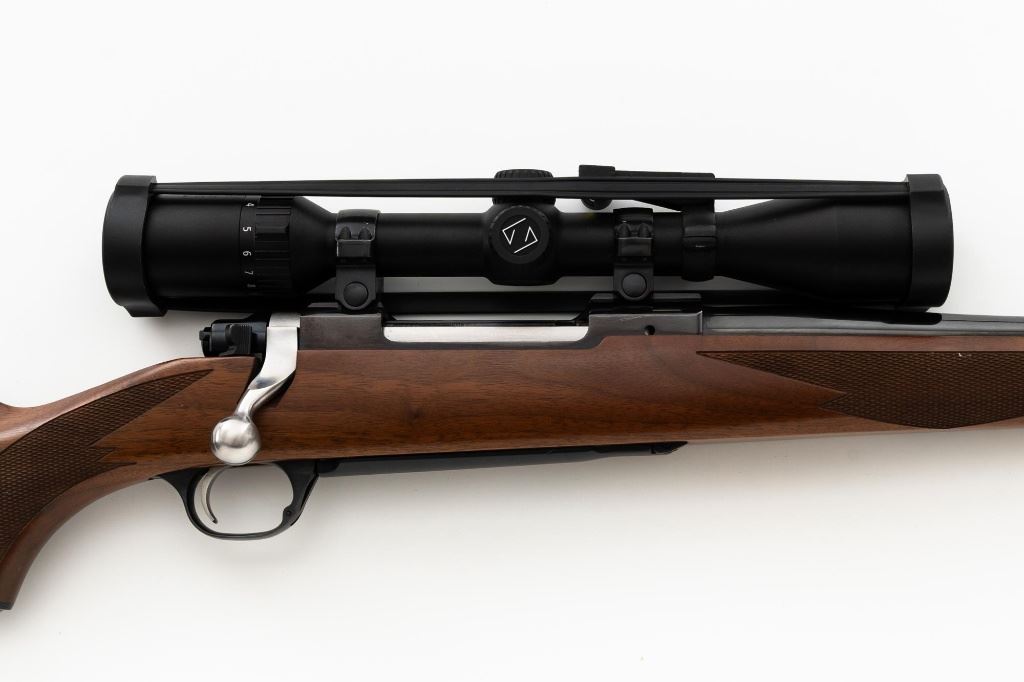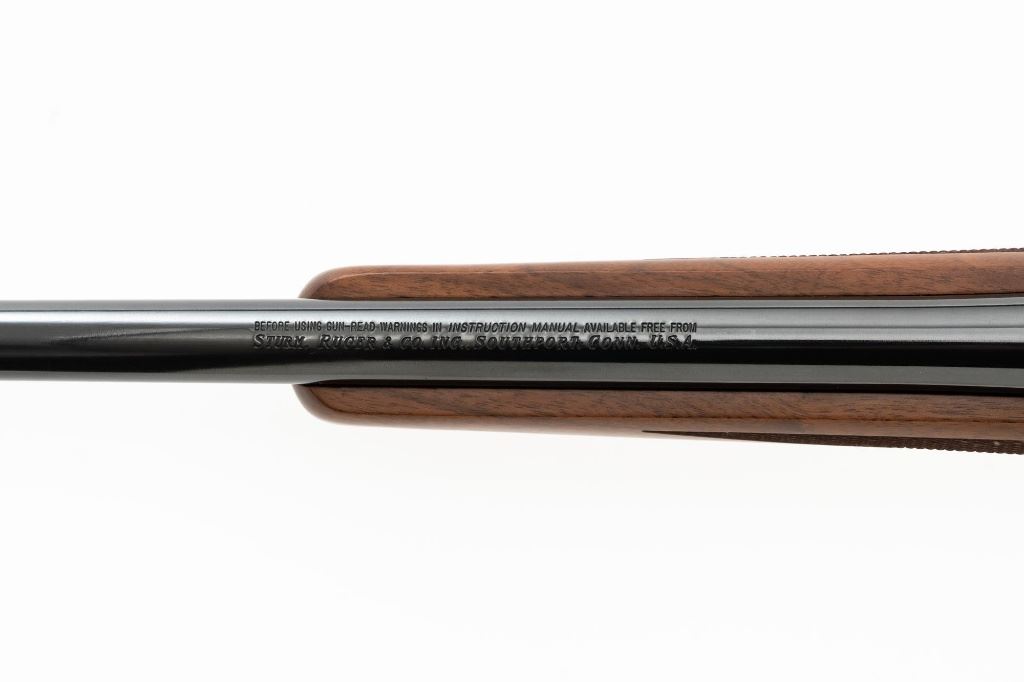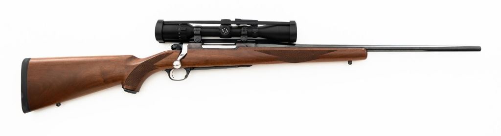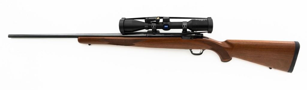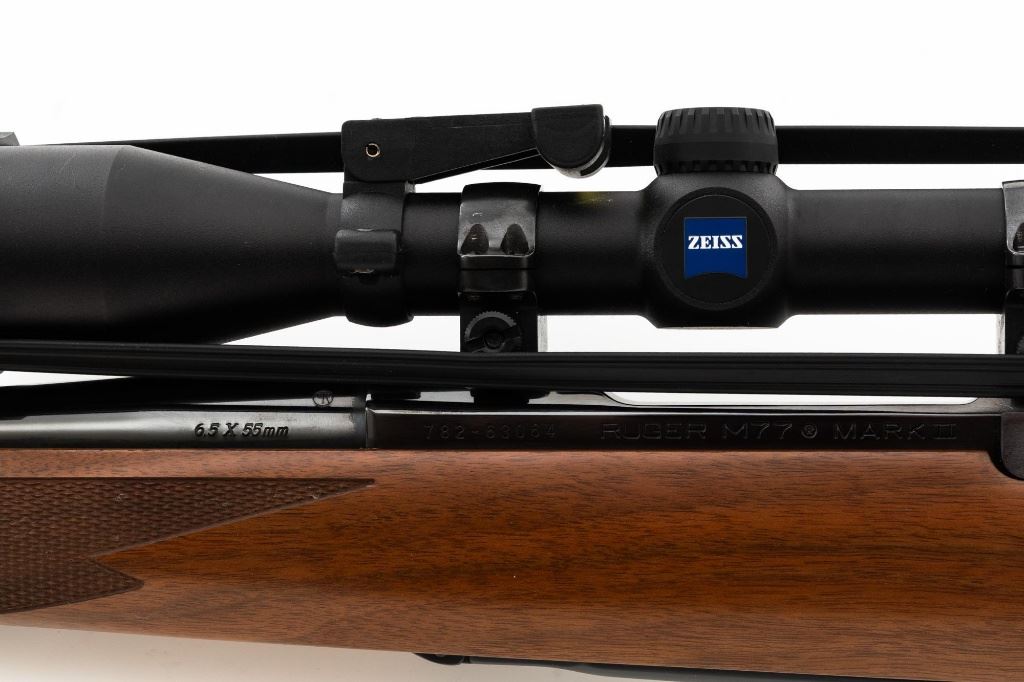 Ruger M77 Mark II Bolt Action Rifle, #782-63064, 6.5x55 cal., 22" barrel, with blue finish. Checkered walnut one-piece pistol grip stock with sling swivel studs, Ruger grip cap, ending with a solid black rubber Ruger recoil pad, providing a 13.75" LOP. There is no provision for sights. Bolt is in the white with matching serial number. Receiver with integral mounts. Rifle is topped with Ruger rings and a Zeiss Conquest 3-9x40 MC scope, finished in matte black, with a duplex reticle. Scope is in excellent condition, with clear, bright optics, added bubble level, and set of Zeiss rubber lens covers. Mfgd 1994. Rifle is in excellent overall condition, retaining approx. 99% factory finish, showing little, if any use. Stock is in excellent condition with sharp checkering detail. Action is crisp and functions smoothly. Bore is mirror bright with excellent rifling. Est.: $700-$900. (Modern)