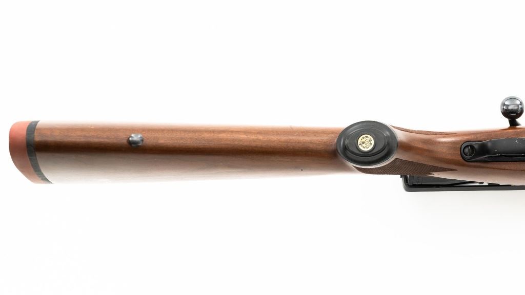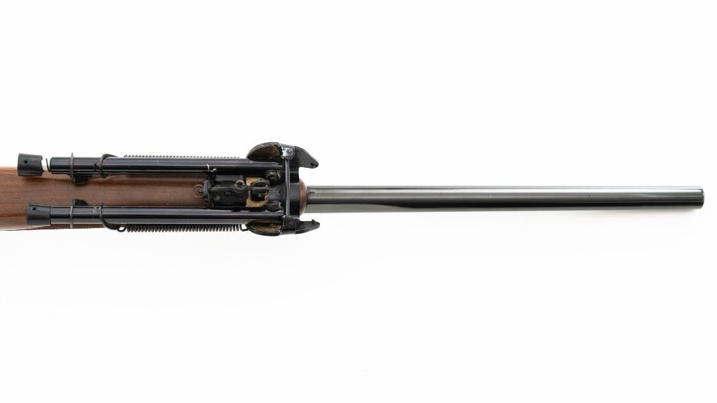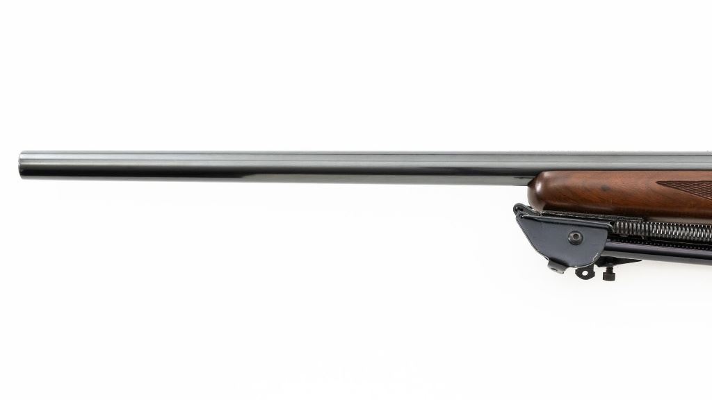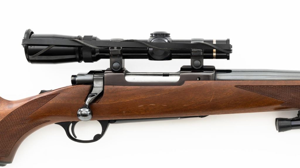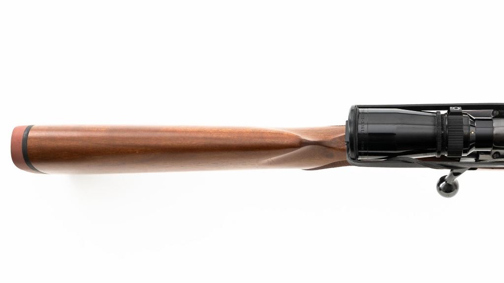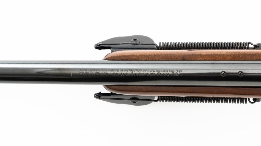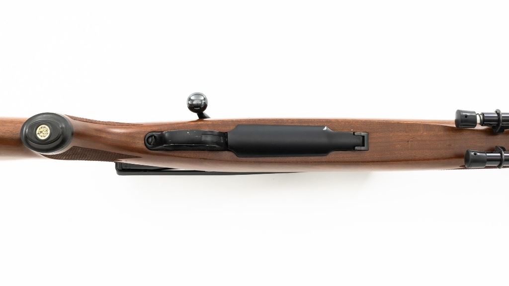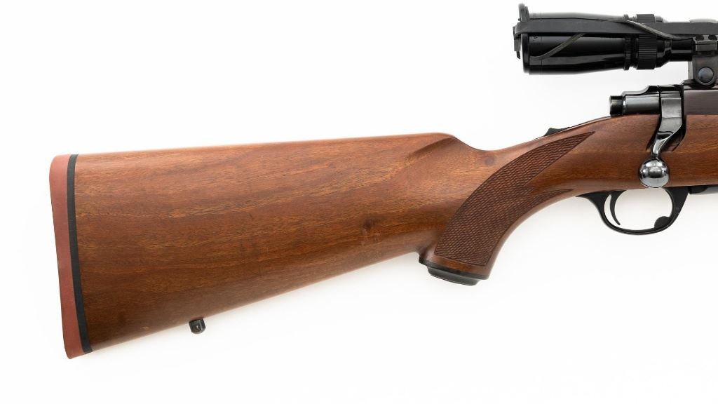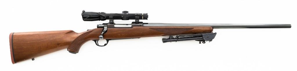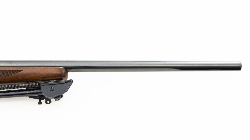 Ruger M77 Varmint Bolt Action Rifle, #74-96308, .308 Win. cal., 24" heavy barrel, with blue finish, no provision for sights with tap screws at the rear of the barrel for a sight block, checkered walnut one-piece pistol grip stock with sling eyes and Ruger grip cap, ending with a red rubber Ruger recoil pad, providing a 13.75" LOP. Rifle also features a tang safety, factory grooved receiver, and includes a Harris Model A1 ultra light bipod. Factory markings are clear, bolt is etched with matching serial number. Topped with Ruger rings and a Leupold VARI-X III 1.5-5x scope, finished in gloss black with a duplex reticle, and includes a set of rubber lens covers. Scope is in excellent condition with clear, bright optics. Mfgd 1980. Rifle is in near excellent overall condition, retaining approx. 97%-98% factory finish, with scattered light marks and scuffs. Stock is in near excellent condition with scattered light indentations and scratches. Action functions smoothly with a crisp trigger. Bore is near excellent with well-defined rifling. Est.: $600-$800. (Modern)