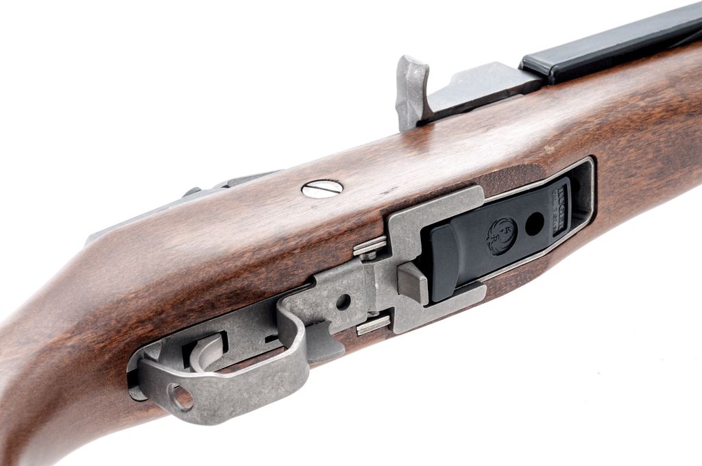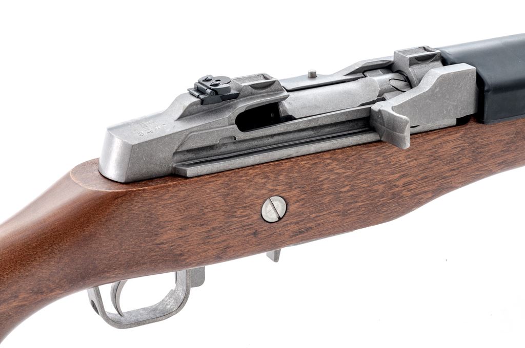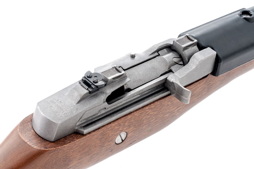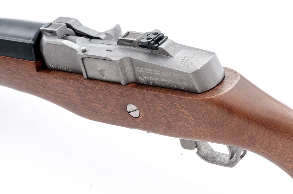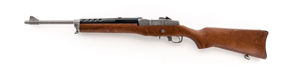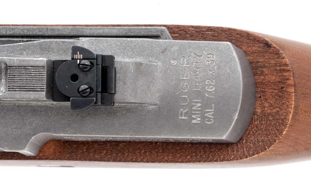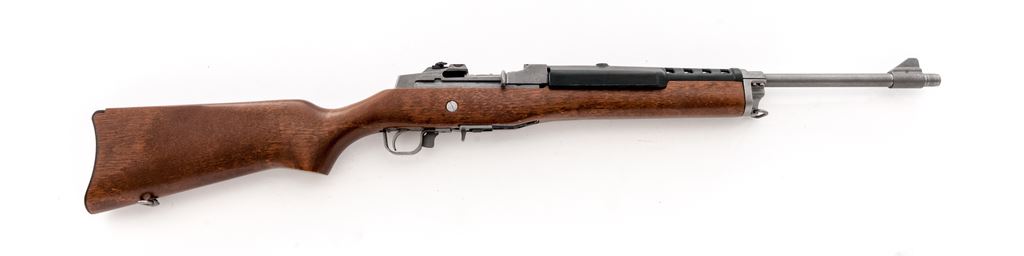 Ruger Mini-Thirty Semi-Automatic Rifle, #189-65631, 7.62x39 cal., 18.5'' barrel, stainless steel, pistol-grip hardwood stock, factory buttplate, black synthetic handguard, sling swivels, fixed blade front sight, folding rear sight, and one 5-rd. Ruger magazine. Receiver is factory grooved for Ruger scope rings. Condition is excellent; stainless metal surfaces with intermittent slight scuffs and small scratches. Stock with a few small indentations near the magazine well and otherwise appears near new. Smooth action, bright bore with sharp rifling. Est.: $600-$800. (Modern)