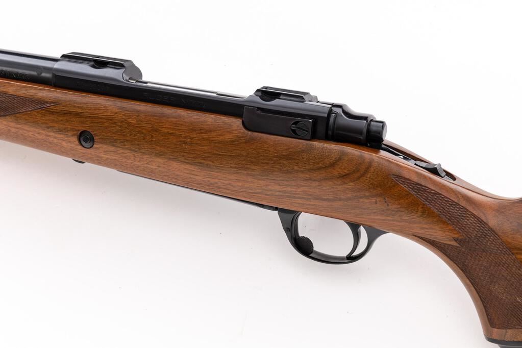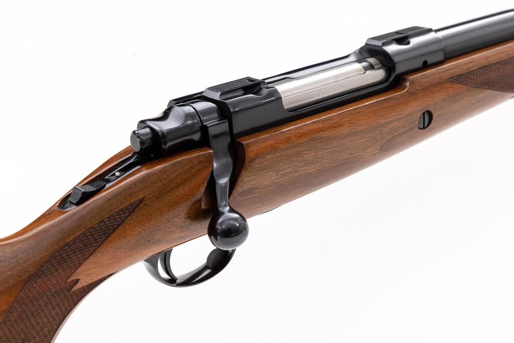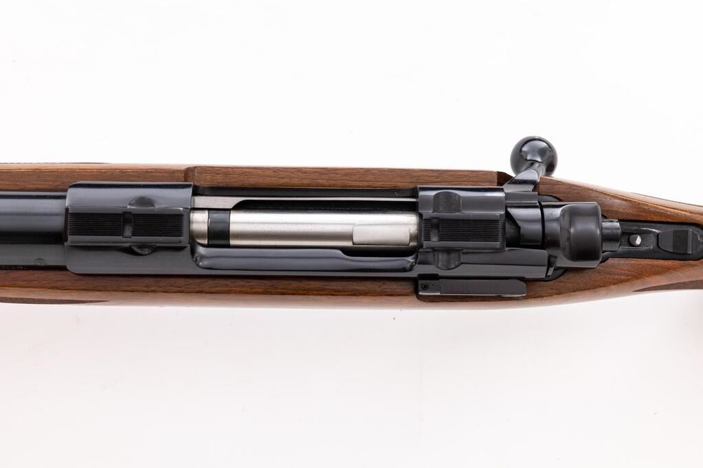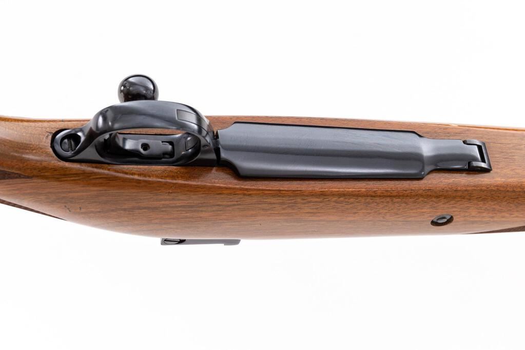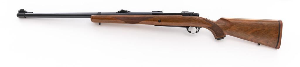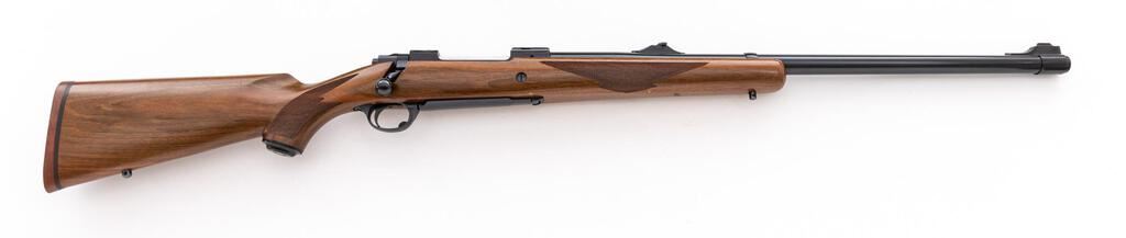 Ruger Model 77 RS African Bolt Action Sporting Rifle, .458 Win. Mag. cal., #71-12143, 24" heavy barrel, banded brass bead ramped blade front and quarter rib-mounted folding rear sights, receiver with integral factory mounts, internal 3-rd. box magazine with hinged floorplate, blue finish, tang-mounted safety, checkered walnut one-piece pistol grip stock with crossbolt added to mitigate recoil, sling studs, and a red solid rubber Ruger marked recoil pad. Mfg'd 1974. Rifle is in near excellent overall condition retaining approx. 95%-97% factory blue finish with a crisp barrel address. Stock is near excellent with light handling marks, straight grain, and a solid red Ruger recoil pad providing a 13-3/4" LOP. Bore is very good with sharp rifling. Action is crisp on this desirable Ruger dangerous game rifle. Est.: $1,000-$1,500. (Modern/PPT)