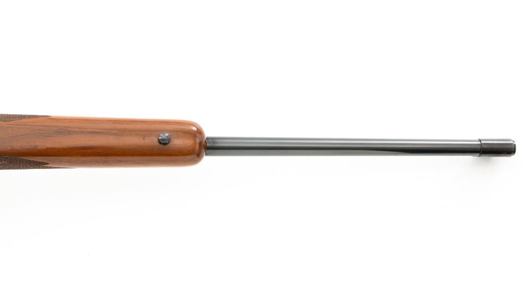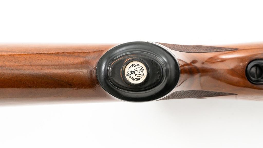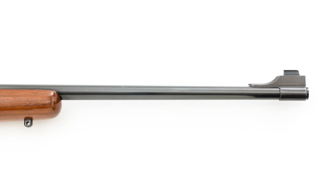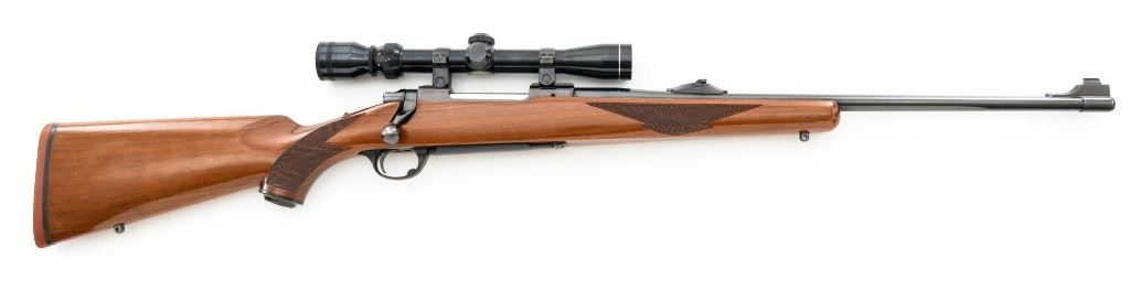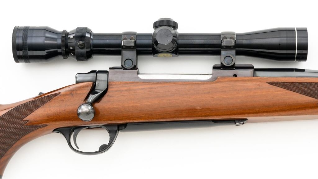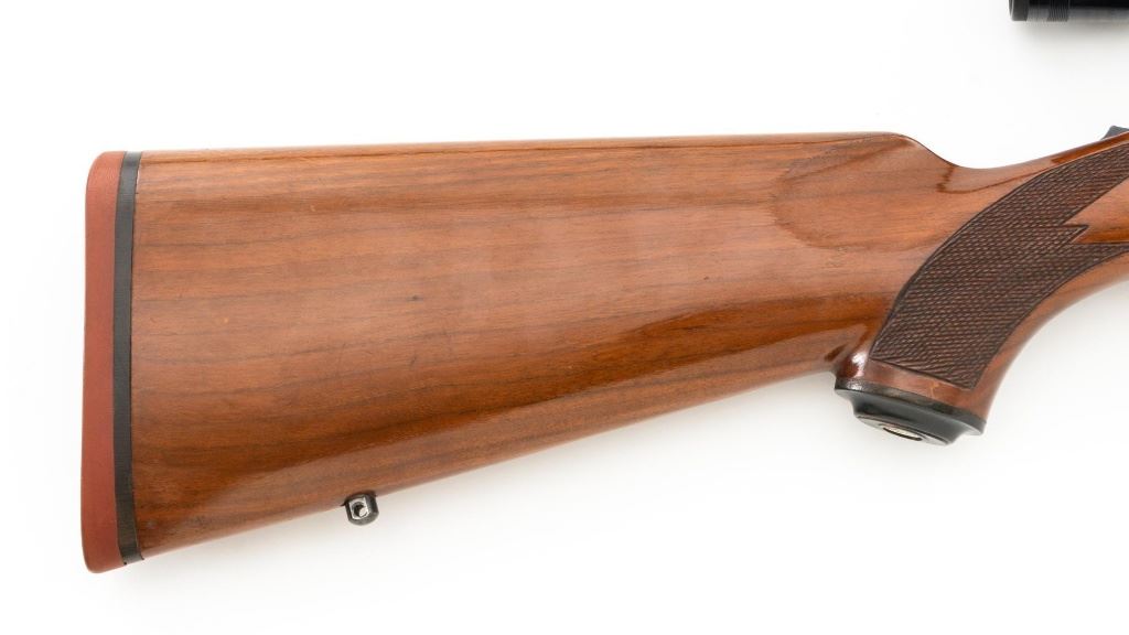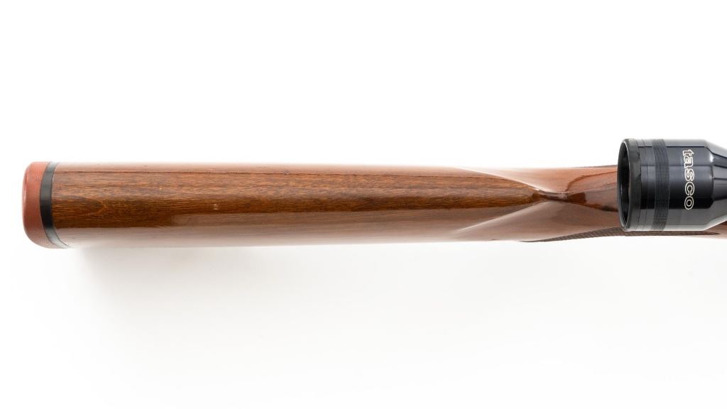 Ruger Model M77 RS Bolt Action Rifle, #72-36613, .30-06 cal., 22" barrel, with blue finish. Checkered walnut one-piece pistol grip stock with sling swivel studs, Ruger grip cap, and ends with a Ruger solid red rubber recoil pad, providing a 13.75" LOP. Rifle also features an internal magazine with hinged floorplate, factory grooved receiver, banded brass tipped blade front sight, notched folding rear sight, matching numbered bolt, and tang safety. Topped with Ruger rings and a Tasco 3-9x40mm scope, finished in gloss black with a duplex reticle. Exterior of the scope shows some typical light marks from use, optics are bright and clear. Mfgd 1976. Rifle is in near excellent overall condition, retaining approx. 96%-97% factory blue, with some light rub marks and scratches along the barrel. Receiver displays modest edgewear and has drifted to an even plum color. Stock is in near excellent condition, with scattered indentations and marks consistent with field use. Action functions smoothly with a crisp trigger. Bright bore rates near excellent with well-defined rifling. Est.: $500-$700. (Modern)