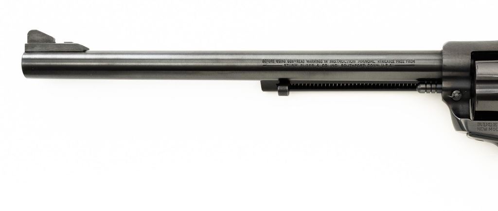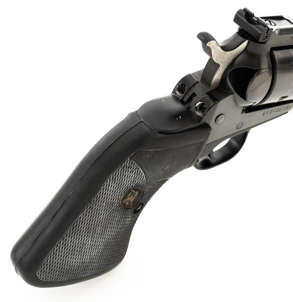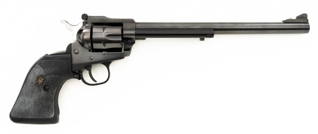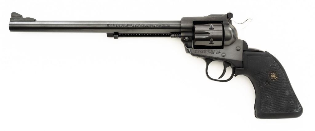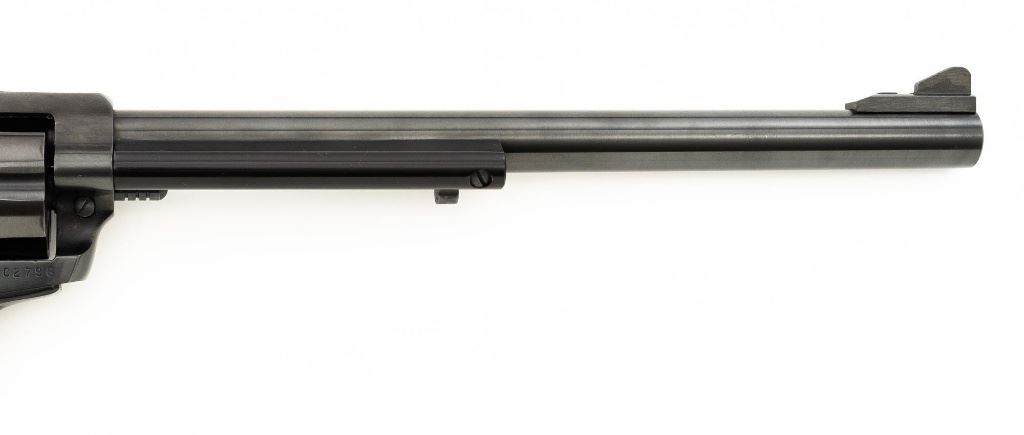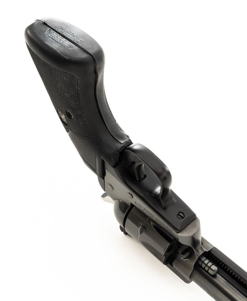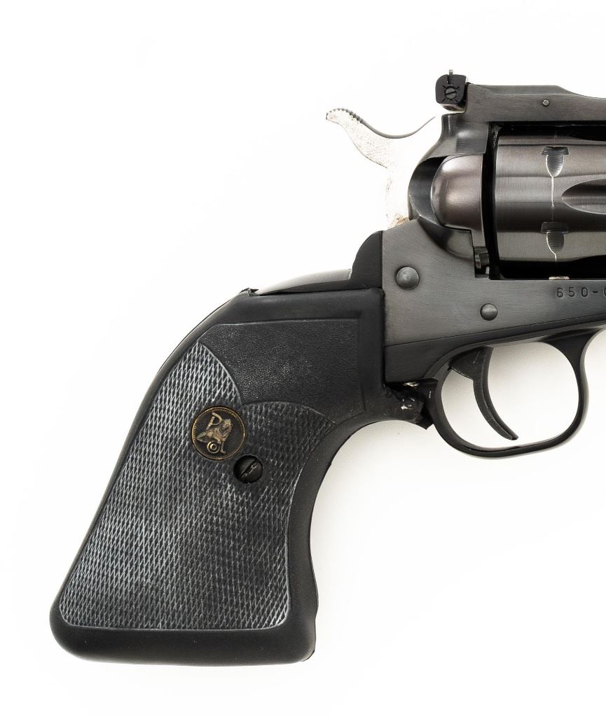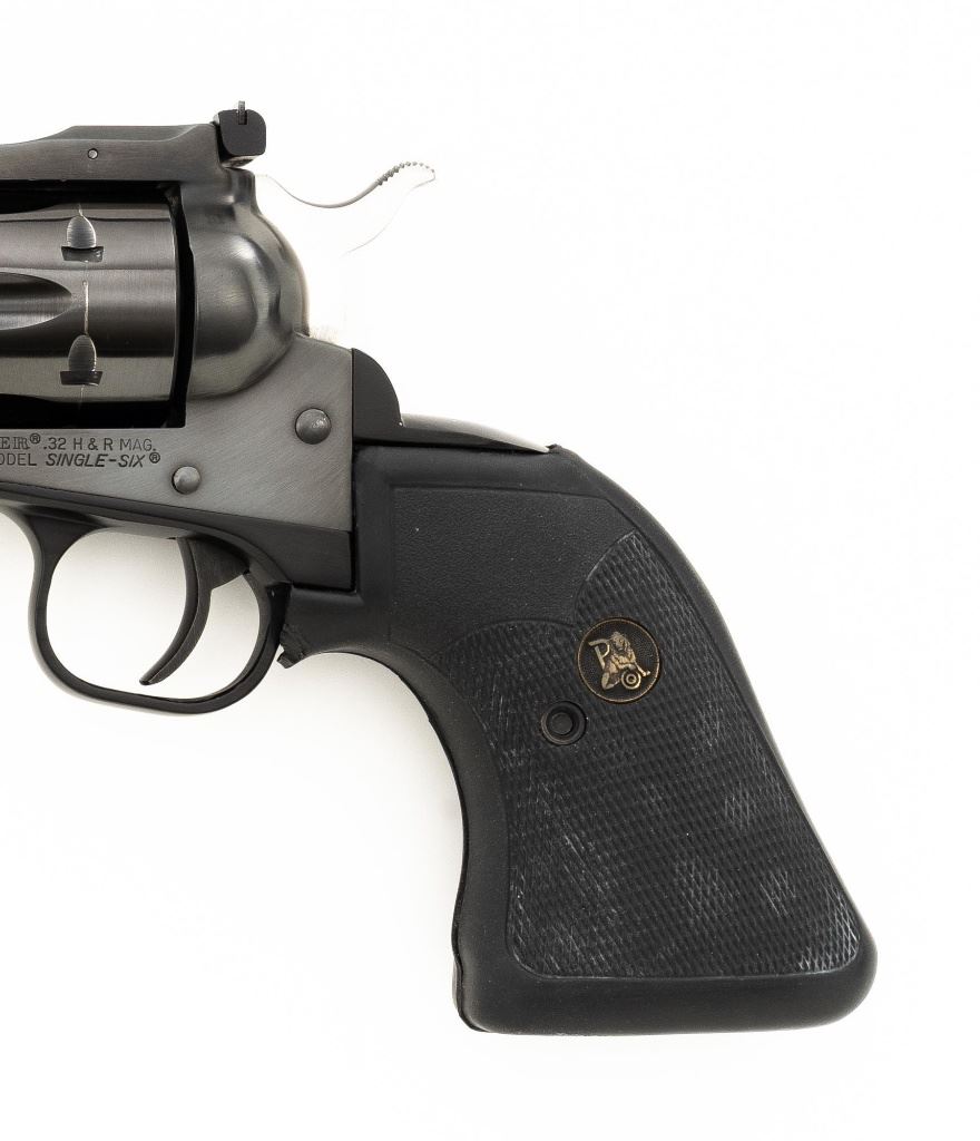 Ruger New Model Single-Six Revolver, #650-02796, .32 H&R Mag. cal., 9.5" barrel, blue finish, Pachmayr Presentation two-piece grips, fixed blade front sight, with square-notched adjustable rear sight. Mfgd 1984. Condition is near excellent, with approx 96% factory bluing remaining, loading gate has toned to a plum color. There are light handling marks and a moderate index line to the cylinder. Grips are serviceable but fit poorly at the front strap and are missing rubber on both sides of the trigger guard. Action is smooth, trigger has been lightened and breaks at just under 1lb. Bore is bright with excellent rifling. Est.: $400-$600. (Modern/PPT)