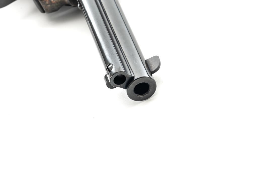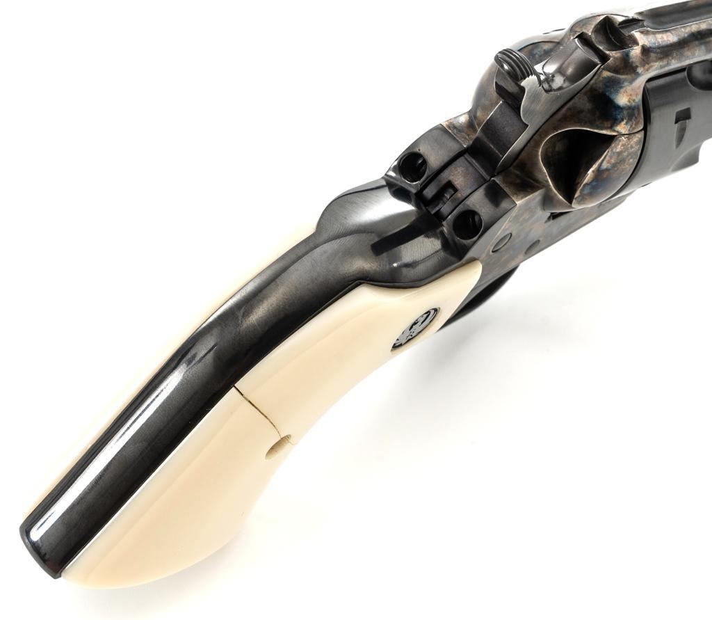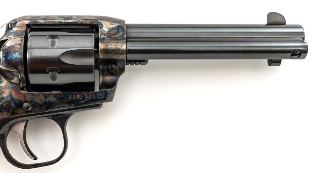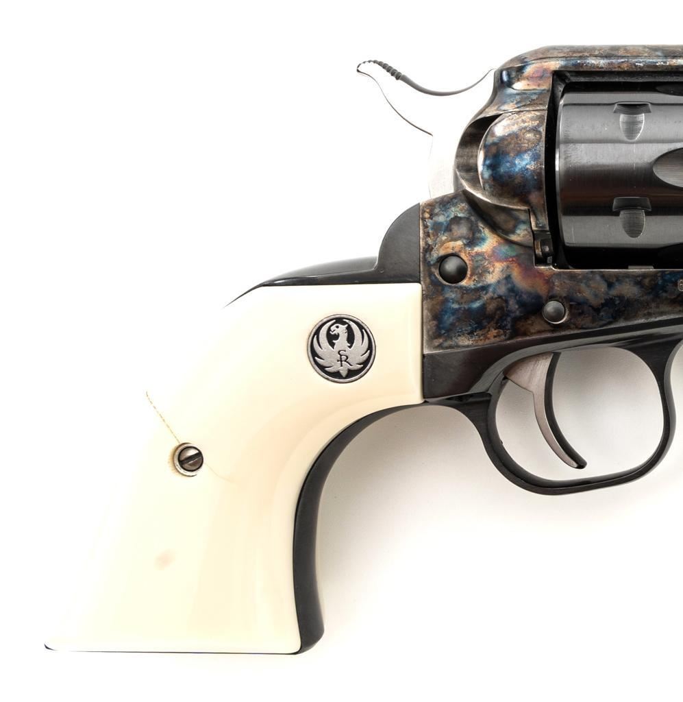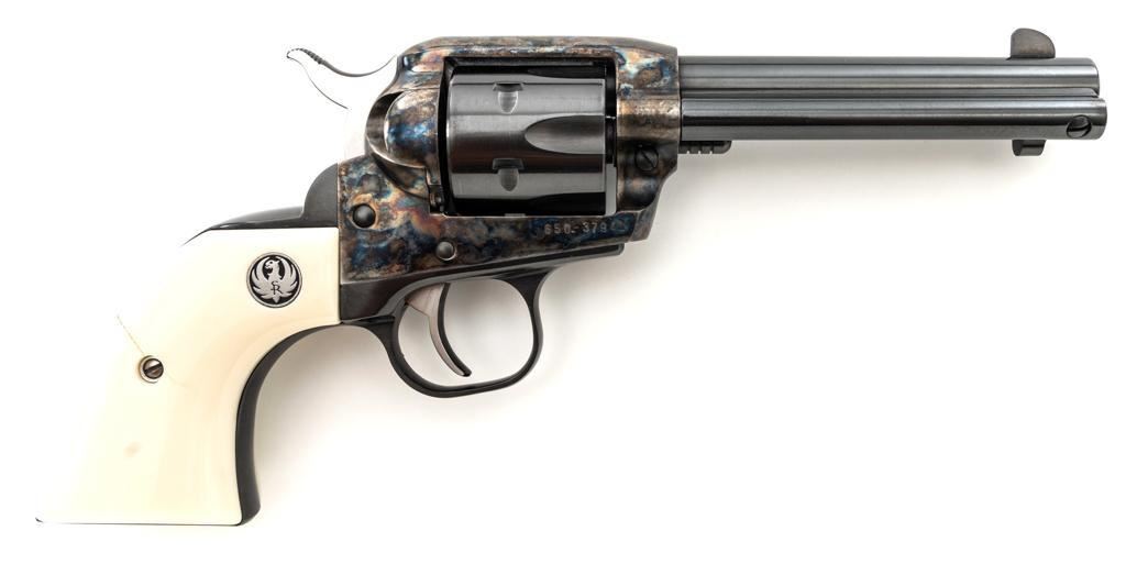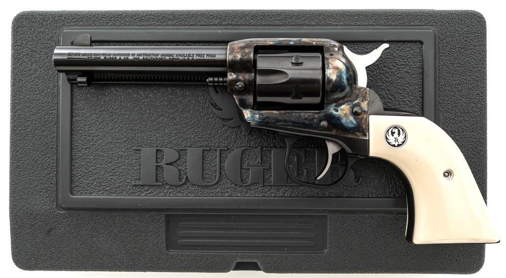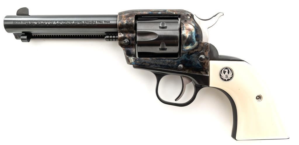 Ruger New Model Single-Six Revolver, #650-37941, .32 H&R Mag. cal., 4.6" barrel, blue finish, color case hardened frame, smooth simulated ivory grips with inlaid Ruger medallions, fixed blade front sight, and fixed notched rear sight. Mfgd 2001. In original Ruger hard plastic case with matching end label, paperwork, cable lock, and fired case. Condition is excellent with light handling marks and an extremely light index line to cylinder. Action is smooth. Bore is bright with excellent rifling. Est.: $500-$700. (Modern/PPT)