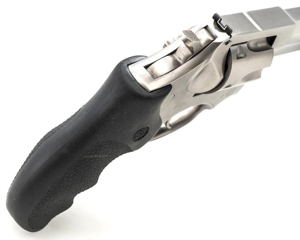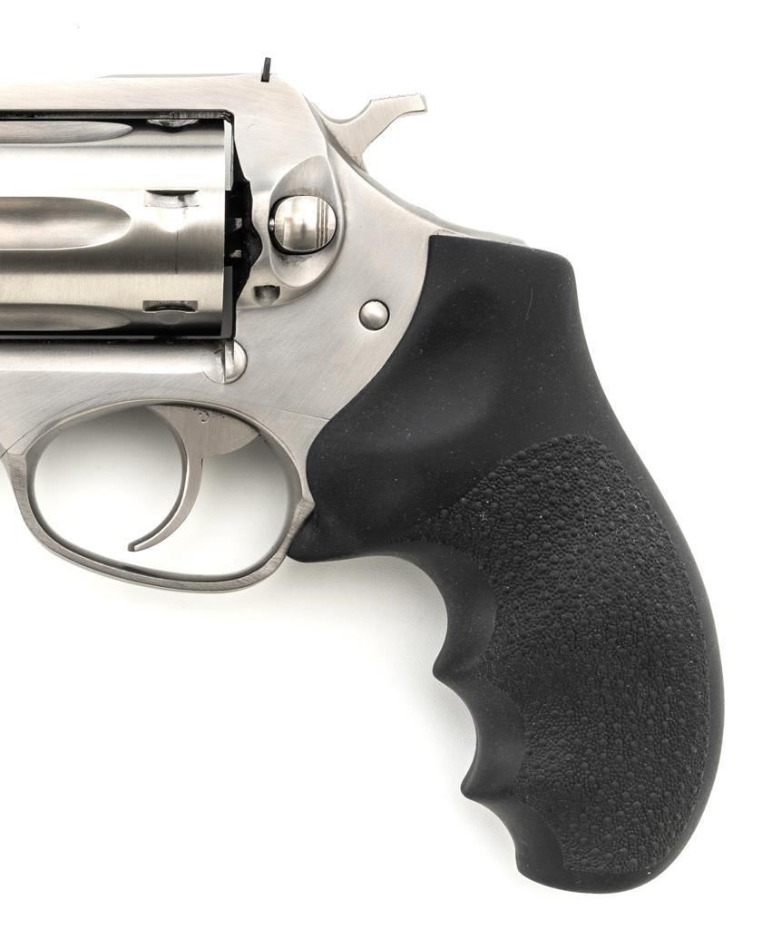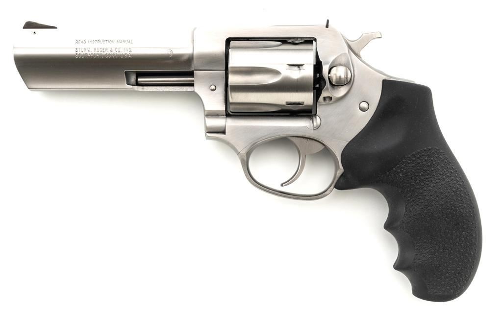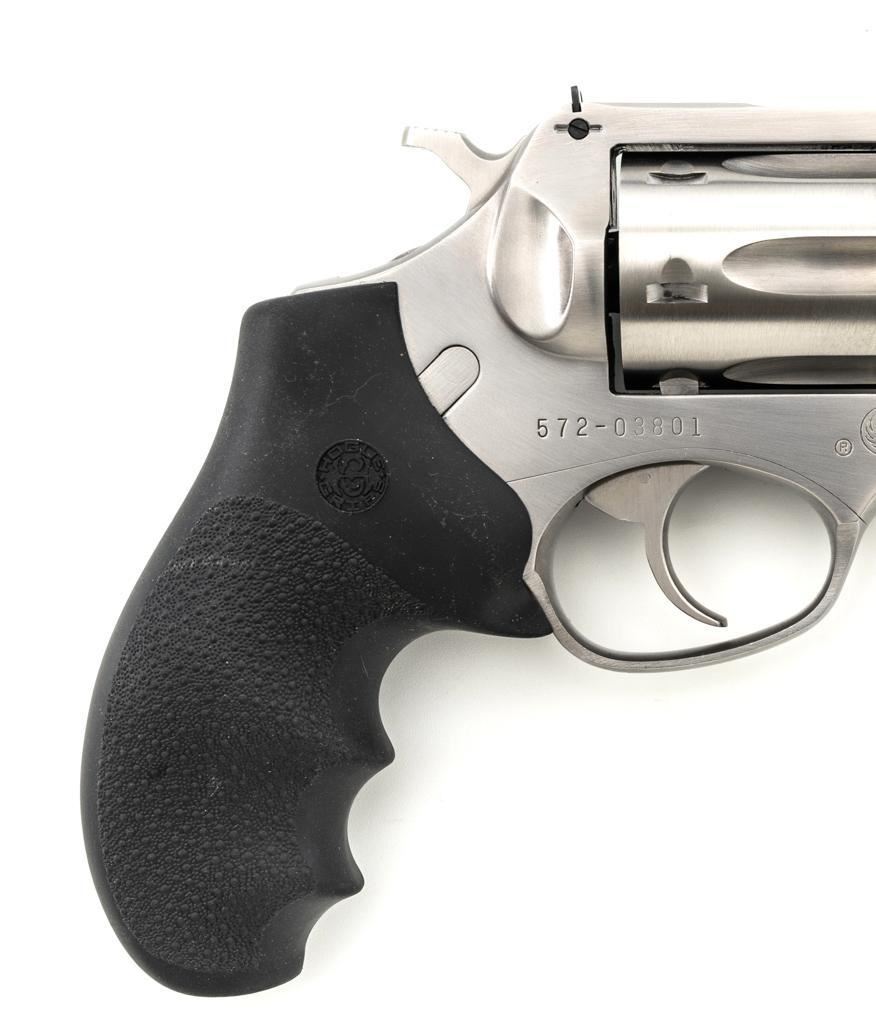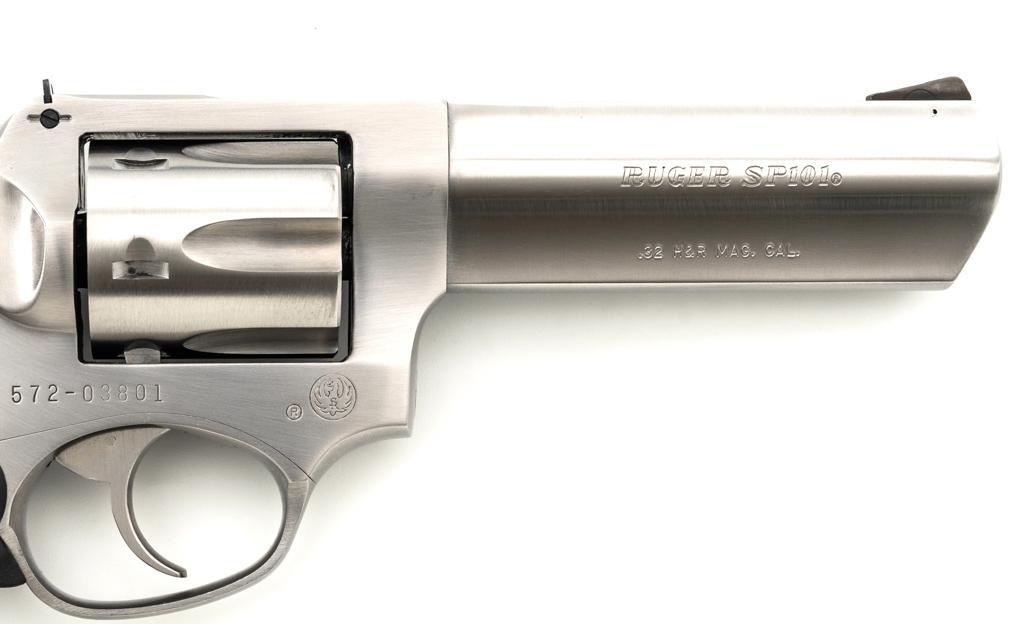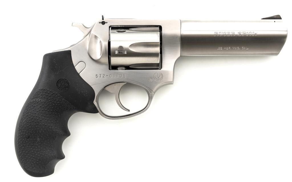 Ruger SP-101 Double Action Revolver, #572-03801, .32 H&R Mag. cal., 4" barrel, stainless steel finish, Houge black rubber Monogrip, low profile blade front, and fixed square-notched rear sight. Mfg'd 1995. Revolver is in excellent condition, showing light handling marks, faint index line on the cylinder, and light carbon fouling on the forcing cone and recoil shield. Grips are excellent. Action is smooth with a tight lock up. Bore is bright with excellent rifling but does have light lead fouling in the grooves. Est.: $400-$600. (Modern/PPT)