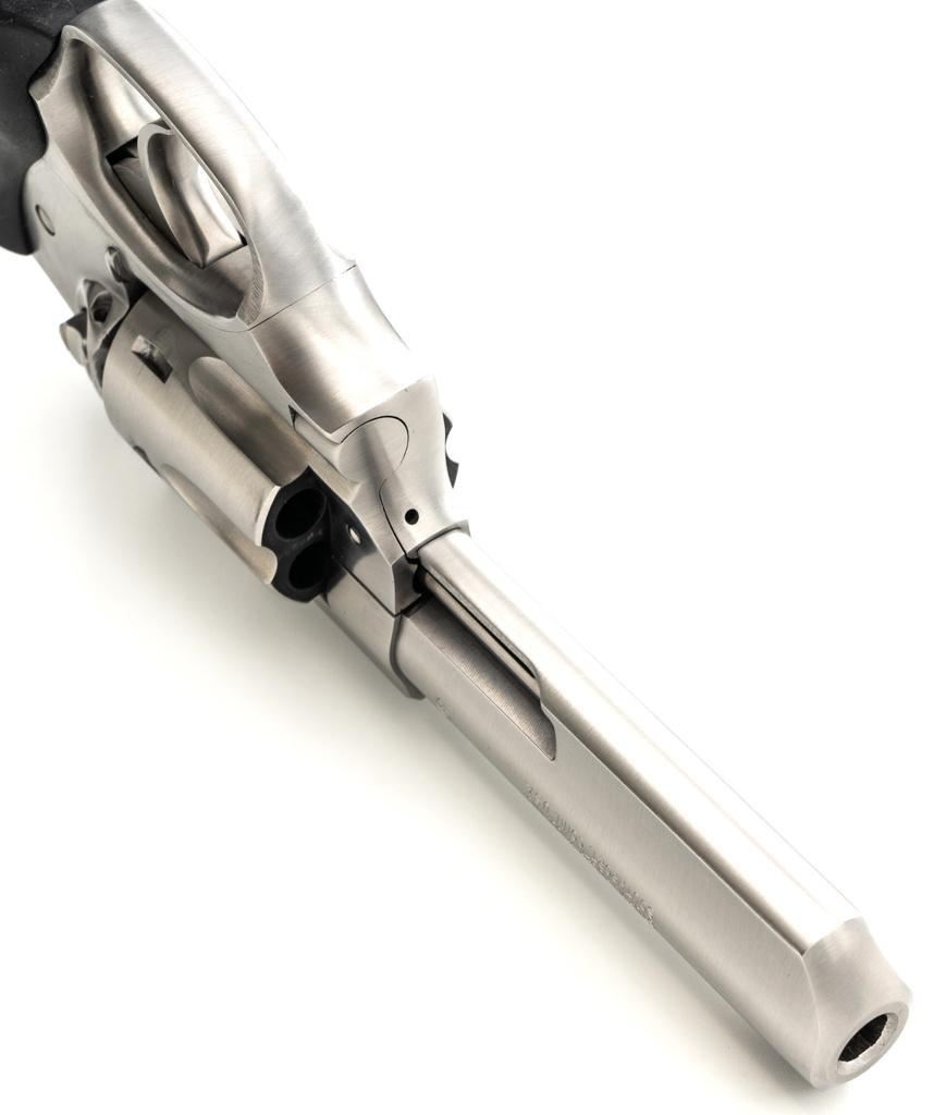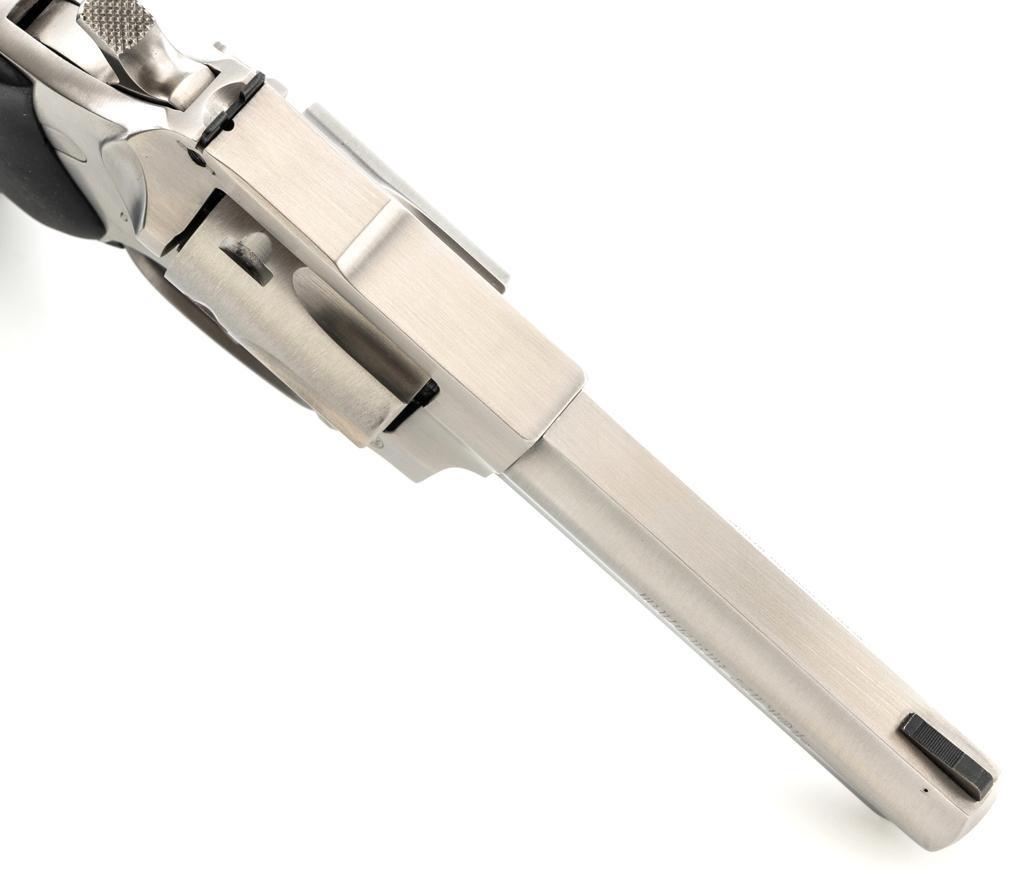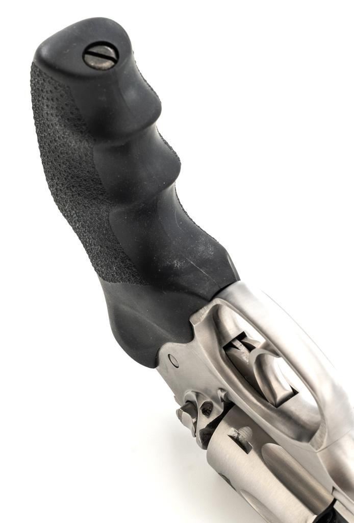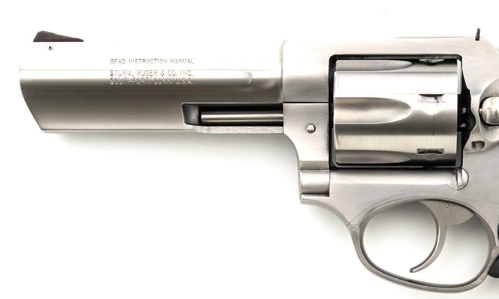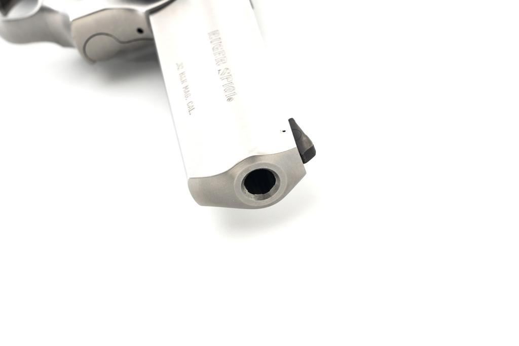 Ruger SP-101 Double Action Revolver, #572-03801, .32 H&R Mag. cal., 4" barrel, stainless steel finish, Houge black rubber Monogrip, low profile blade front, and fixed square-notched rear sight. Mfg'd 1995. Revolver is in excellent condition, showing light handling marks, faint index line on the cylinder, and light carbon fouling on the forcing cone and recoil shield. Grips are excellent. Action is smooth with a tight lock up. Bore is bright with excellent rifling but does have light lead fouling in the grooves. Est.: $400-$600. (Modern/PPT)