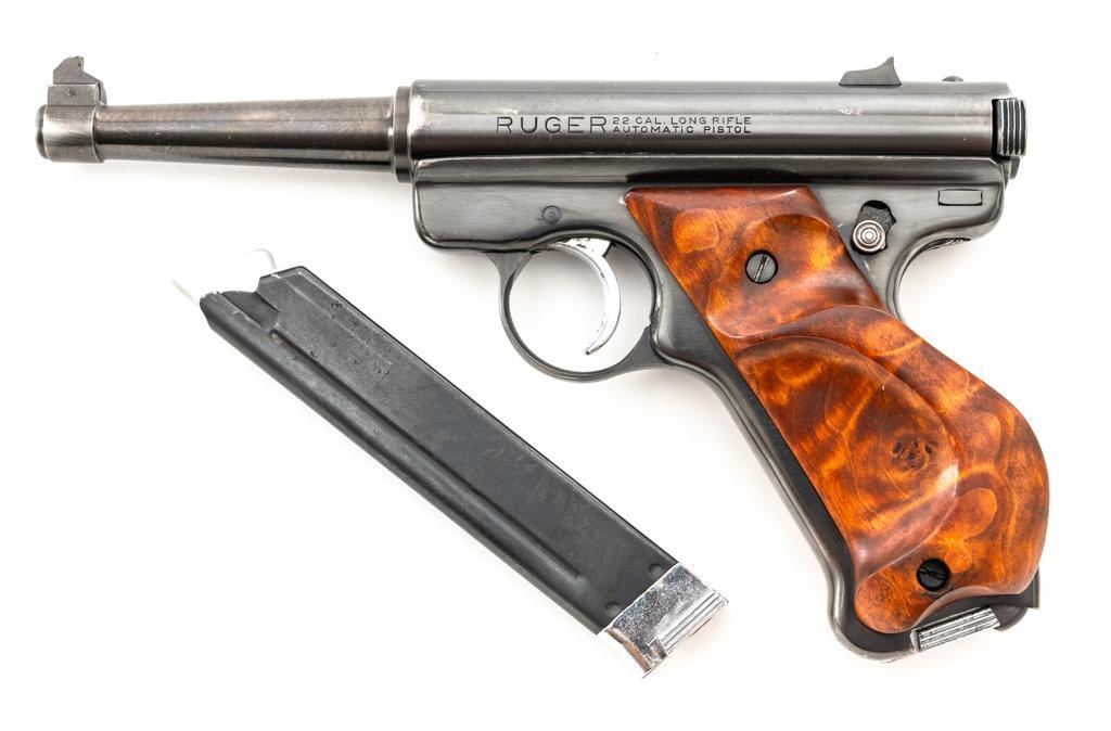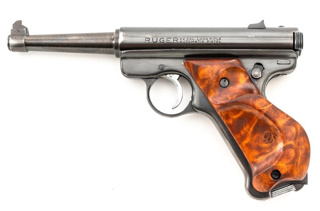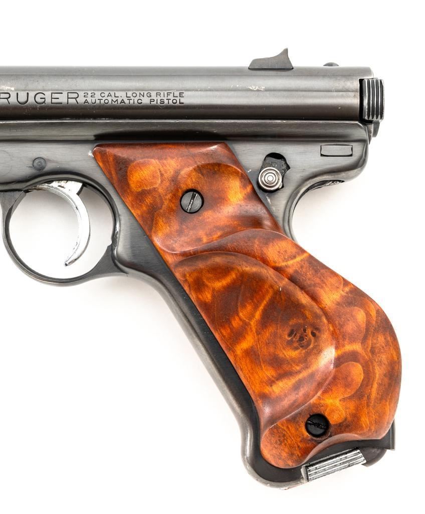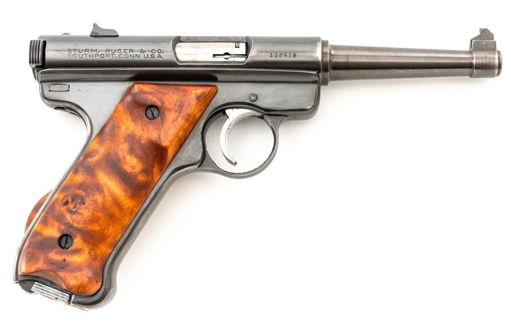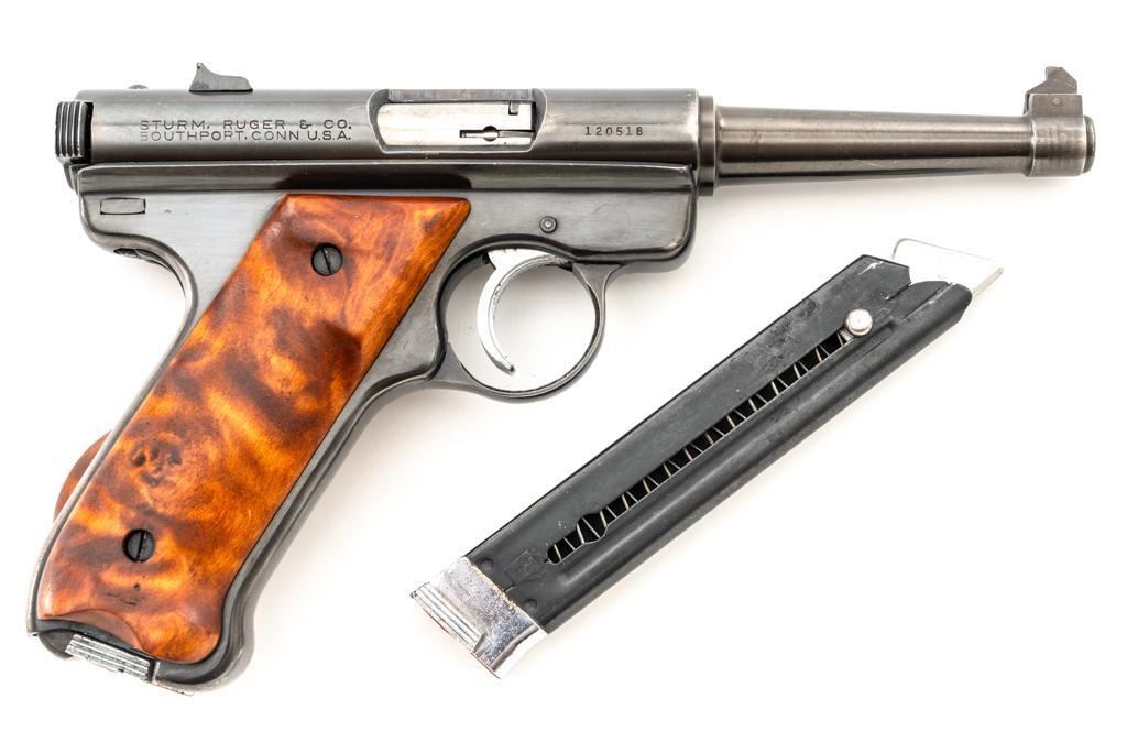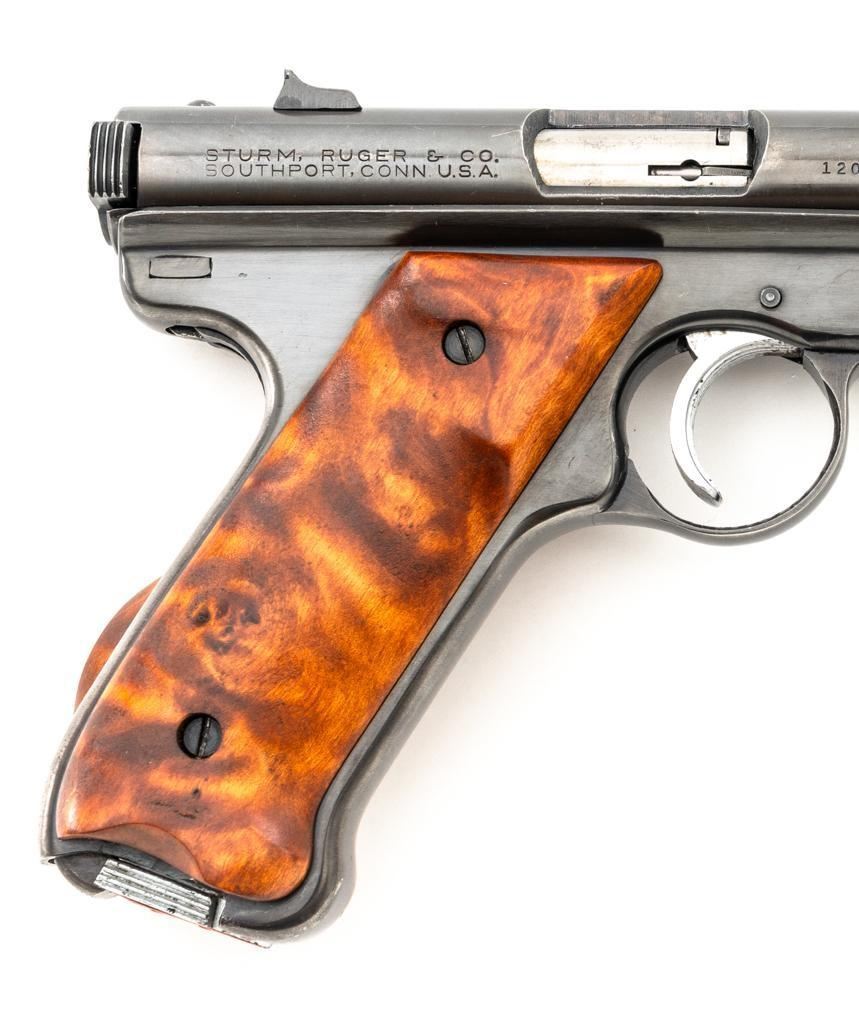 Ruger Standard Model Semi-Automatic Pistol, #120518, .22 LR cal., 4.9" tapered barrel, blued finish, custom smooth burl wood thumbrest grips, Patridge front sight, with square-notched fixed rear sight. Includes two (2) 10-round Ruger magazines. Mfg'd 1958. Overall condition is good, showing signs of moderate handling and range use. Blued surfaces show general thinning/wear and toning. Grips are in very good condition, with light handling wear and a few small nicks. Action is smooth. Bore rates very good overall and is bright with well-defined rifling. Est.: $200-$300. (C&R/PPT)