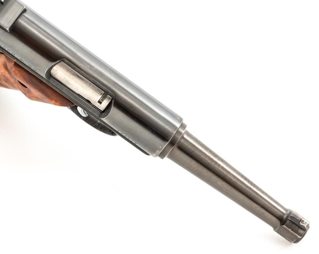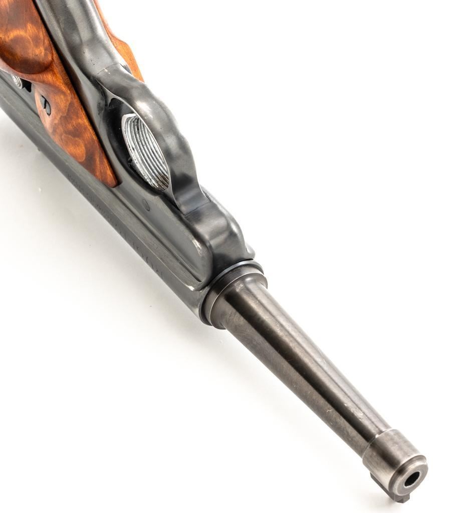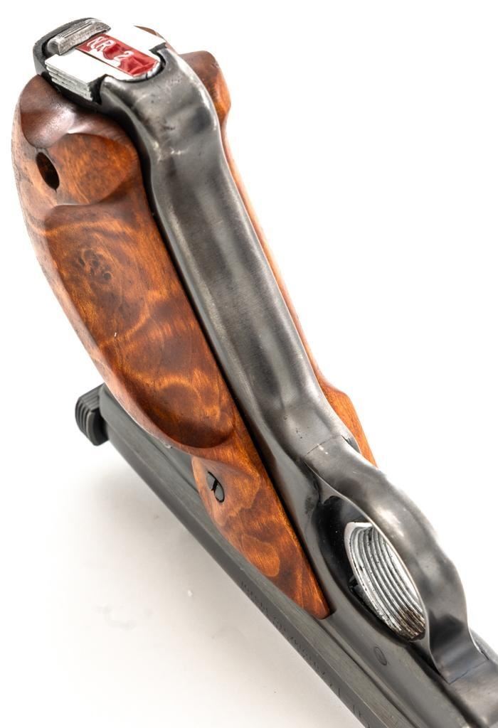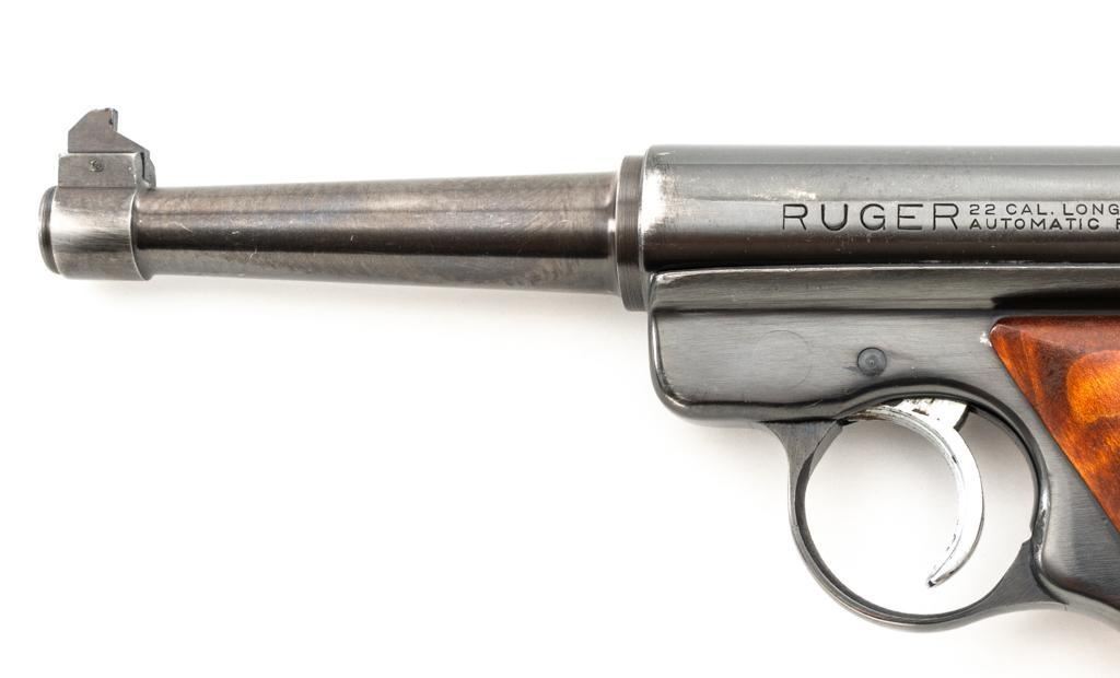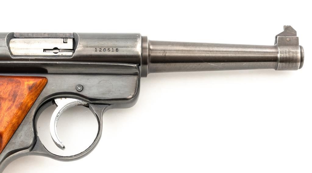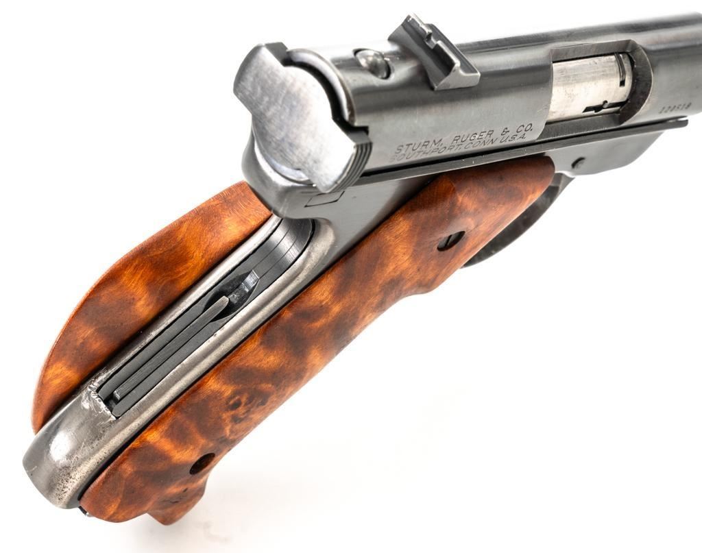 Ruger Standard Model Semi-Automatic Pistol, #120518, .22 LR cal., 4.9" tapered barrel, blued finish, custom smooth burl wood thumbrest grips, Patridge front sight, with square-notched fixed rear sight. Includes two (2) 10-round Ruger magazines. Mfg'd 1958. Overall condition is good, showing signs of moderate handling and range use. Blued surfaces show general thinning/wear and toning. Grips are in very good condition, with light handling wear and a few small nicks. Action is smooth. Bore rates very good overall and is bright with well-defined rifling. Est.: $200-$300. (C&R/PPT)