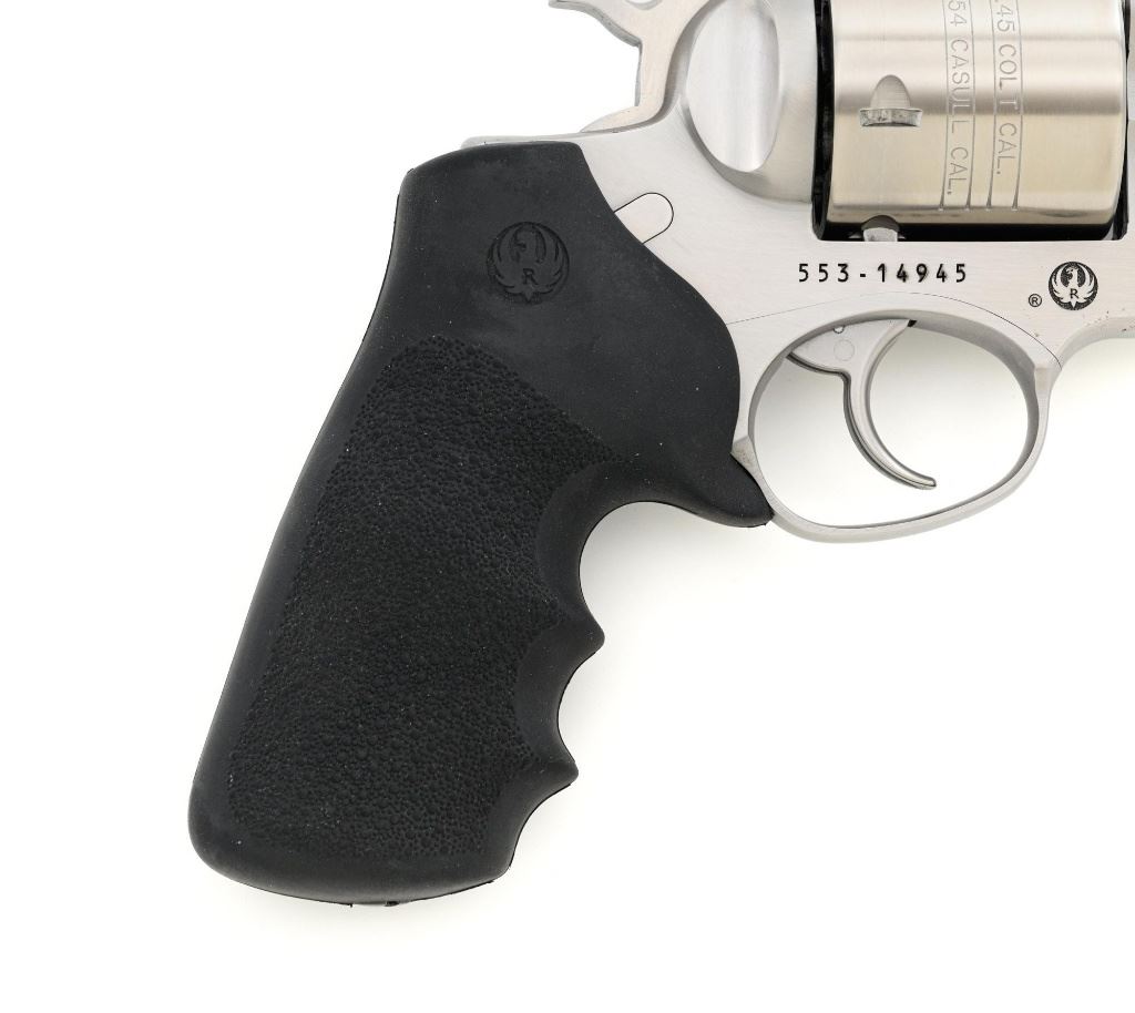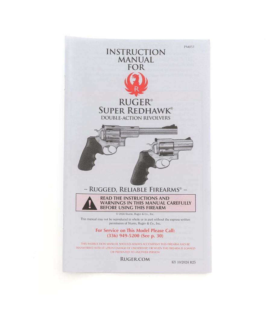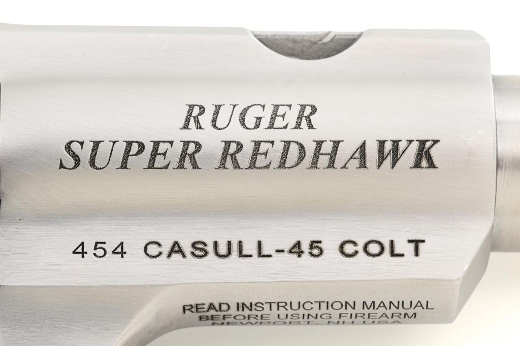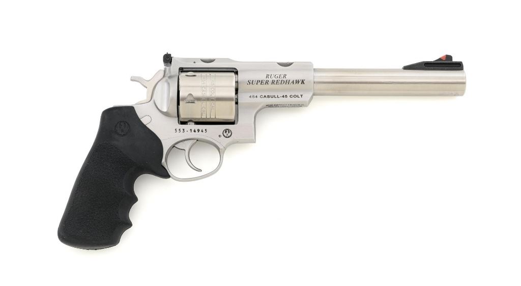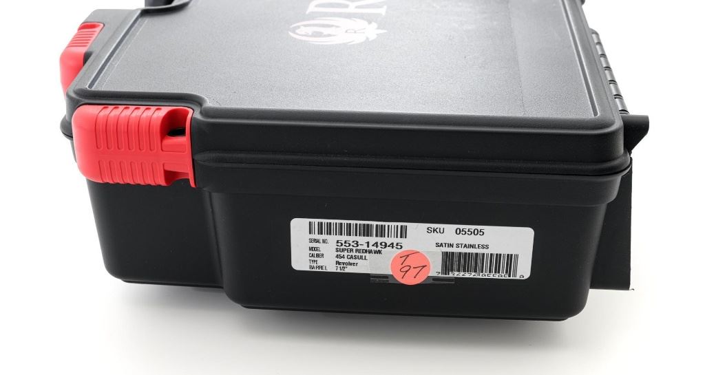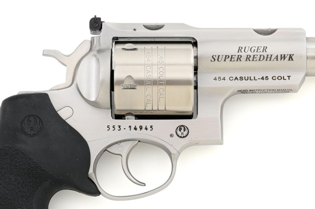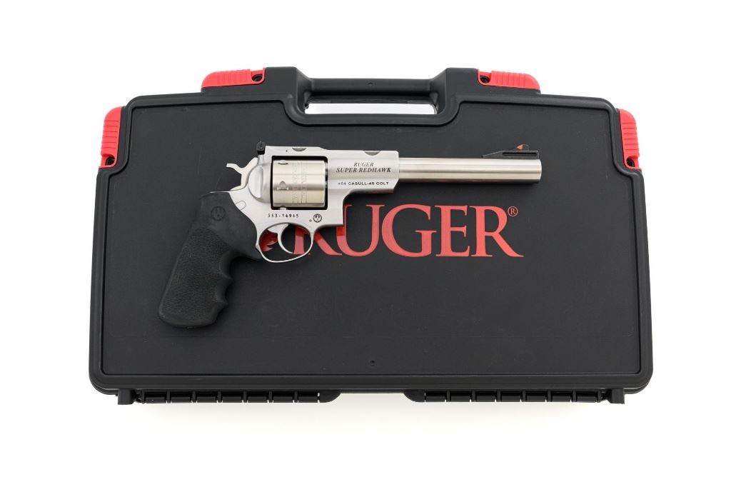 Ruger Super Redhawk Double Action Revolver, #553-14945, .454 Casull cal., 7.5" barrel, satin stainless steel finish, textured rubber one-piece Ruger combat grips, red insert ramped blade front sight, adjustable white-outline square-notch rear sight, and integral scope mounts. Includes Ruger plastic hard case with matching end label, instruction manual, warranty card, cable lock and associated packaging materials. Mfgd 2025. Revolver is in near excellent overall condition, with intermittent light scratches and scuffs associated with moderate range use. Integral mounts show light wear and minor scratches. Cylinder displays a light index line. Grips are in excellent condition, showing little use. Action is crisp and functions well. Bore is mirror bright with excellent rifling. Est.: $800-$1,200. (Modern/PPT)