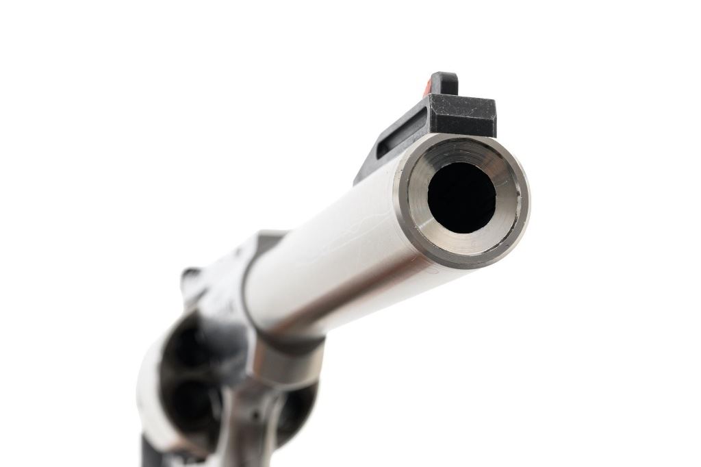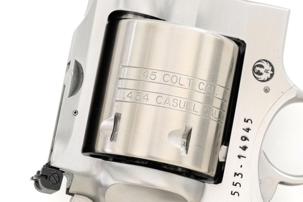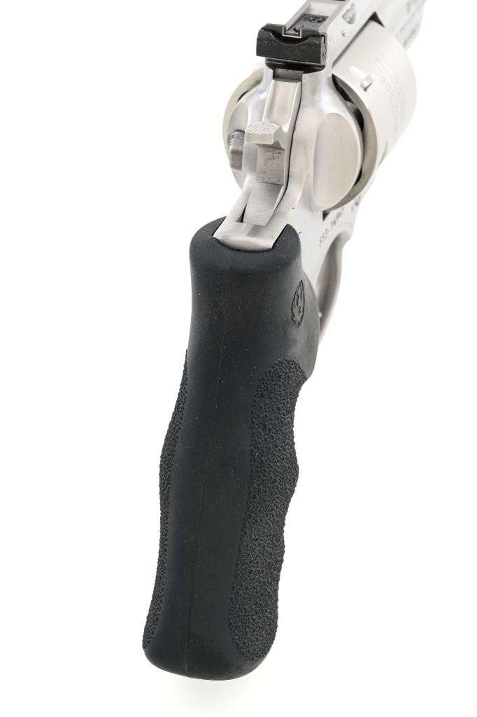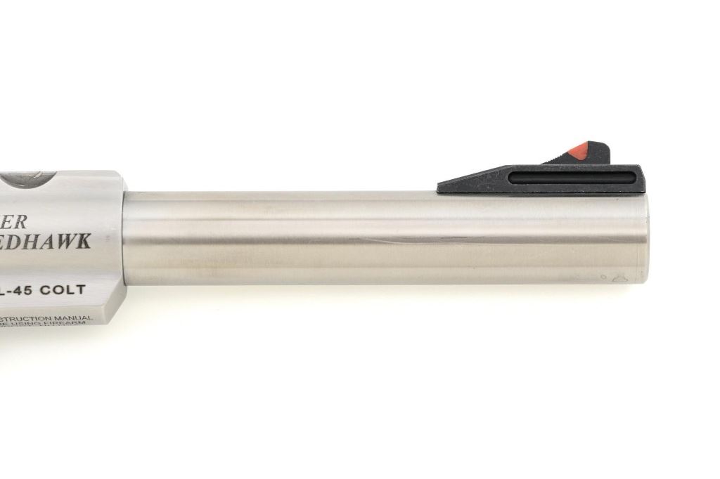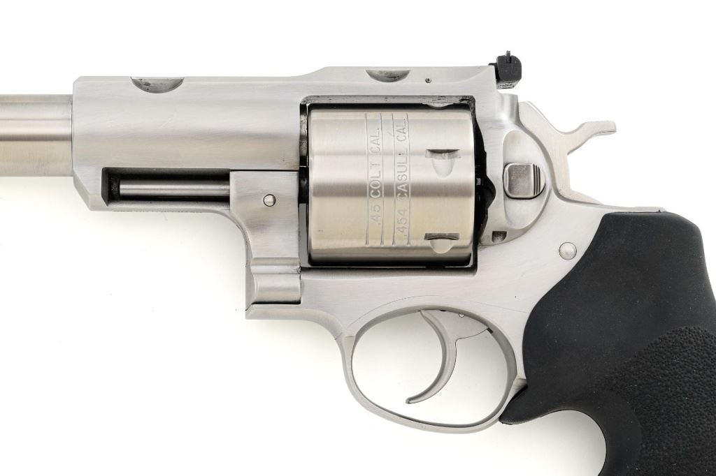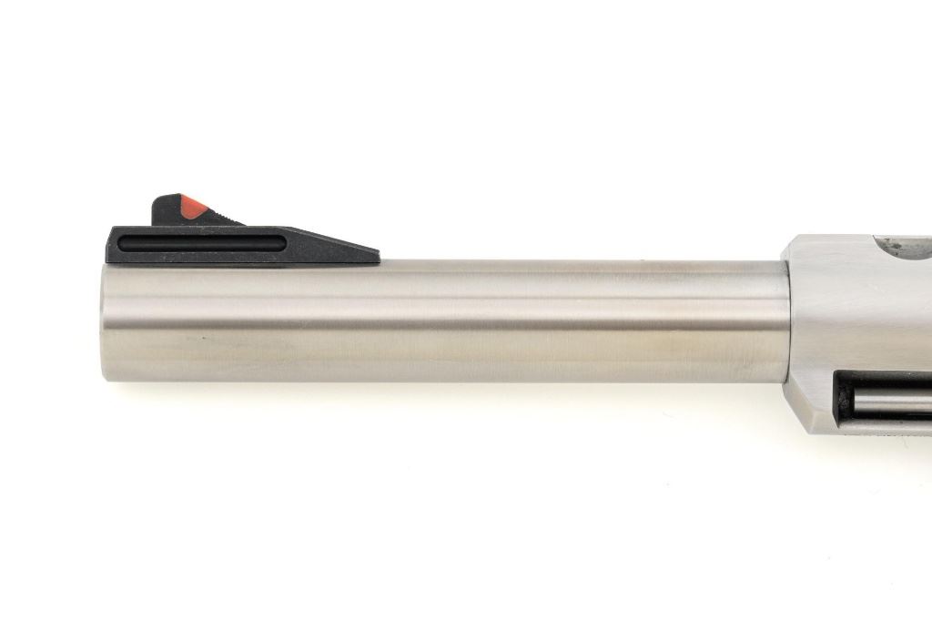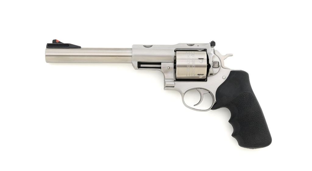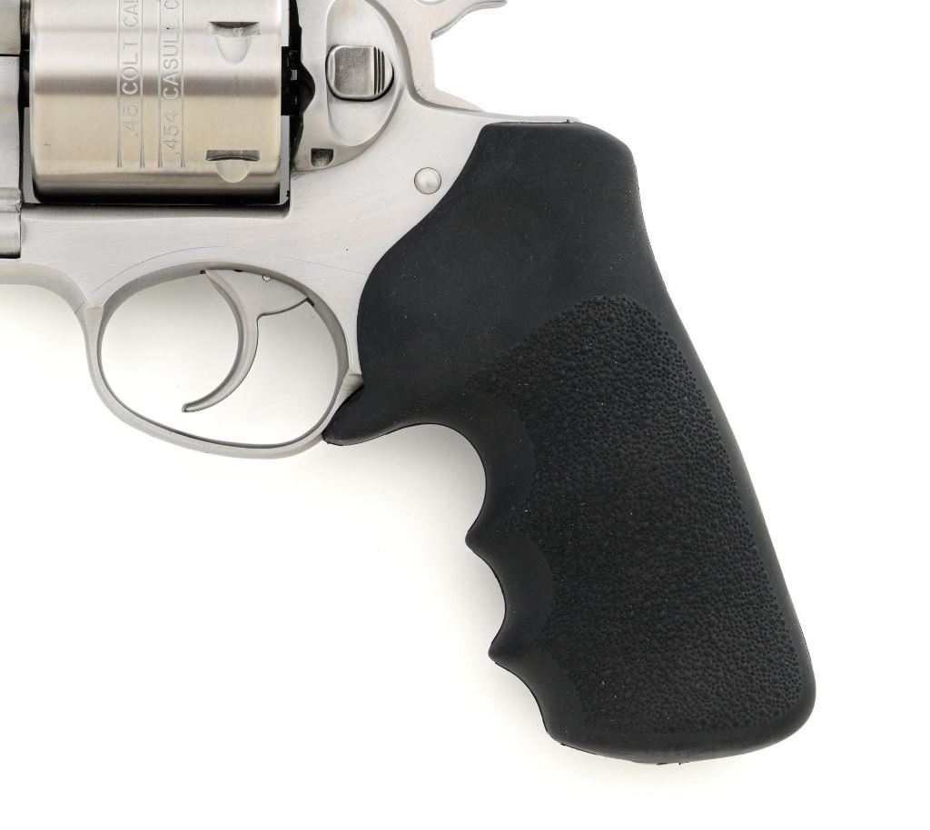 Ruger Super Redhawk Double Action Revolver, #553-14945, .454 Casull cal., 7.5" barrel, satin stainless steel finish, textured rubber one-piece Ruger combat grips, red insert ramped blade front sight, adjustable white-outline square-notch rear sight, and integral scope mounts. Includes Ruger plastic hard case with matching end label, instruction manual, warranty card, cable lock and associated packaging materials. Mfgd 2025. Revolver is in near excellent overall condition, with intermittent light scratches and scuffs associated with moderate range use. Integral mounts show light wear and minor scratches. Cylinder displays a light index line. Grips are in excellent condition, showing little use. Action is crisp and functions well. Bore is mirror bright with excellent rifling. Est.: $800-$1,200. (Modern/PPT)