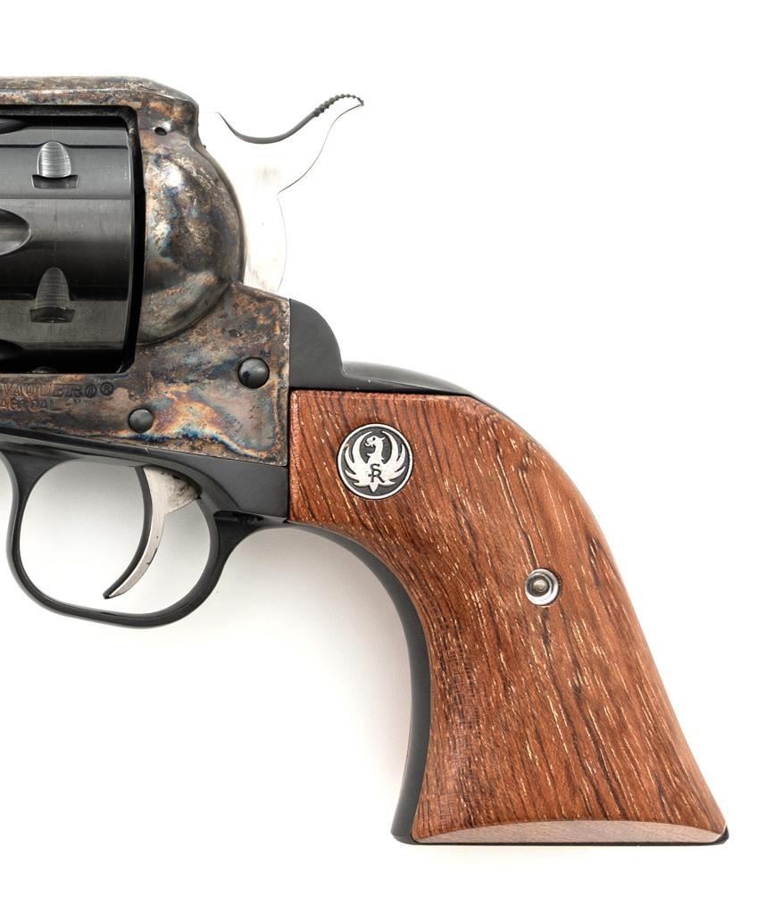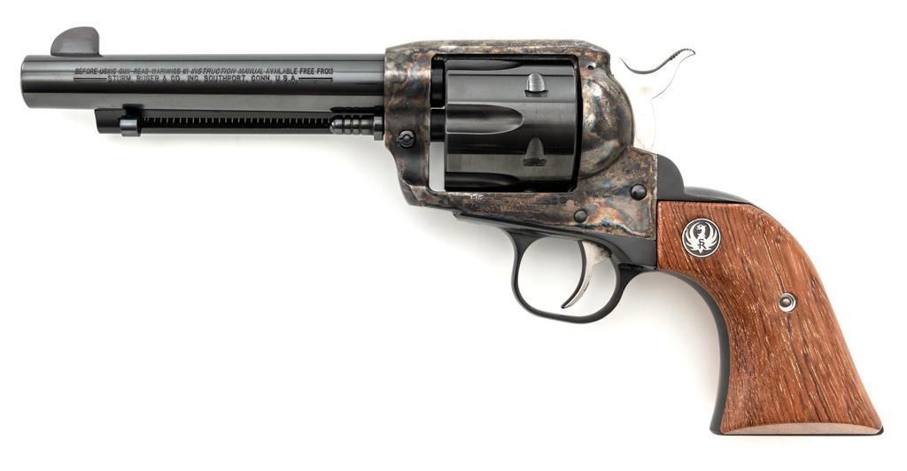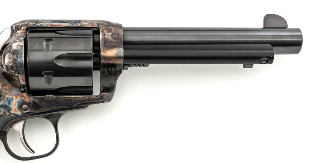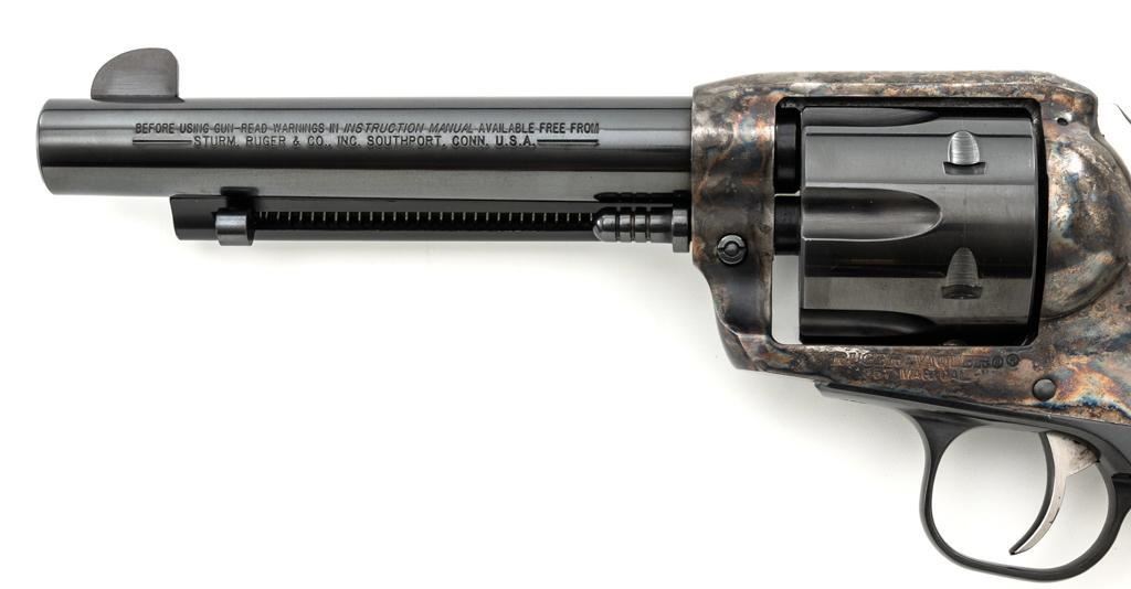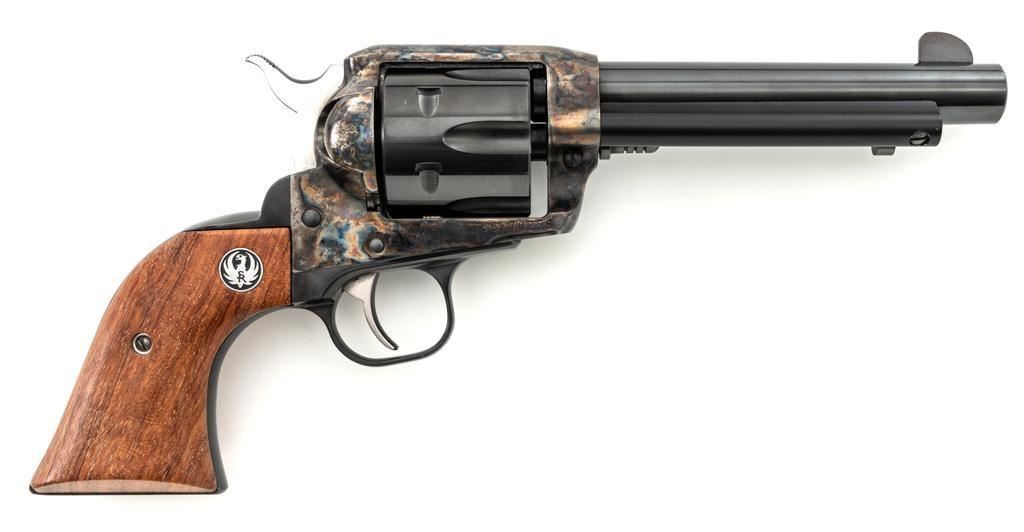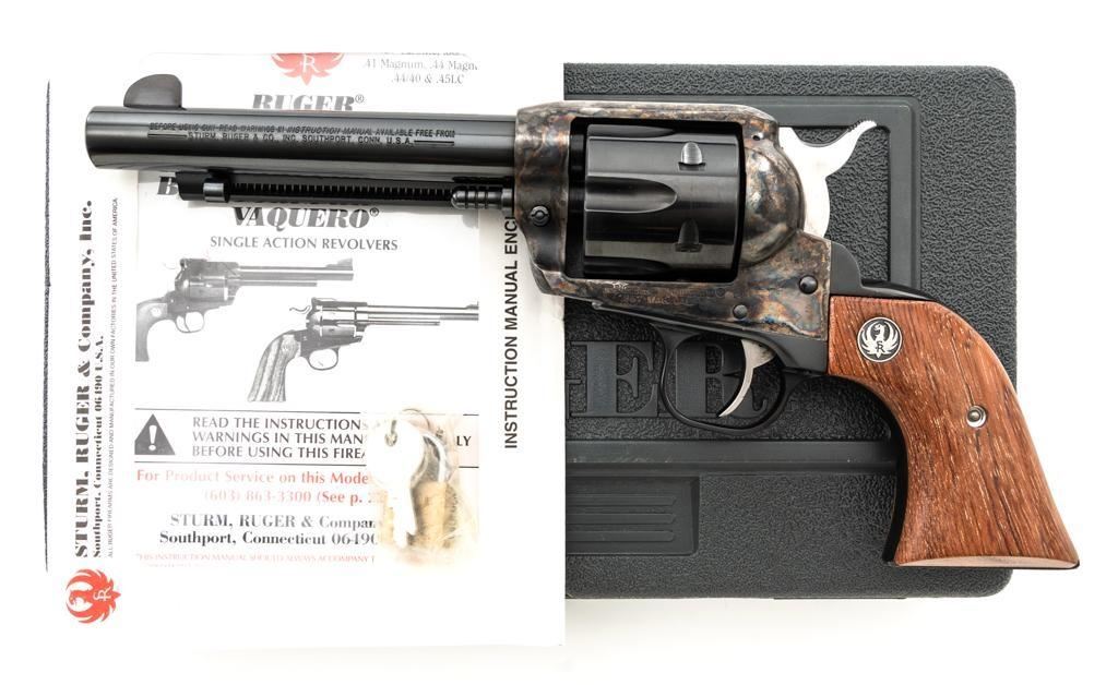 Ruger Vaquero Single Action Revolver, #56-70258, .357 Mag. cal., 5.5" barrel, blue finish, color case hardened frame, smooth rosewood grips with Ruger "silver eagle" medallions, and standard fixed sights. Mfgd 1999. Includes Ruger plastic case, instruction manual, and lock. Condition is excellent, with light index line on cylinder, crisp factory lettering, and light handling marks. There is faint etching to the color case hardened finish on the frame. Wood grips are in excellent condition with a few light handling marks. Action cycles smoothly and locks up securely. Bore is bright with excellent rifling. Est.: $450-$650. (Modern/PPT)