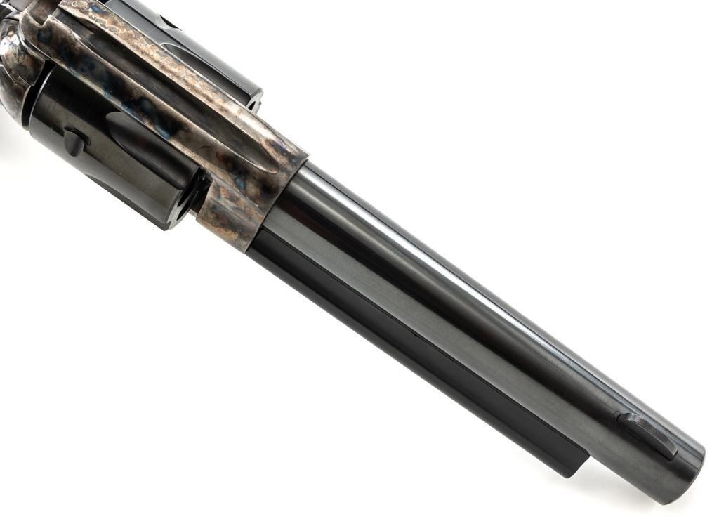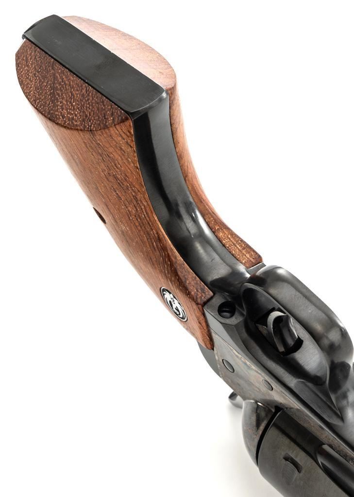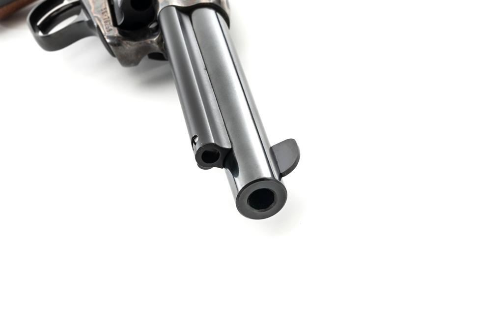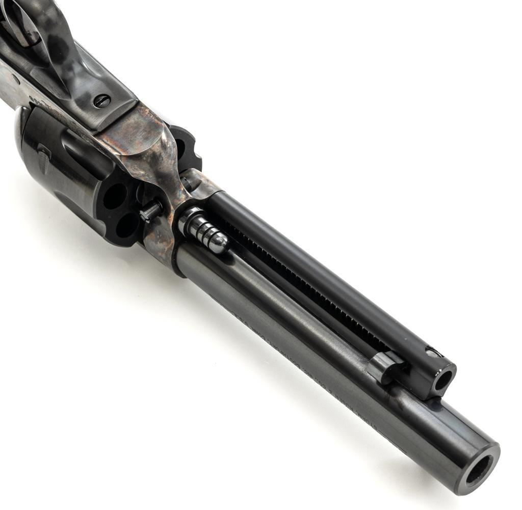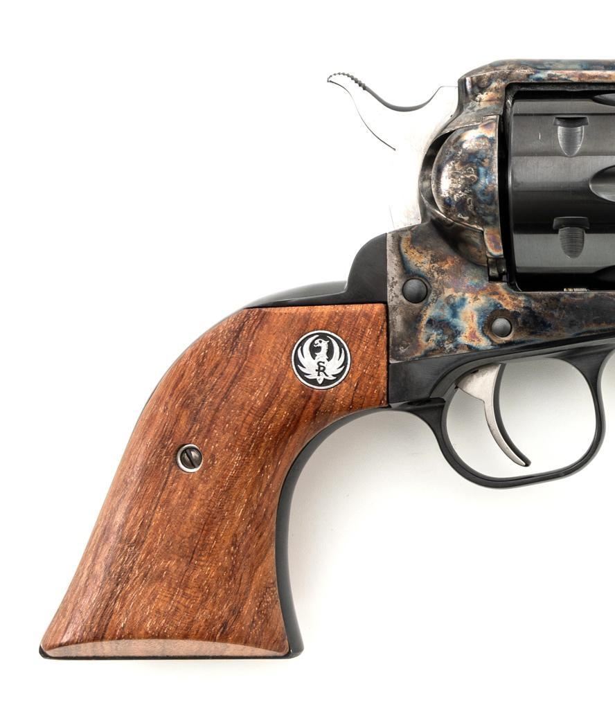 Ruger Vaquero Single Action Revolver, #56-70258, .357 Mag. cal., 5.5" barrel, blue finish, color case hardened frame, smooth rosewood grips with Ruger "silver eagle" medallions, and standard fixed sights. Mfgd 1999. Includes Ruger plastic case, instruction manual, and lock. Condition is excellent, with light index line on cylinder, crisp factory lettering, and light handling marks. There is faint etching to the color case hardened finish on the frame. Wood grips are in excellent condition with a few light handling marks. Action cycles smoothly and locks up securely. Bore is bright with excellent rifling. Est.: $450-$650. (Modern/PPT)