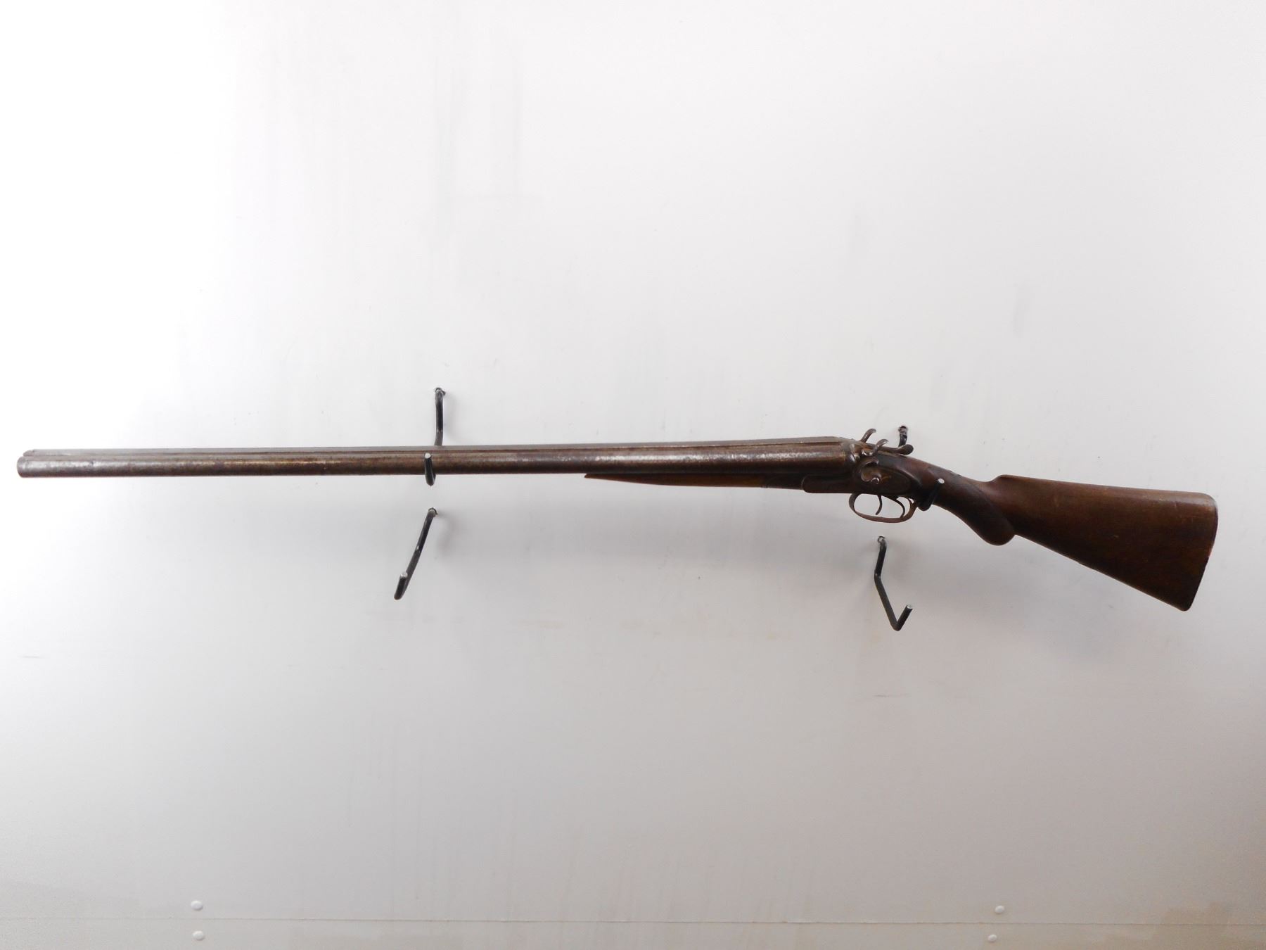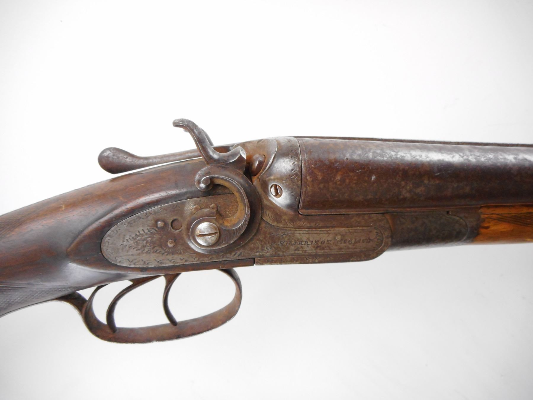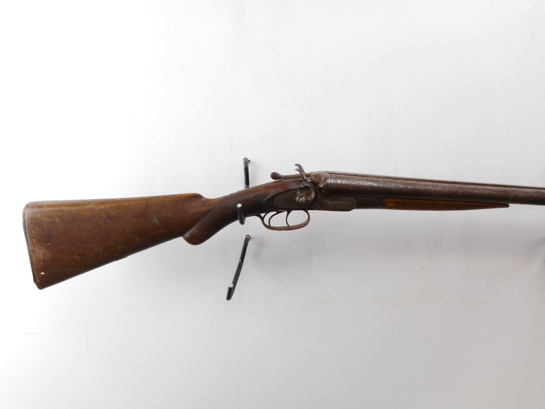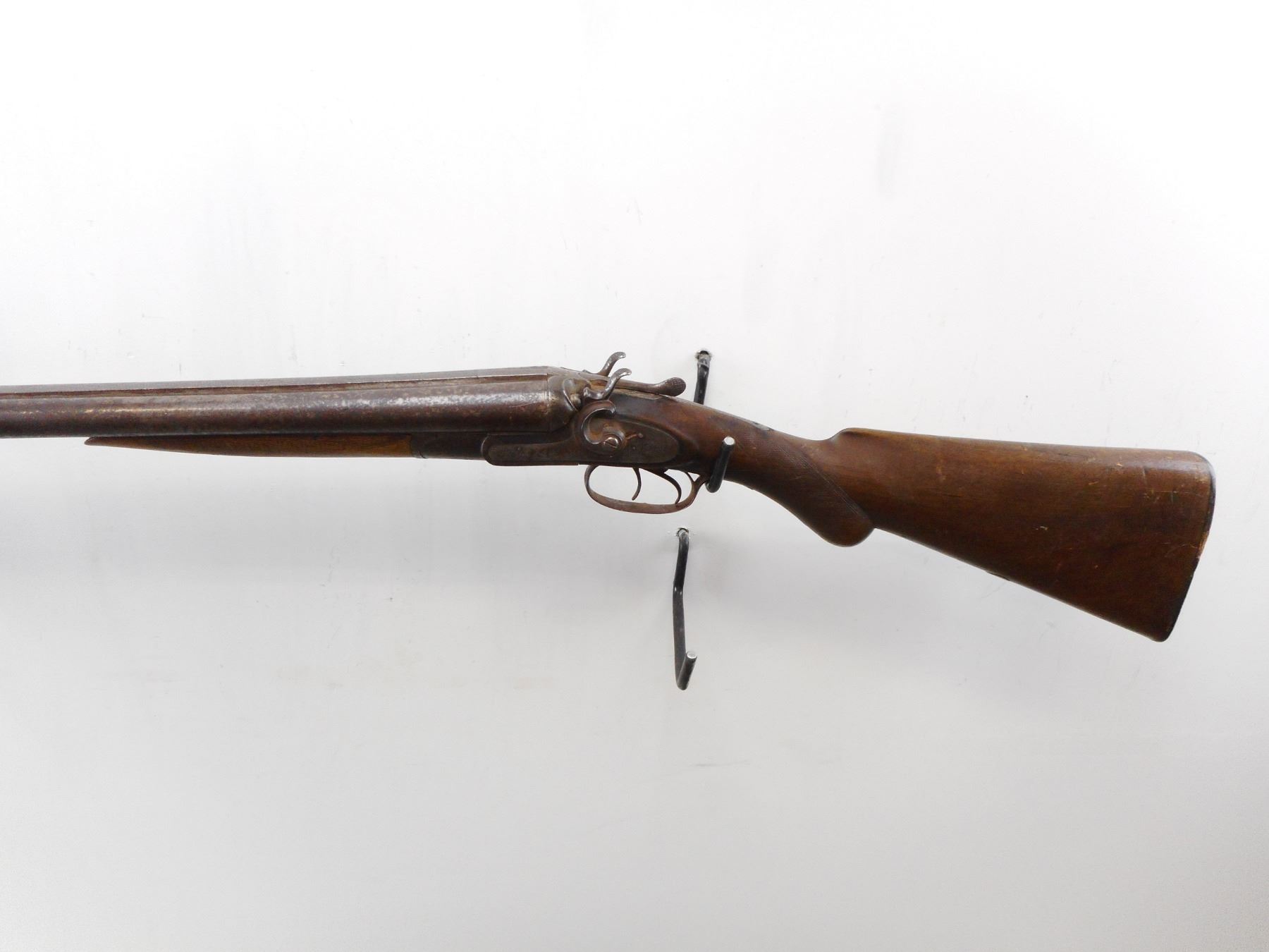 S HARRISON, MODEL: SIDE BY SIDE HAMMERGUN, CALIBER: 12GA 2 5/8, BORES FAIR, PITTED. BRASS BEAD, RAISED RIB, BARRELS LOOSE ON FACE WITH DENTS, SIDE LOCKS WITH HAMMERS, EXTRACTOR, DOUBLE TRIGGERS. TWO PIECE WOOD STOCKS, CHECKERED FOREARM AND PISTOL GRIP, CRACKED AND CHIPPED BUTT PLATE, FOREND MISSING INSERT. METAL FINISH LIGHT RUST OVERALL WITH DINGS AND SCRATCHES. STOCK CHIPPED, DINGS AND SCRATCHES, ACTION: HINGE SIDE BY SIDE - SHOTGUN, BARREL LENGTH: 30 1/4", CONDITION: 3/10, SERIAL # 83316, CLASS: CANADIAN NON RESTRICTED CLASS