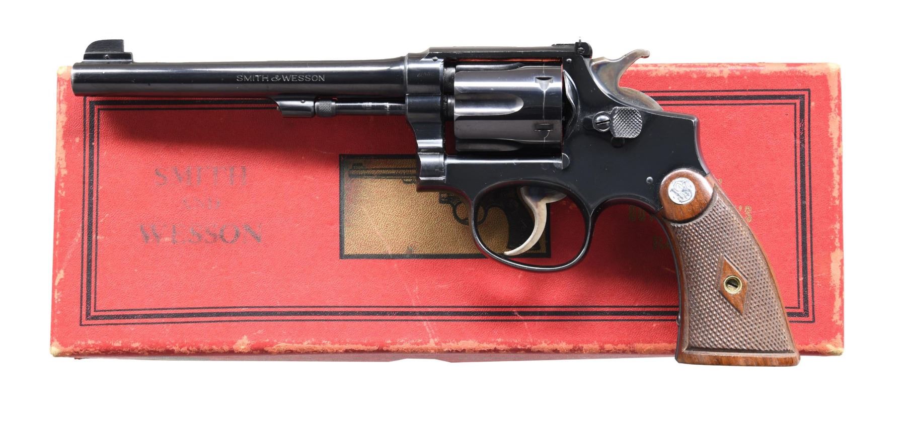 Cal. 22 LR. S# 676133. Bbl. 6" pinned w/ optional Patridge style front sight having silver Call bead & retained by single pin through base. Polished to frame pre Micrometer sm. screw adj. rear sight retained w/ only 1 screw. 1st model of K-22 mfg. 1931-1940; all w/in 600,000 S# (632124-682419) range of 38 M&P 1905 4th change (approx. 19,500 units). Diamond center checkered Circassian walnut grips w/ silver medallions w/out backers. Matching numbered bbl., cyl., grips & extractor. UNATTACHED ACCESSORIES: original red factory 2 piece box w/ matching # on bottom. 1 Long side of base appears to have top to bottom knife cut. Lid is very good w/ only light scuff marks on edges. No broken or weak corners. Extremely rare 7 ribbed knurled sight screwdriver specifically for this model having stepped blued shank on blade w/ narrow ground tip corresponding to sight screws. Near excellent appearance including nickel plating of handle. CONDITION: very good plus overall appearance w/ slight cyl. turn line, function wear on ejector rod, slight thinning at muzzle & occasional very light mark on high edges. Grips & bore along w/ case colors on trigger & hammer are all near excellent. Top collector quality example; missing paperwork. (21-3791/NW). CURIO. $1,700-2,500.