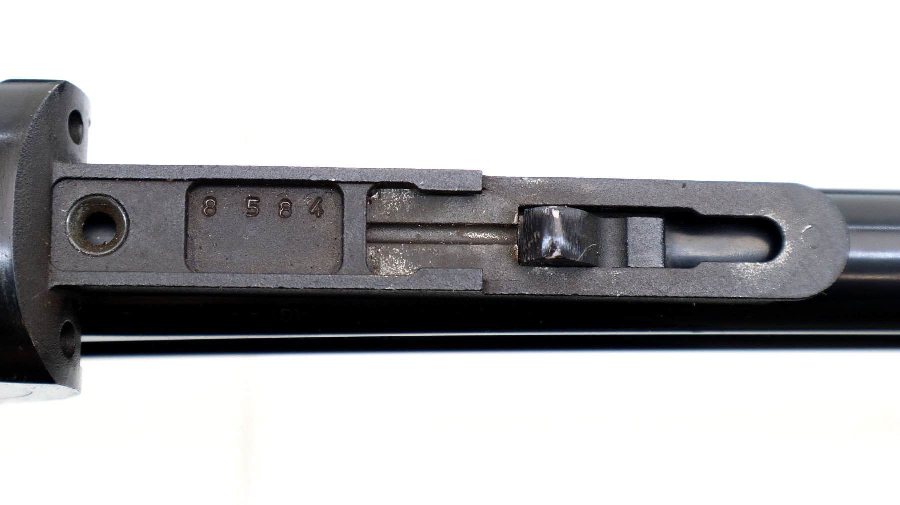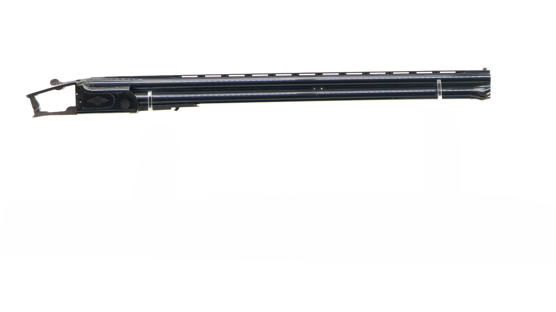 Main Description: Red fiber optic front bead, blued finish, vent rib, engraved receiver. Includes opening lever and forearm hanger, missing all other parts, stocks and associated parts.