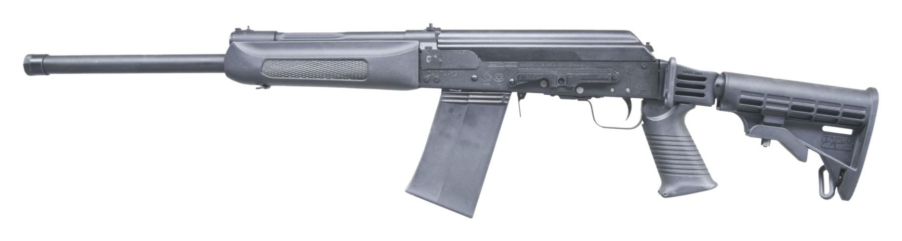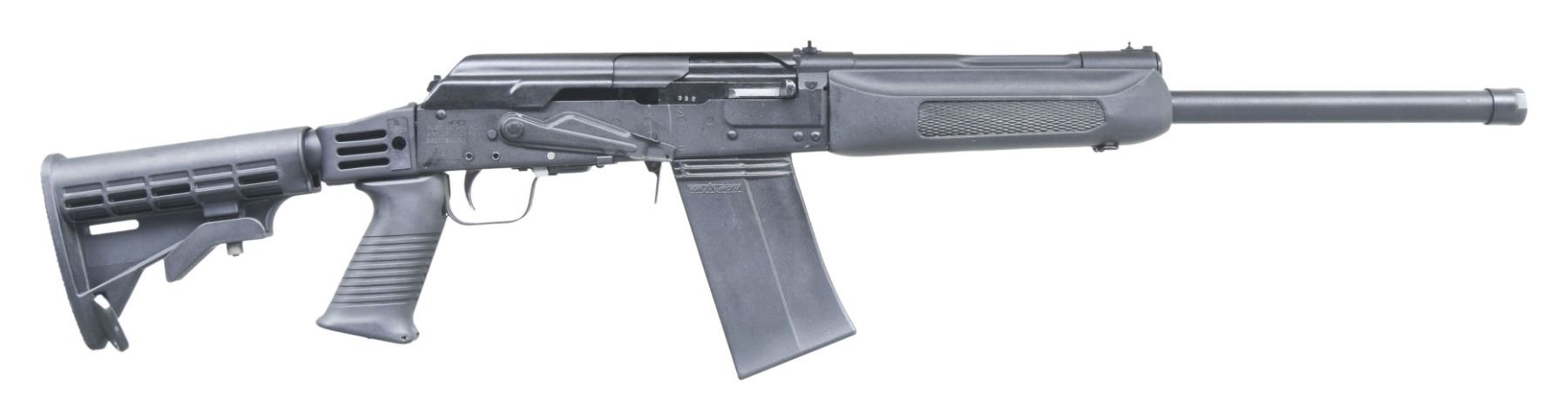 Cal. 12 Ga. 3". S# H08427005. Bbl. 19". Bead front sight. U-notch rear sight. Izhmash made AK style shotgun. Right side of receiver has Russian American Armory Company import marking. Black phosphate finish. Tapco M4 collapsible stock. Standard Saiga 12 handguard. MAGS: 1-5 rd. factory. UNATTACHED ACCESSORIES: black tactical softcase. CONDITION: furniture shows scattered light handling wear. Metal retains 93-95% black phosphate with scattered handling marks, light operational & edge wear. Action functions properly when hand cycled. Bright near excellent bore. (25-2576/MJC). MODERN. $600-1000.