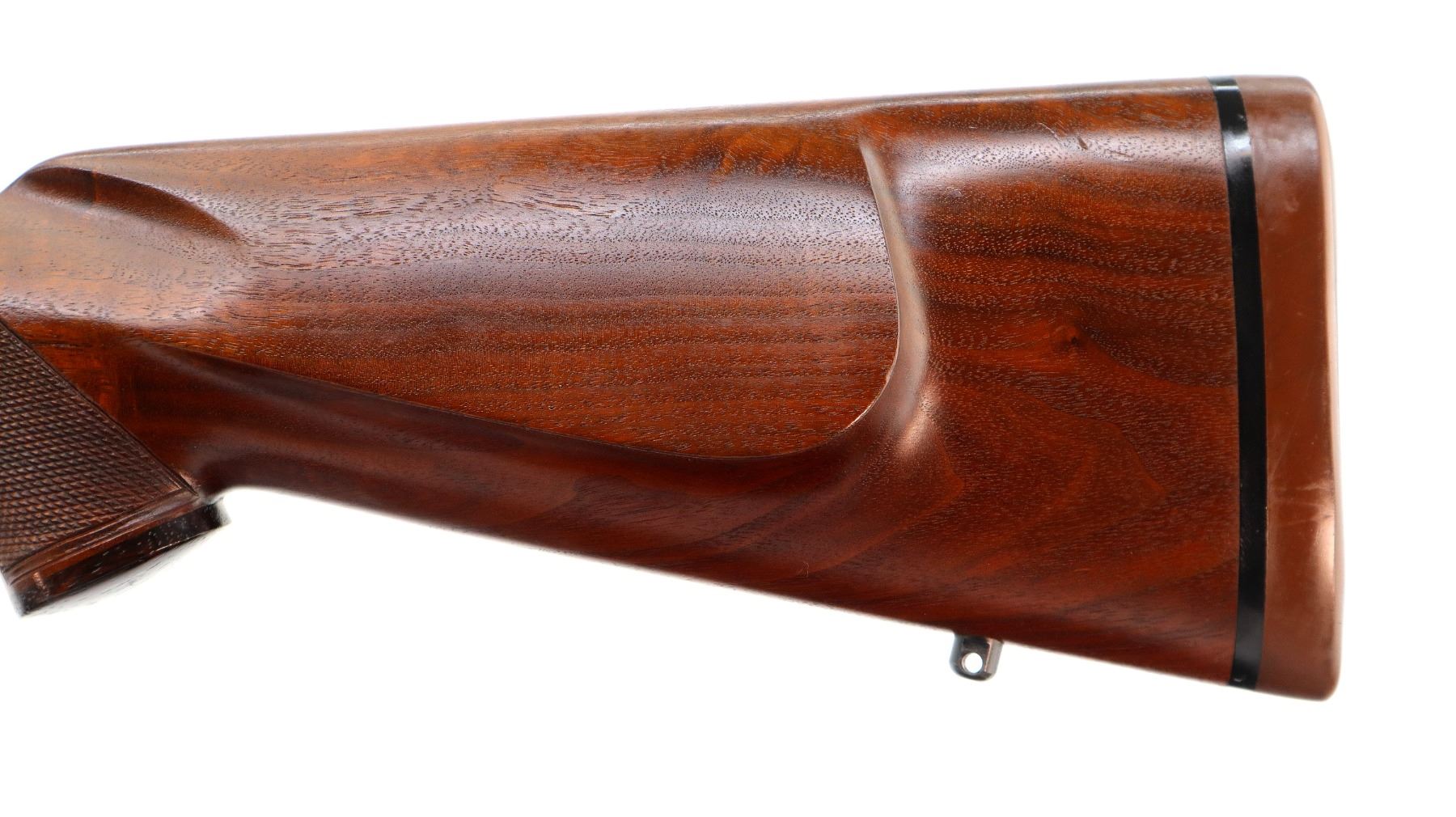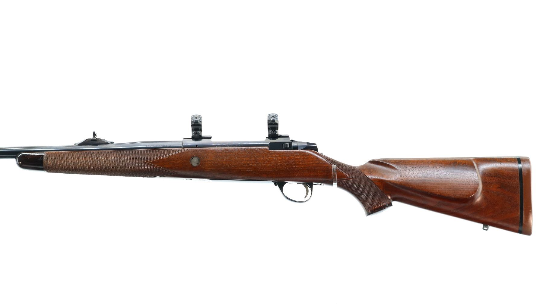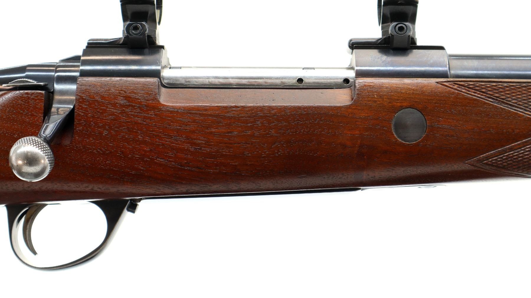 Main Description: Blade front sight with ramp, adjustable folding u notched rear sight, polish blued finish, receiver has integral scope bases with Millet 1" rings installed, checkered bolt knob. One piece wood stock, Rosewood forend and pistol grip caps, checkered forearm and pistol grip, cheek rest, brown rubber recoil pad, 14" LOP, hinged floor plate, swivel studs.