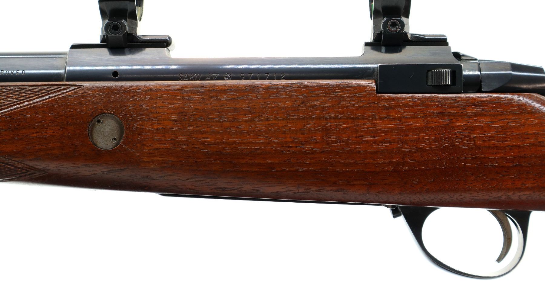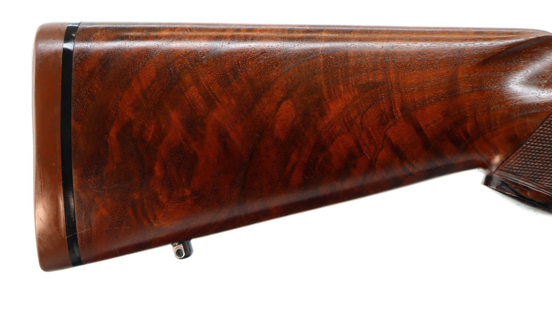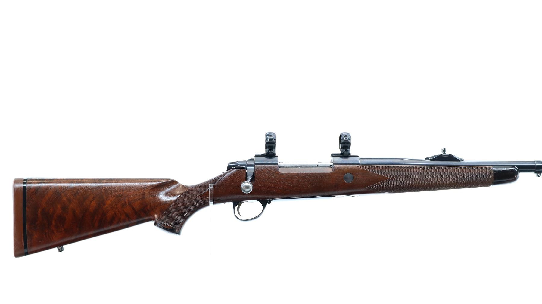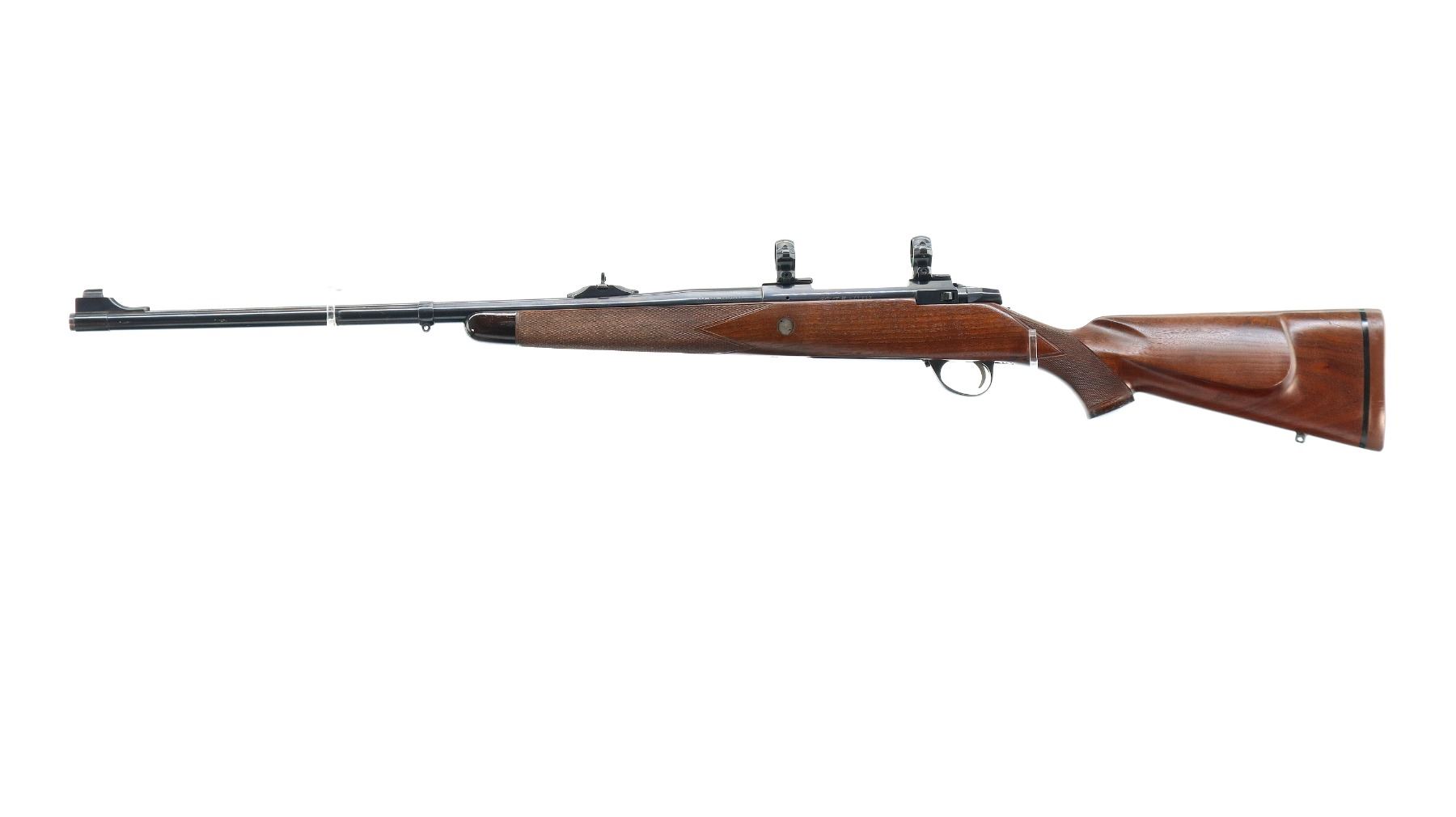 Main Description: Blade front sight with ramp, adjustable folding u notched rear sight, polish blued finish, receiver has integral scope bases with Millet 1" rings installed, checkered bolt knob. One piece wood stock, Rosewood forend and pistol grip caps, checkered forearm and pistol grip, cheek rest, brown rubber recoil pad, 14" LOP, hinged floor plate, swivel studs.