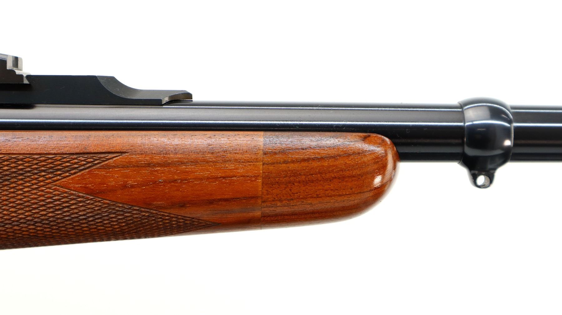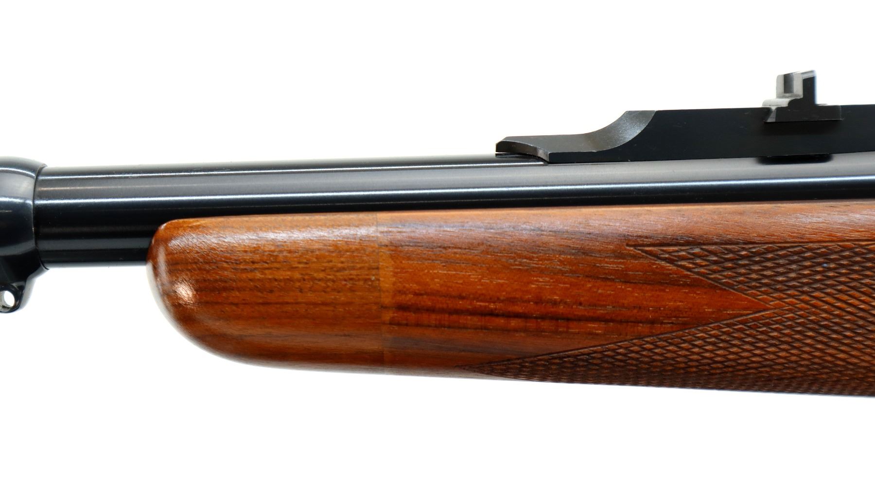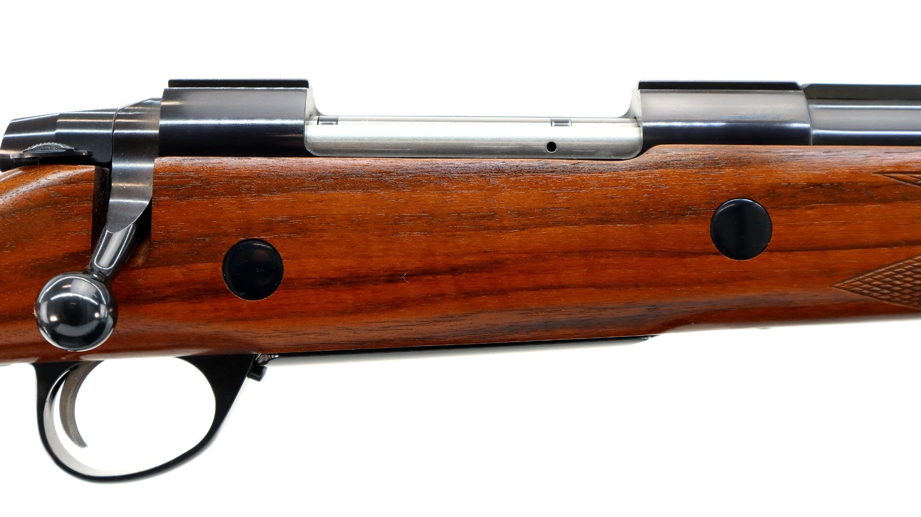 Main Description: Blade front sight with hood and ramp, adjustable u notched rear sight with flat rib, polish blued finish, tapered round barrel, receiver has integral scope bases, smooth bolt knob. One piece Satin finish wood stock, wood forend tip, checkered forearm and pistol grip, cheek rest, red rubber recoil pad, LOP 13.75", grip cap, steel hinged floor plate and trigger guard, swivel studs.