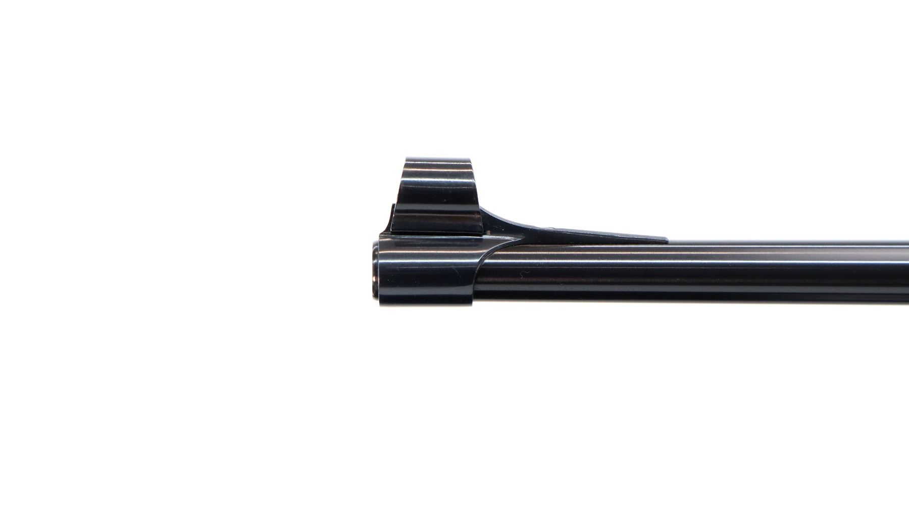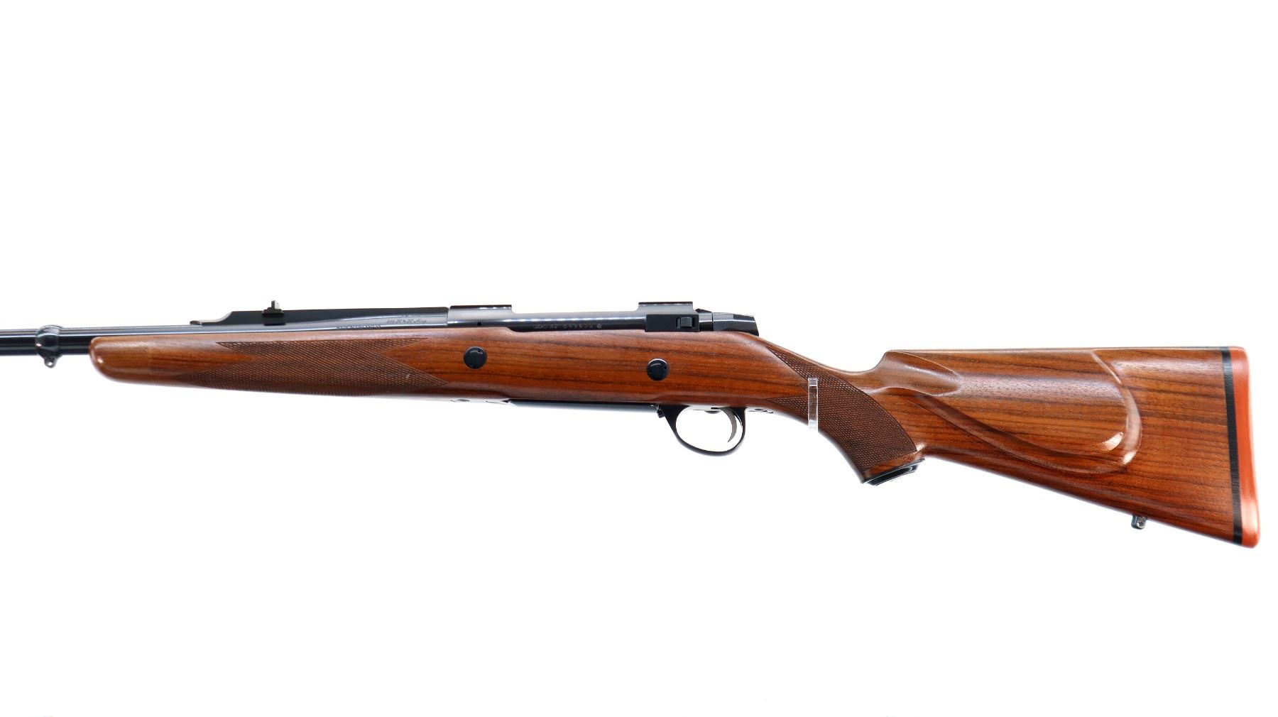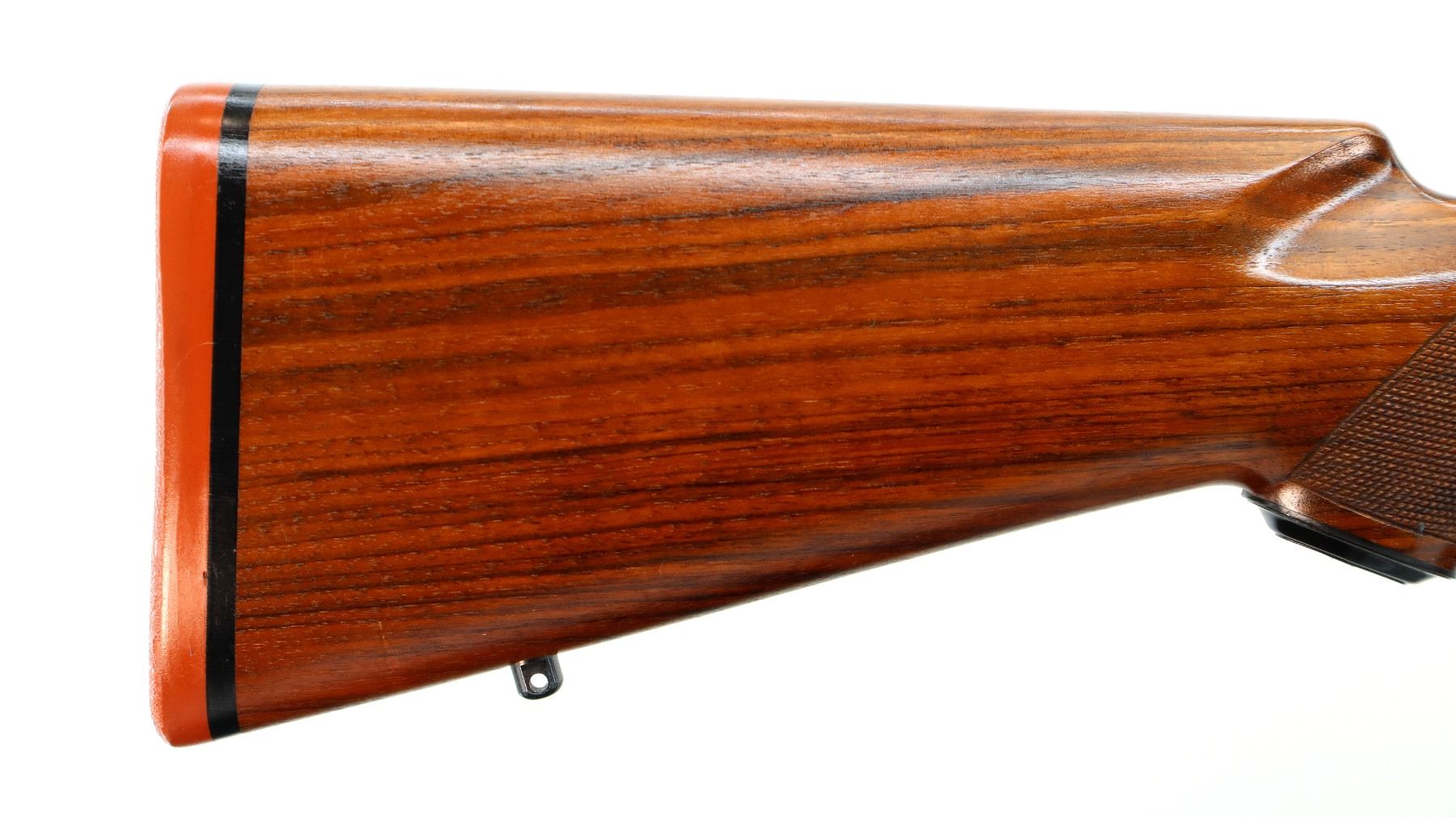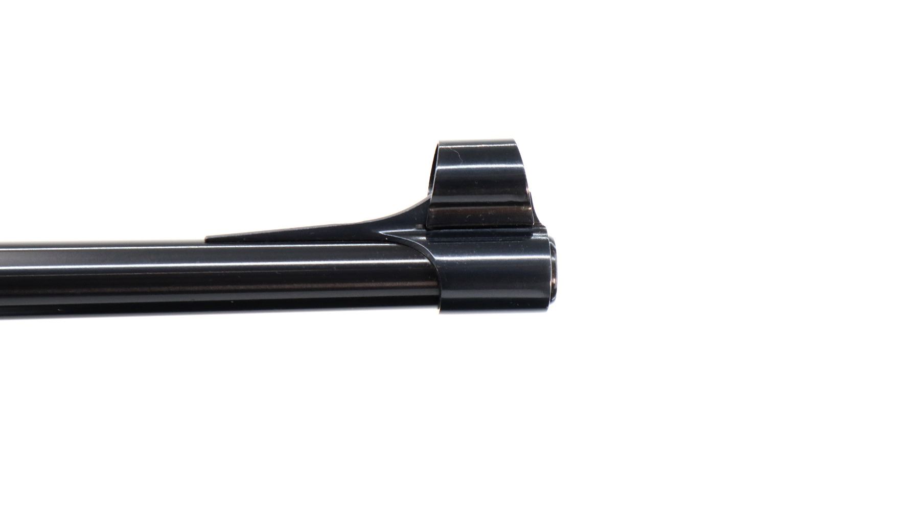 Main Description: Blade front sight with hood and ramp, adjustable u notched rear sight with flat rib, polish blued finish, tapered round barrel, receiver has integral scope bases, smooth bolt knob. One piece Satin finish wood stock, wood forend tip, checkered forearm and pistol grip, cheek rest, red rubber recoil pad, LOP 13.75", grip cap, steel hinged floor plate and trigger guard, swivel studs.