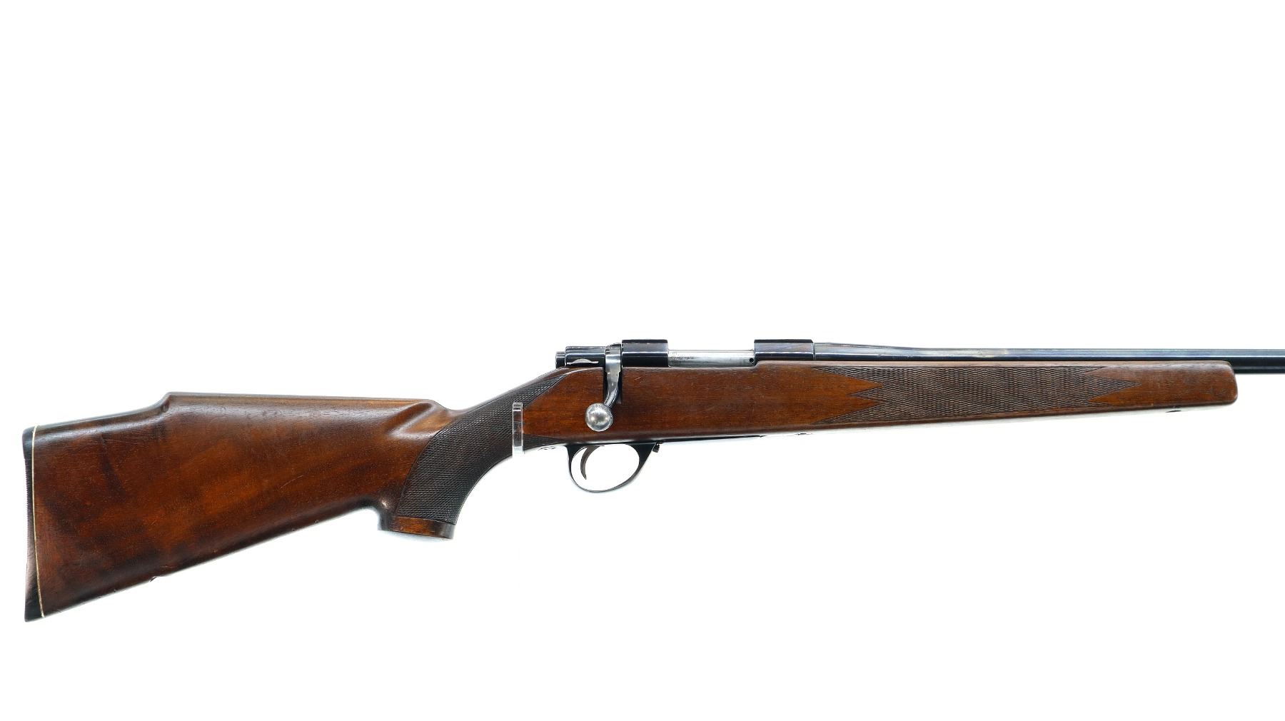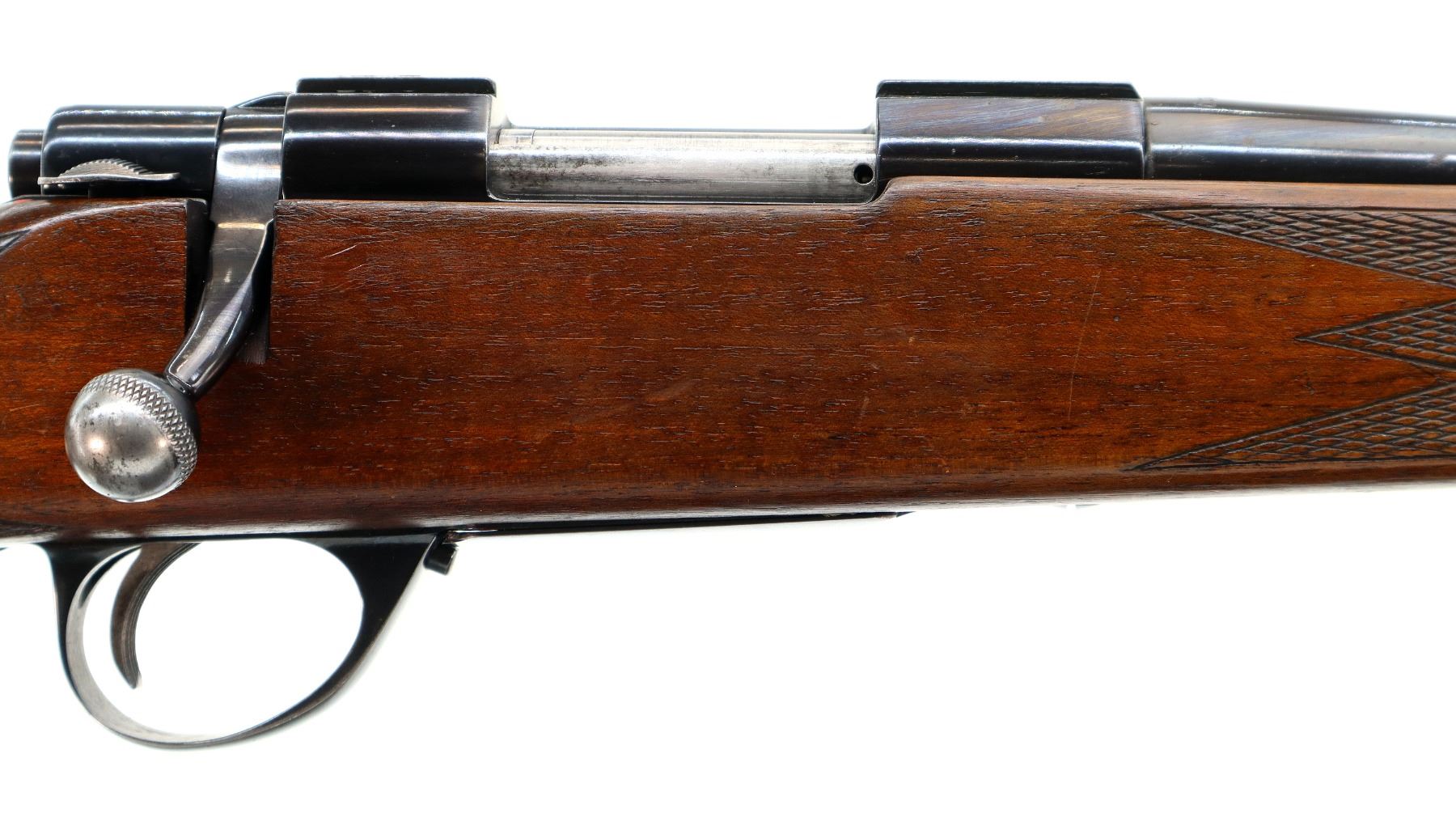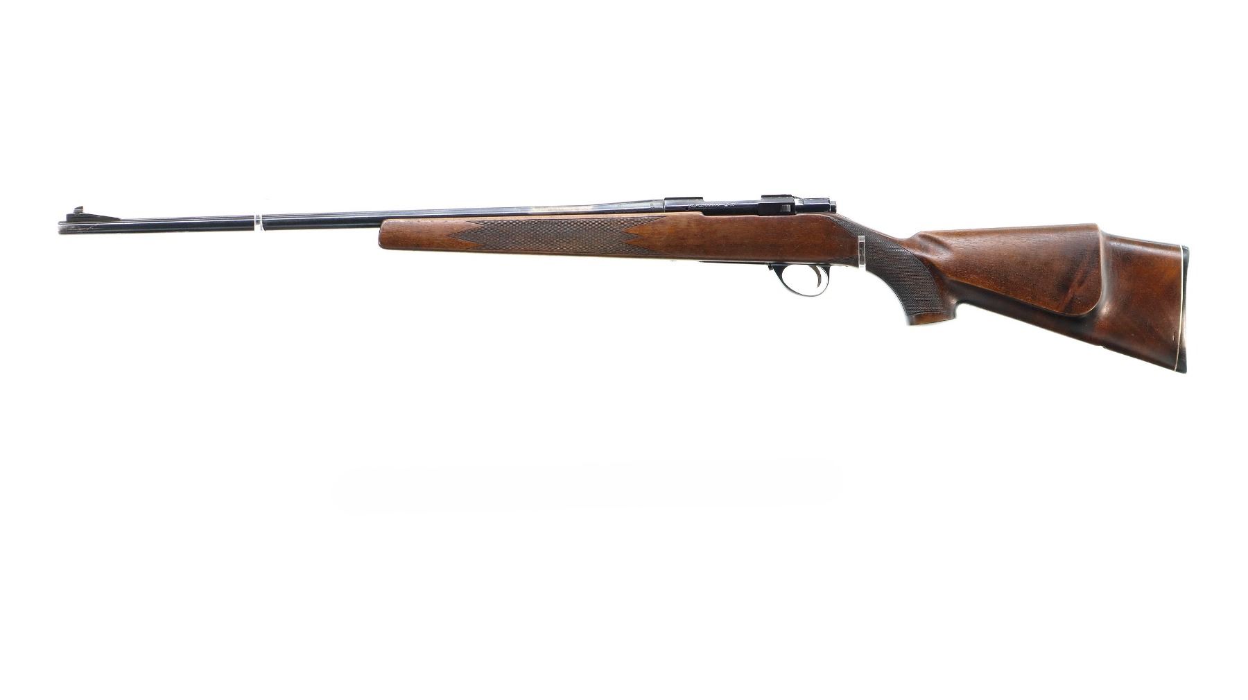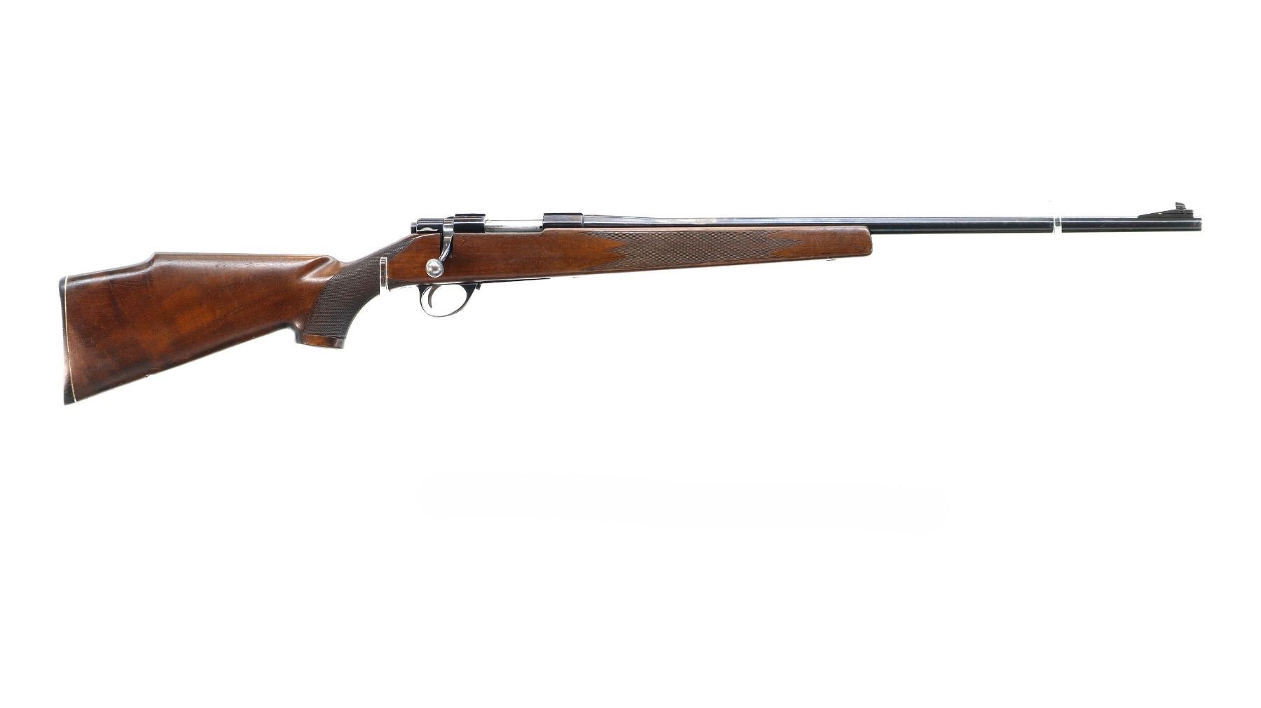 Main Description: Blade front sight with ramp, missing complete rear sight, blued finish, receiver has integral scope bases, checkered bolt knob. One piece wood stock, checkered forearm and pistol grip, cheek rest, grooved black polymer butt plate, hinged floor plate, missing swivels holes are present.