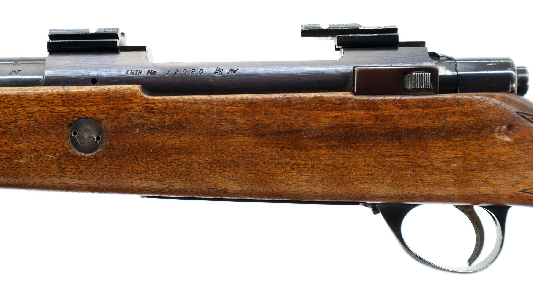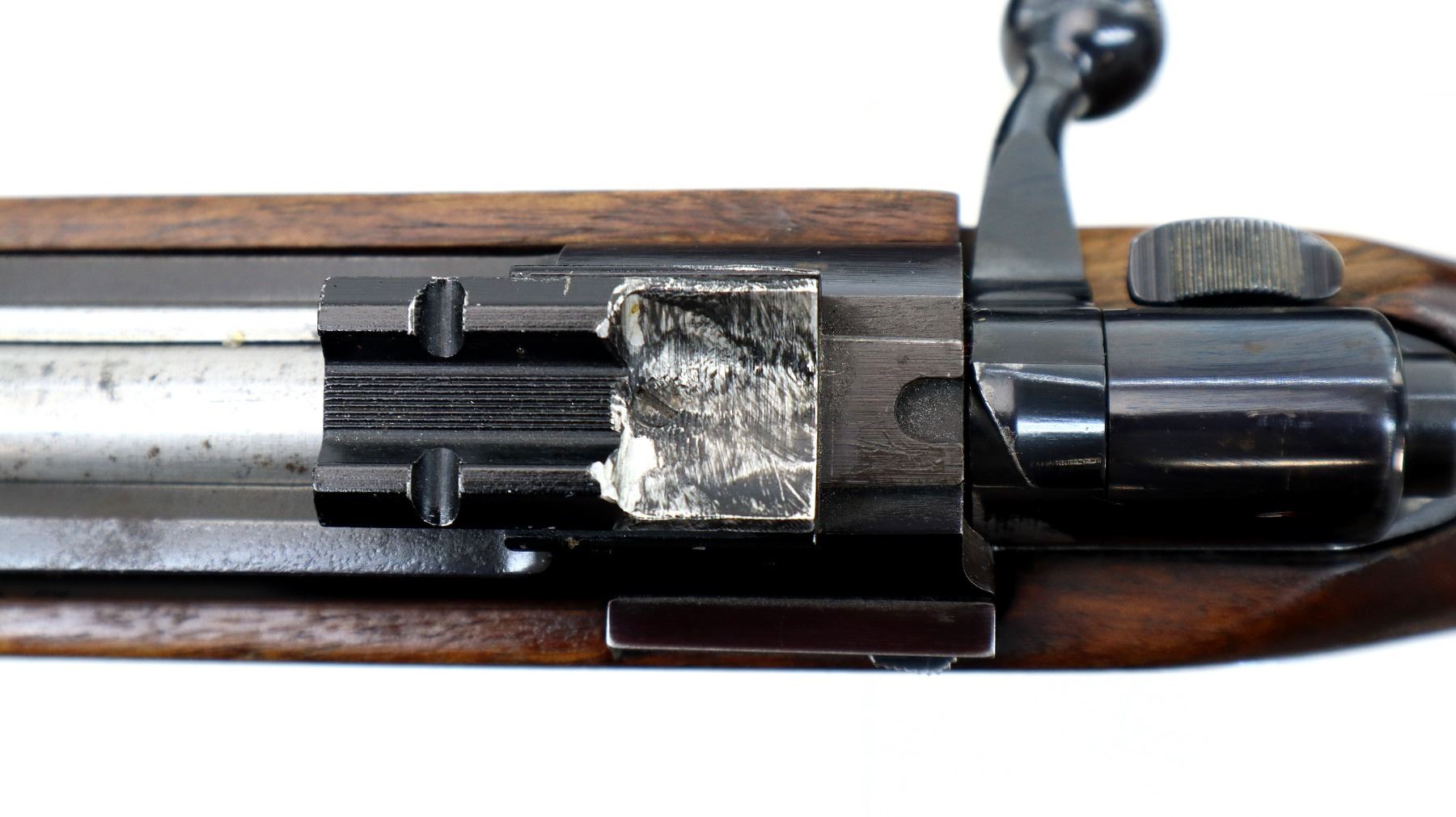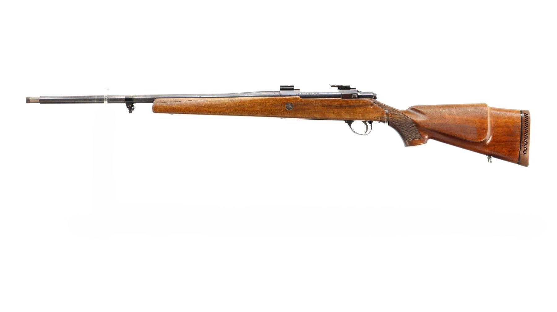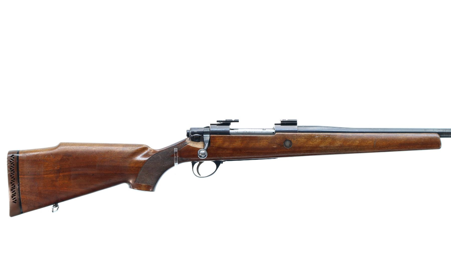 Main Description: Missing front and rear sights, blued finish, rebated threaded muzzle with no cap, receiver has integral scope bases with two piece alloy ones installed, checkered bolt knob, missing bolt stop spring trigger is seized requires adjustment parts or repair. One piece wood stock, forend cracked on left side, checkered pistol grip, stock modified and cracked on right side below receiver, cheek rest, brown rubber recoil pad, hinged floor plate, has sling swivels, hole in front of forearm.