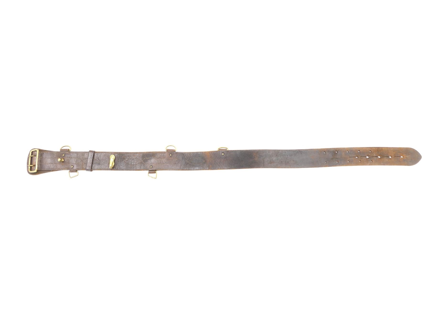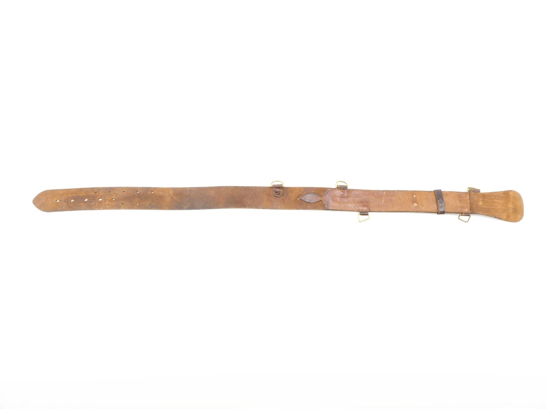 (1) BROWN LEATHER BELT, NO SHOULDER STRAP, VARIOUS BRASS FITTINGS, NO VISIBLE MARKINGS, SHOWS AGE / WEAR, OVERALL LENGTH APPROX. 44.75", ADJUSTABLE. SEE PHOTOS.